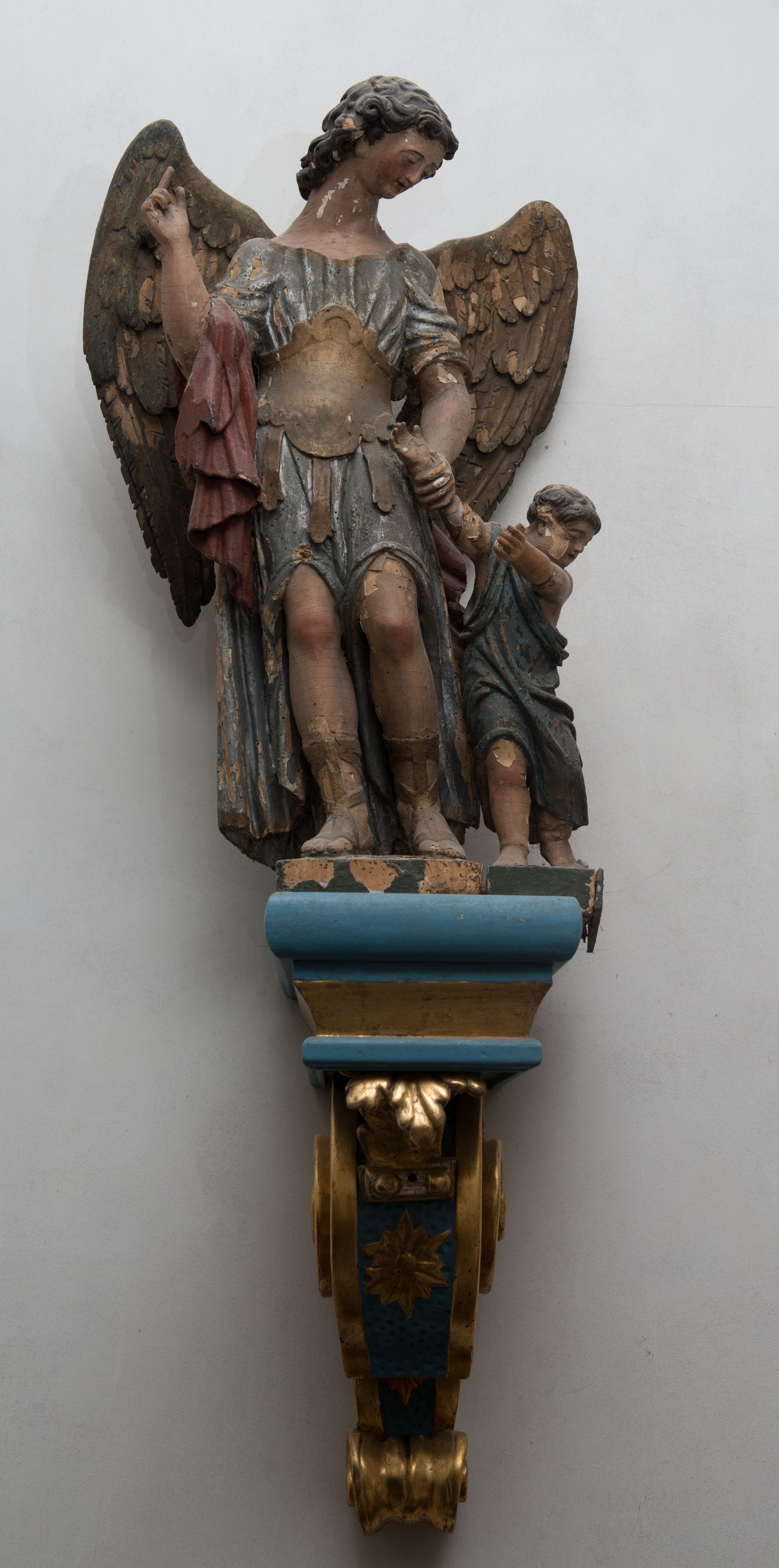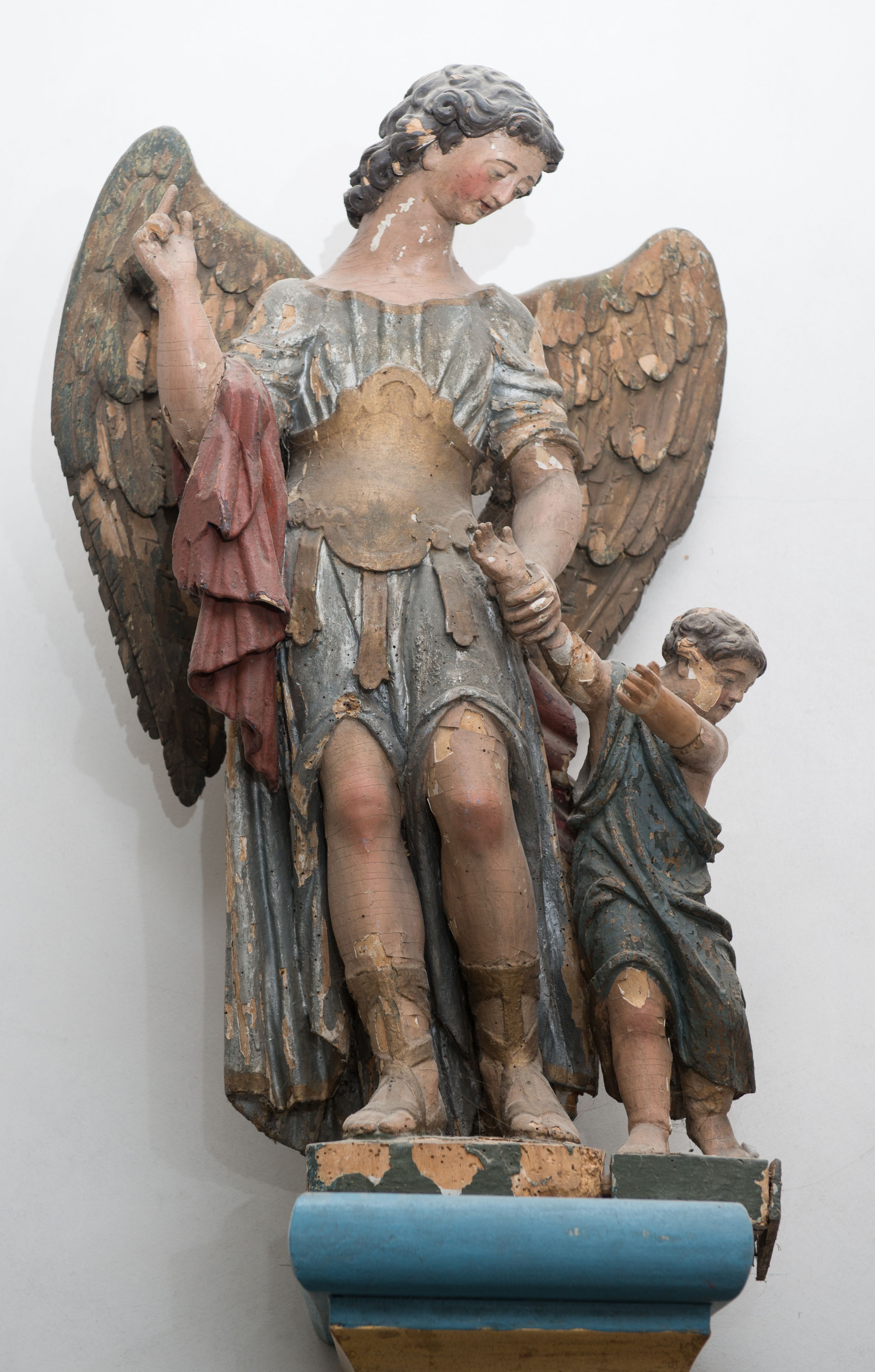 Figury anioła i dziecka ustawione są na niskich, osobnych podstawach. Anioł zwrócony jest frontalnie, z pochyloną głową skierowaną w lewo, w kontrapoście. Prawą rękę unosi w geście wskazującym, lewą trzyma za rączkę stojącego po jego lewej stronie chłopca. Twarz ma owalną, o niewielkich oczach skierowanych w dół, małym nosie i ustach, okoloną krótkimi, kręconymi włosami. Ma niewielką głowę osadzoną na długiej szyi. Ubrany jest w niebieską tunikę ze złoconymi lamówkami, z krótkimi rękawami, odsłaniającą nogi powyżej kolan. Wokół talii ma pancerz z trzema piórami, na prawym ramieniu ma zawieszony czerwony płaszcz, na nogach sandały. Skrzydła ma duże, złożone po bokach postaci. Po lewej stronie anioła stoi chłopiec zwrócony w trzech czwartych w lewo, w wykroku, z uniesionymi obiema rękami. Twarz ma owalną o niewielkich oczach skierowanych w dół, małym nosie i ustach, okoloną krótkimi włosami. Ubrany jest w zieloną szatę przewiązaną przez prawe ramię, sięgającą kolan. Polichromia ciała figur naturalistyczna.
