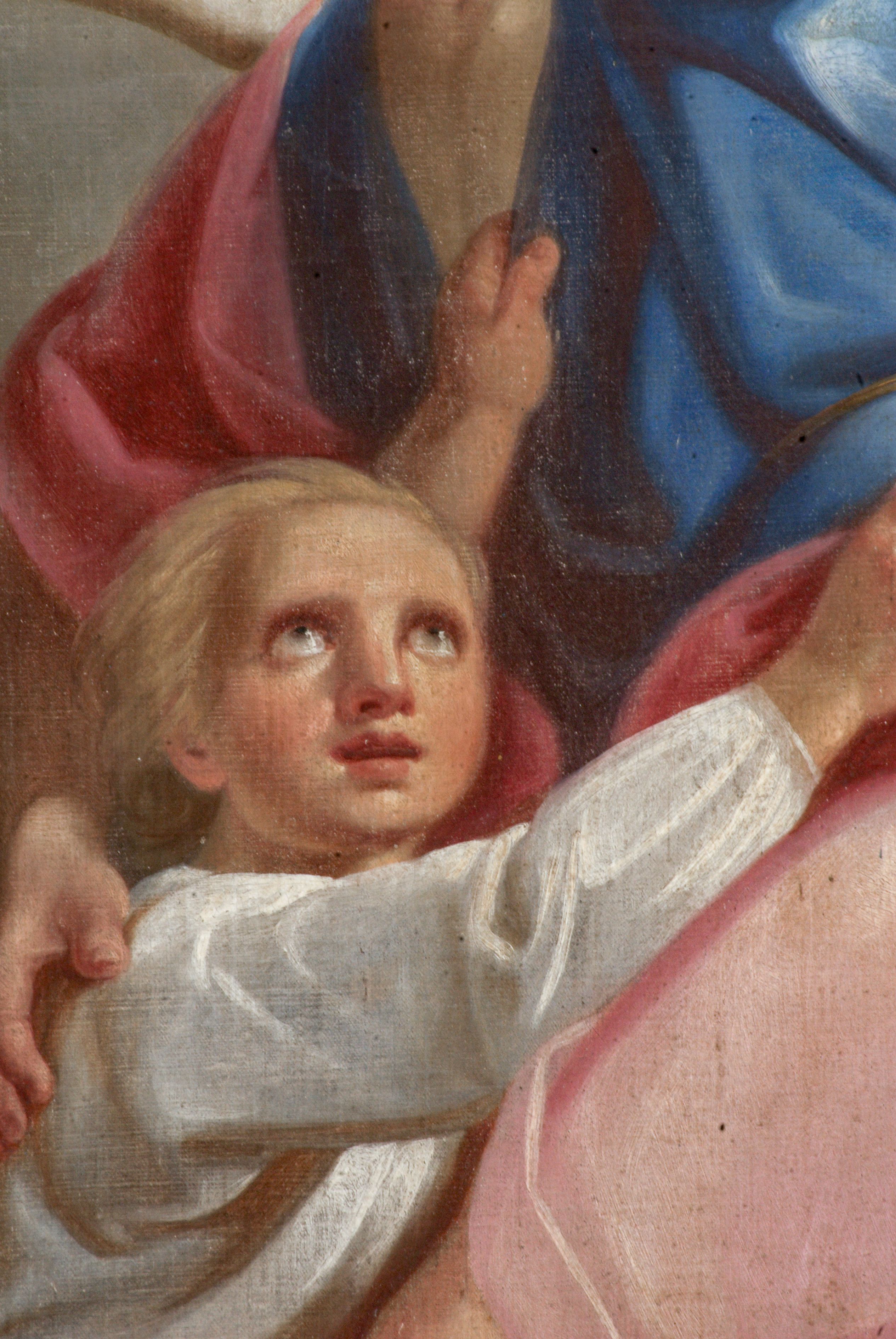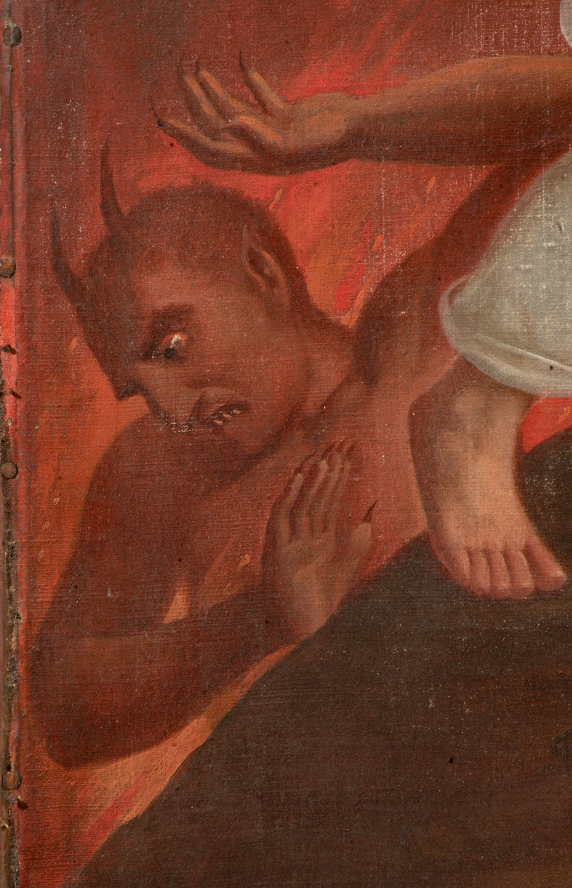 Dobry, obecnie pozbawiony ramy i wymontowany z ołtarza, widoczna dziura w płótnie w dolnej części kompozycji.
