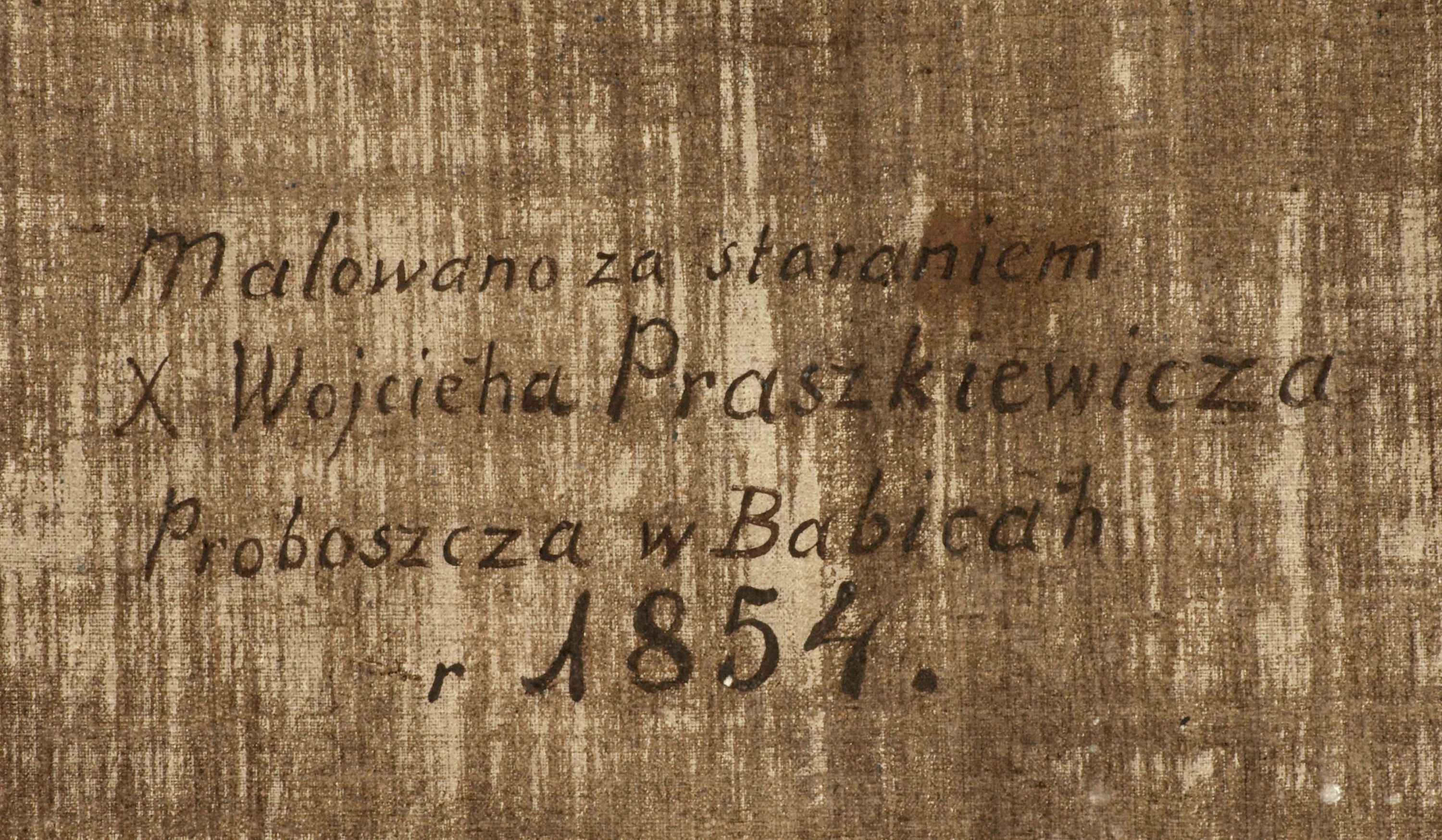 Z tyłu napis „Malowane za staraniem / x(ędza) Wojciecha Praszkiewicza / Proboszcza w Babicach 1854 r[oku]”.