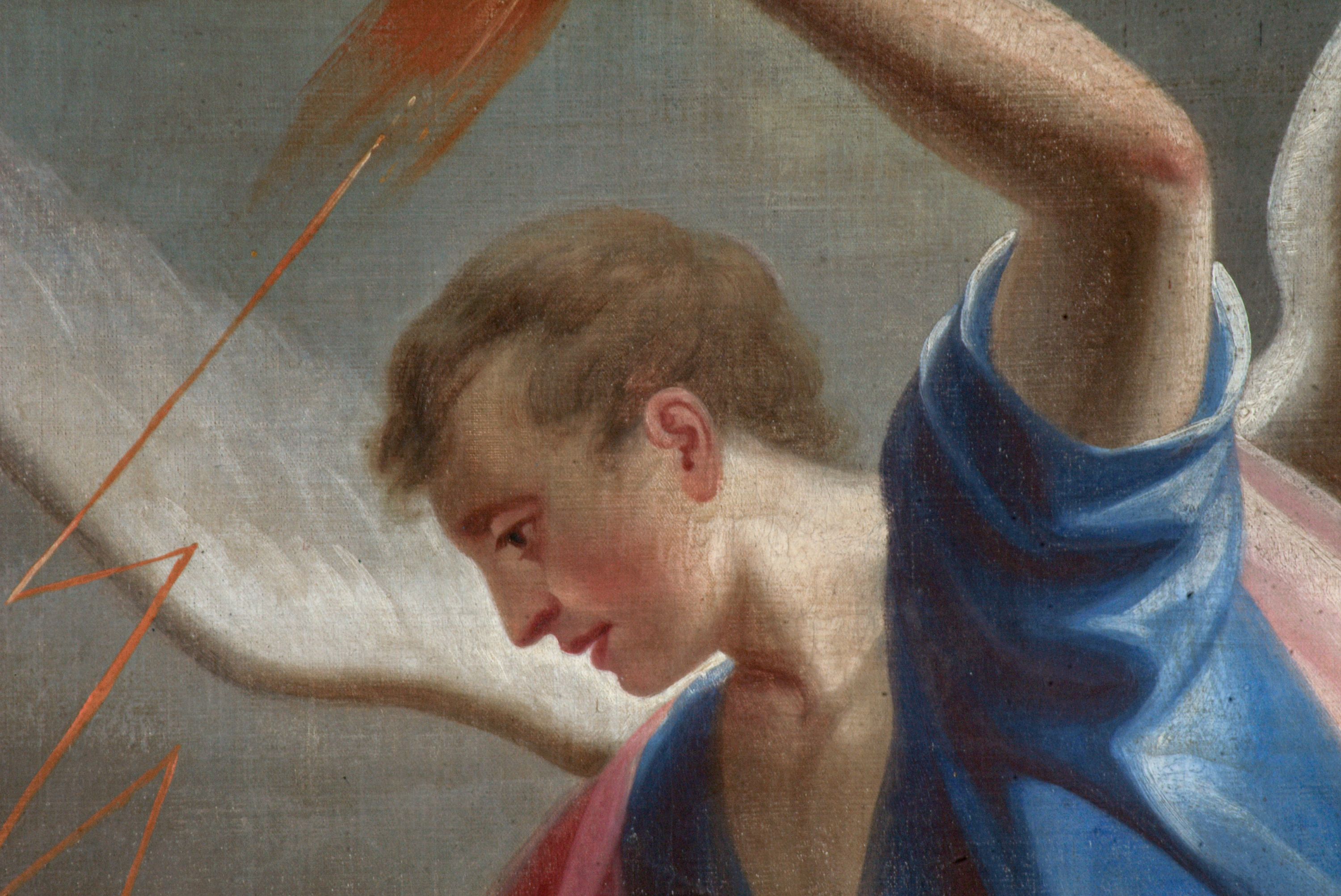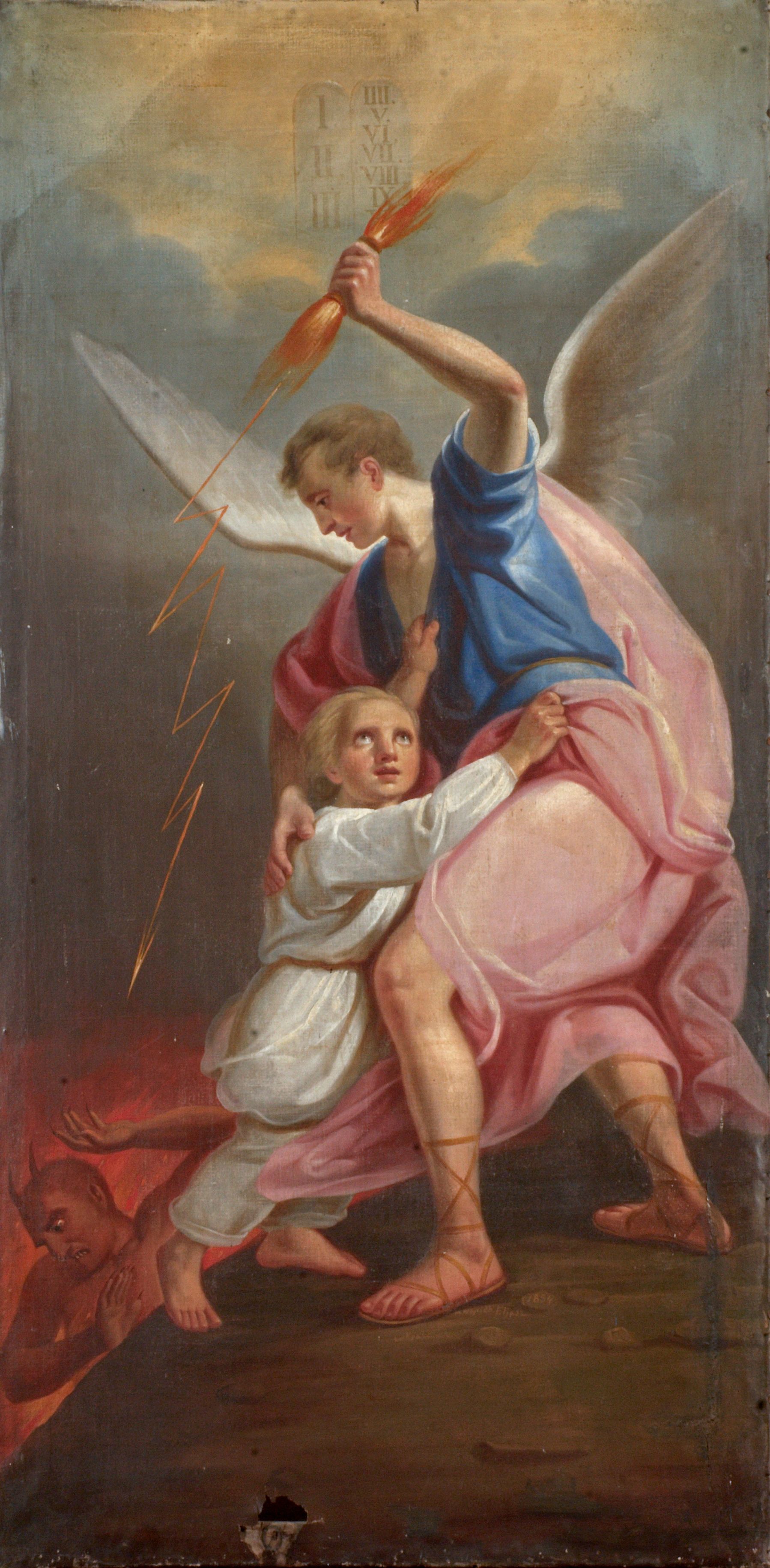 Obraz w kształcie stojącego prostokąta. Scena figuralna, dymaniczna. Prawą część obrazu zajmuje postać zwróconego niemal profilem w prawo Anioła Stróża w wydatnym wykroku i o pochylonej sylwetce. Prawą ręką przygarnia do siebie dziecko, lewą, wzniesioną, ciska piorunem. Przedstawiony, jako młody, atletycznie zbudowany młodzieniec, z twarzą ukazaną z profilu, włosy krótkie, mocny kark. Ubrany w niebieską, przepasaną sznurem, szatę z krótkimi rękawami oraz obfity jasno-różowy, bogato sfałdowany płaszcz, na stopach ma sandały wiązane rzemieniami. Z tyłu biało-szare skrzydła. Stojące na skraju przepaści, wtulone w anioła dziecko wyciąga ku niemu obie ręce. Okrągłą twarz charakteryzują dziecięce rysy oraz wzniesione ku niebu oczy. Ubrane jest w białe spodnie i tunikę sięgającą kolan przewiązaną w pasie sznurem, stopy bose. W lewym, dolnym rogu kompozycji, w przepaści wypełnionej ogniem ukazany w półpostaci diabeł. Głowę z rogami odwraca od anioła i osłania się rękami. Oczy duże, wyłupiaste, wystające zęby, duży, zakrzywiony nos; dłonie zaopatrzone w pazury. Ziemia, na której stoją postaci ciemno-brązowa, tło stanowią szaro-błękitno-żółte obłoki. Nad postacią anioła tablice Mojżeszowe. Kolorystyka obrazu jasna, pastelowa, stonowana. Modelunek bardzo miękki. Pod lewą stopą anioła trudna do odczytania sygnatura „Wojciech Eliasz 1854".