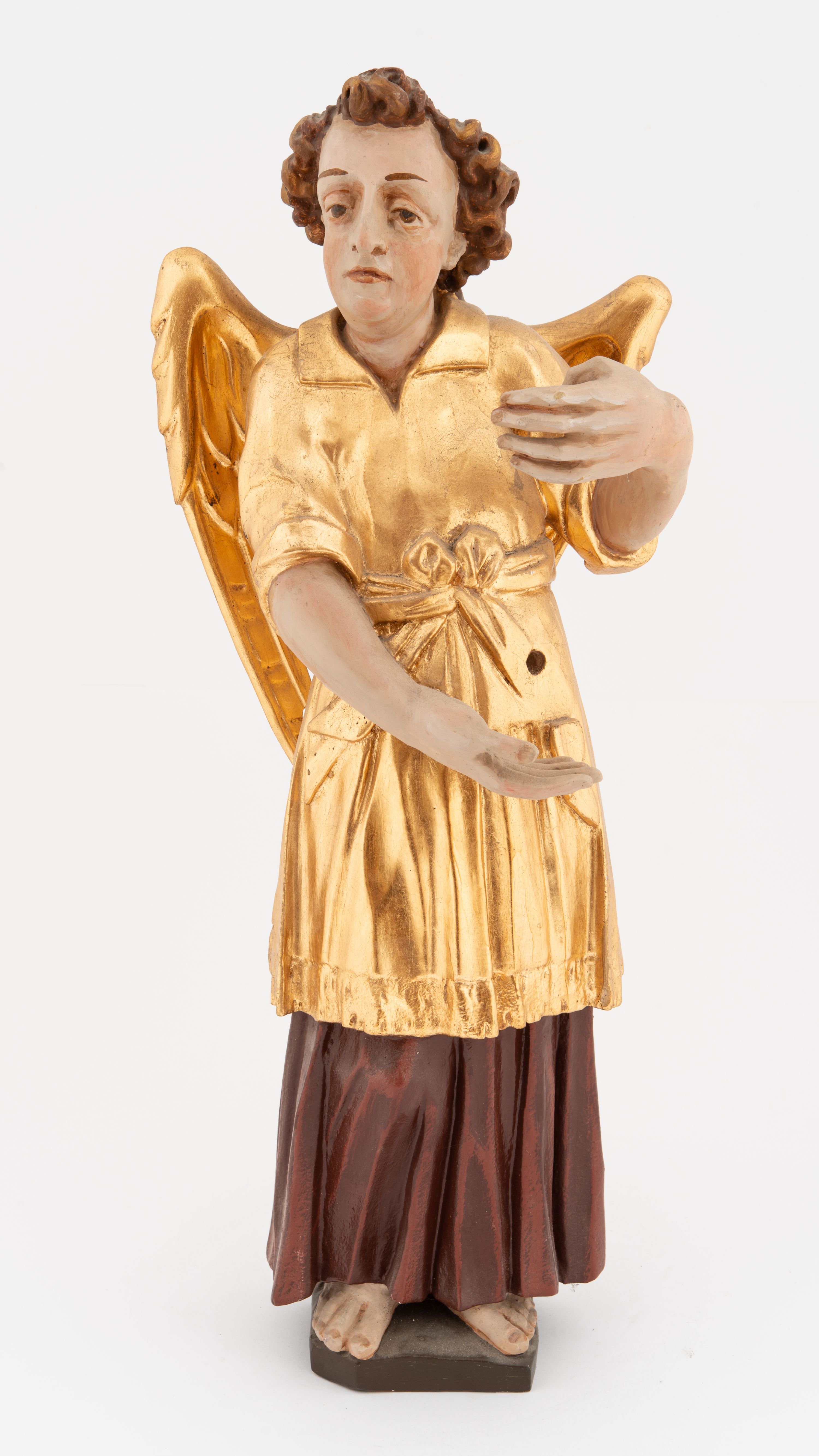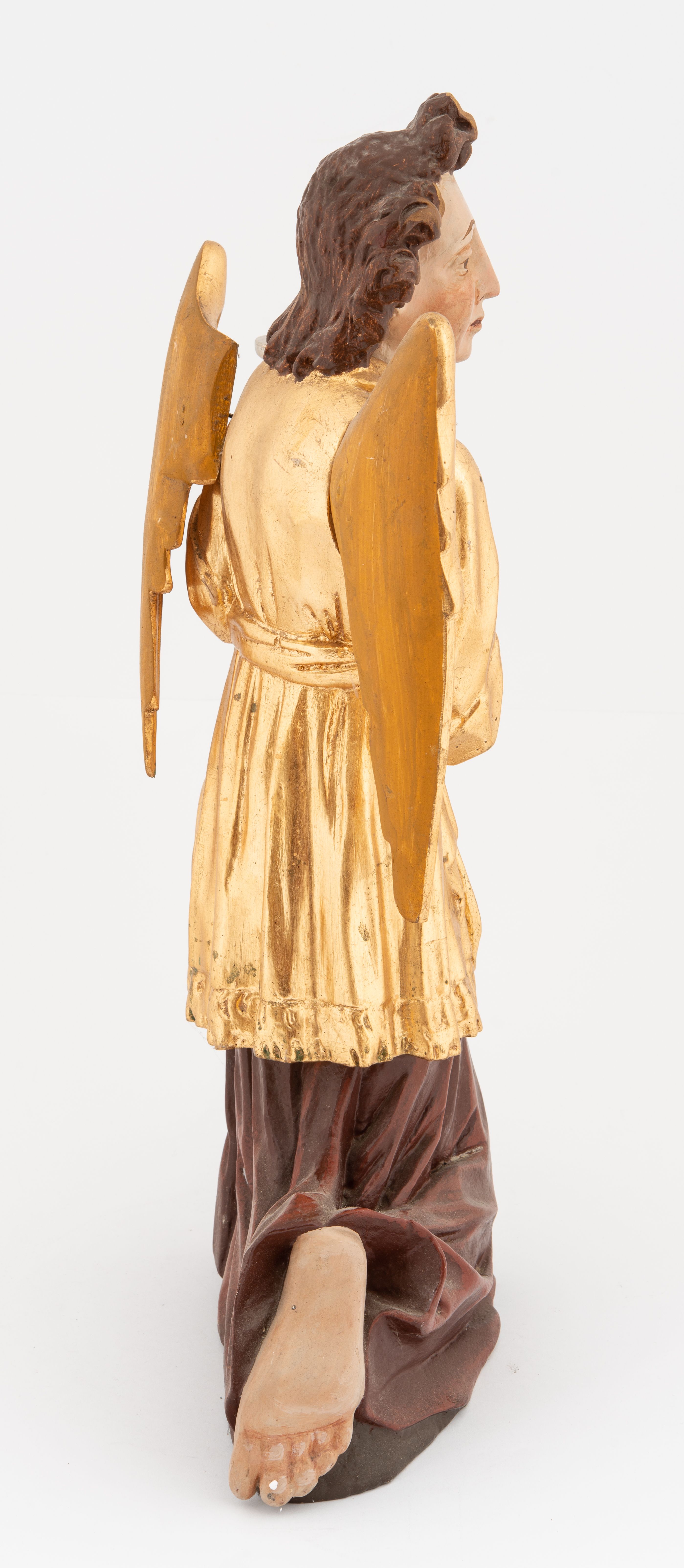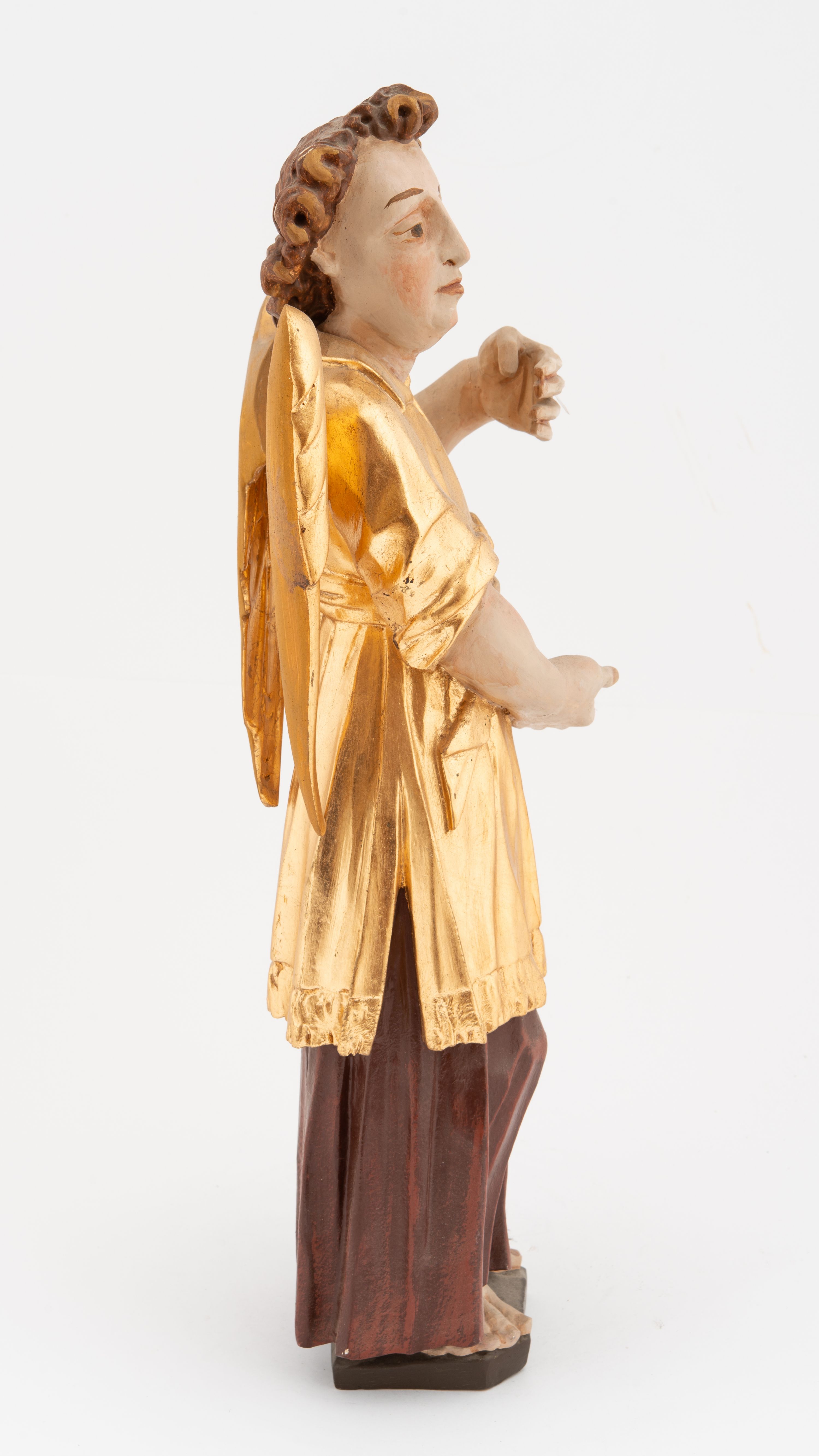 Figura pełnoplastyczna, ustawiona na niskiej podstawie. Postać ukazana frontalnie, z głową skierowaną w prawo, w kontrapoście, z obiema rękami uniesionymi z przodu, jedną wysoko, drugą nisko. Twarz ma podłużną, z drugim podbródkiem, o dużych, migdałowatych i opadających oczach, wąskim nosie i ustach, okoloną krótkimi, kręconymi włosami, układającymi się w czub nad czołem. Anioł ubrany jest w ciemnoczerwoną suknię spodnią i złoconą suknię wierzchnią, sięgającą kolan, z podwiniętymi rękawami, przepasaną w talii szarfą. Skrzydła ma złocone, złożone na plecach. Polichromia ciała naturalistyczna.