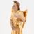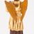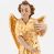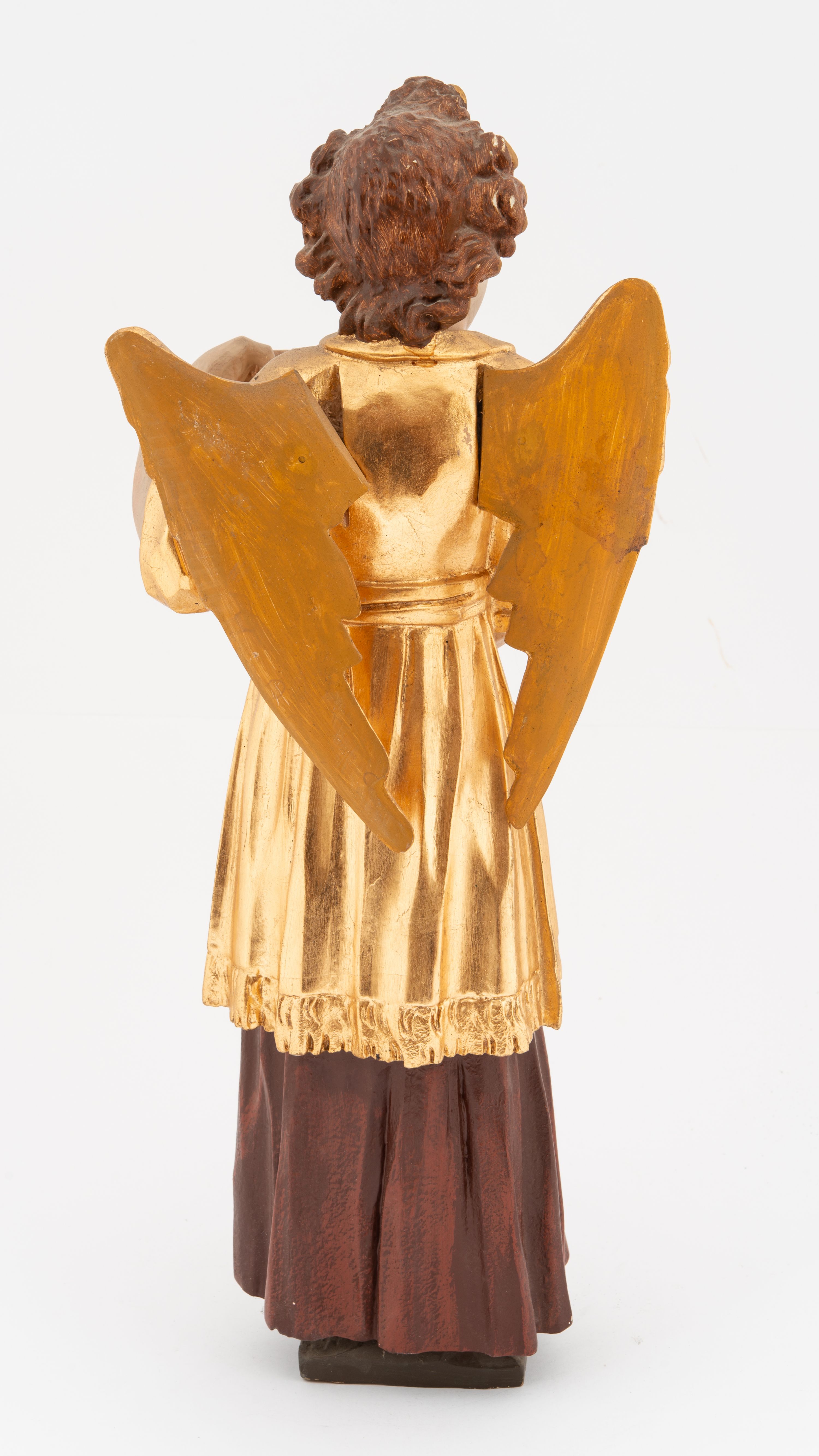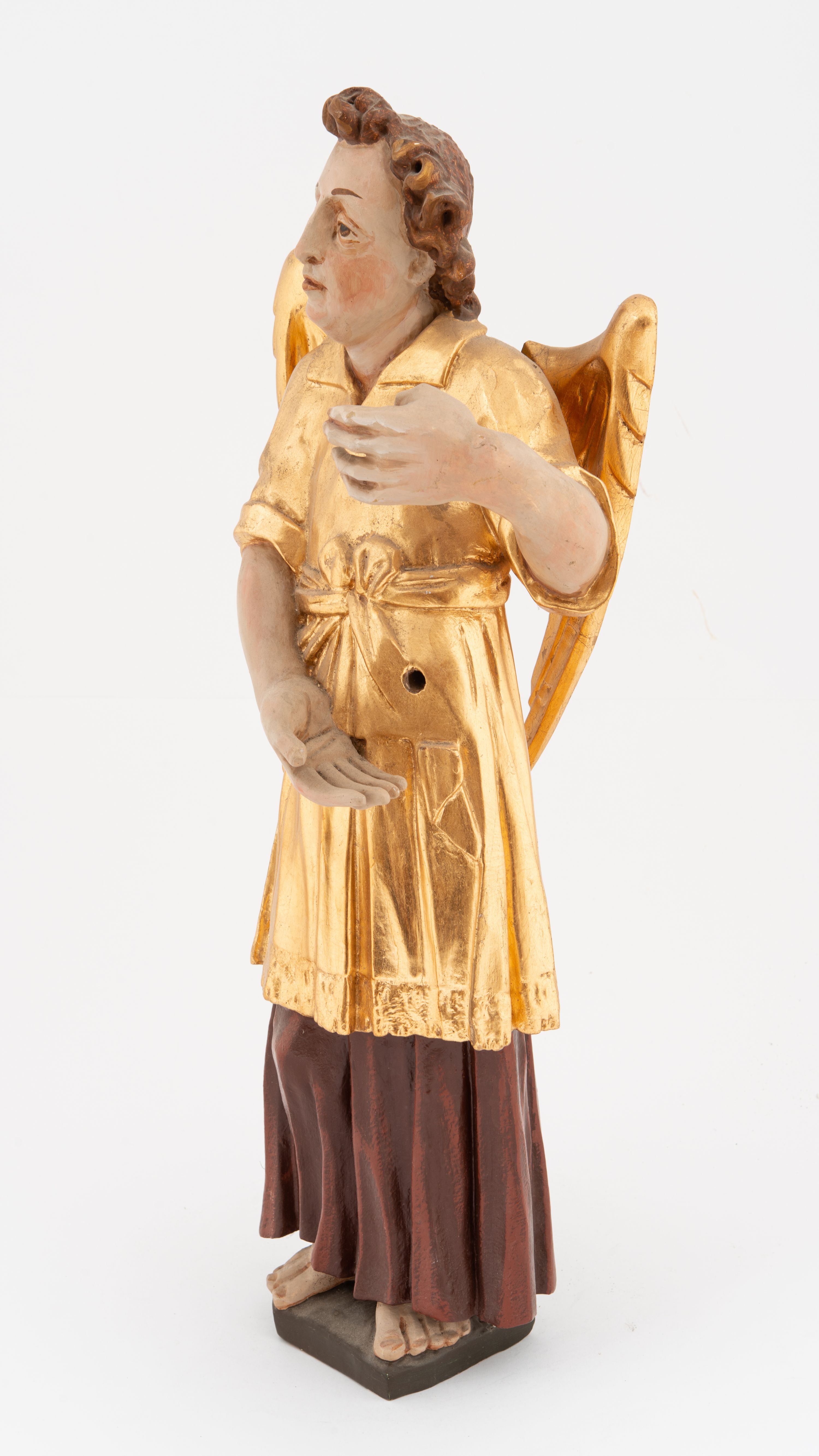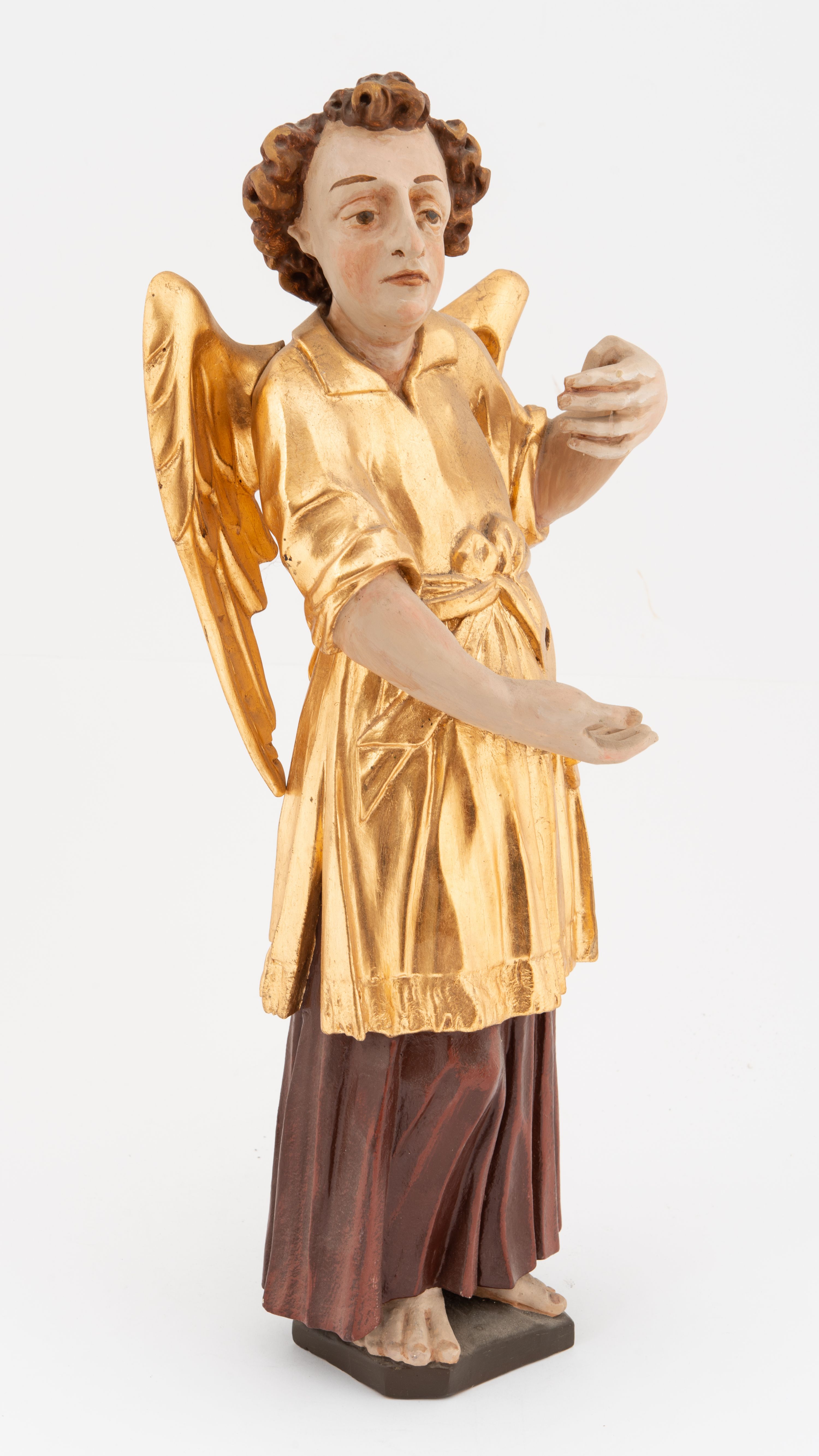 Figura pełnoplastyczna, ustawiona na niskiej podstawie. Postać ukazana frontalnie, z głową skierowaną w prawo, w kontrapoście, z obiema rękami uniesionymi z przodu, jedną wysoko, drugą nisko. Twarz ma podłużną, z drugim podbródkiem, o dużych, migdałowatych i opadających oczach, wąskim nosie i ustach, okoloną krótkimi, kręconymi włosami, układającymi się w czub nad czołem. Anioł ubrany jest w ciemnoczerwoną suknię spodnią i złoconą suknię wierzchnią, sięgającą kolan, z podwiniętymi rękawami, przepasaną w talii szarfą. Skrzydła ma złocone, złożone na plecach. Polichromia ciała naturalistyczna.
