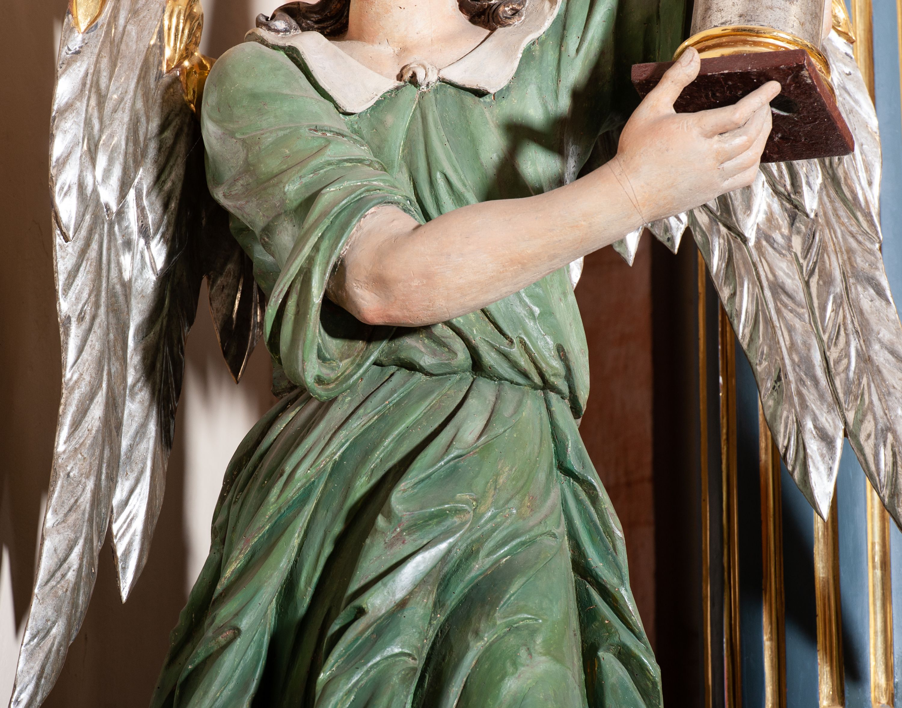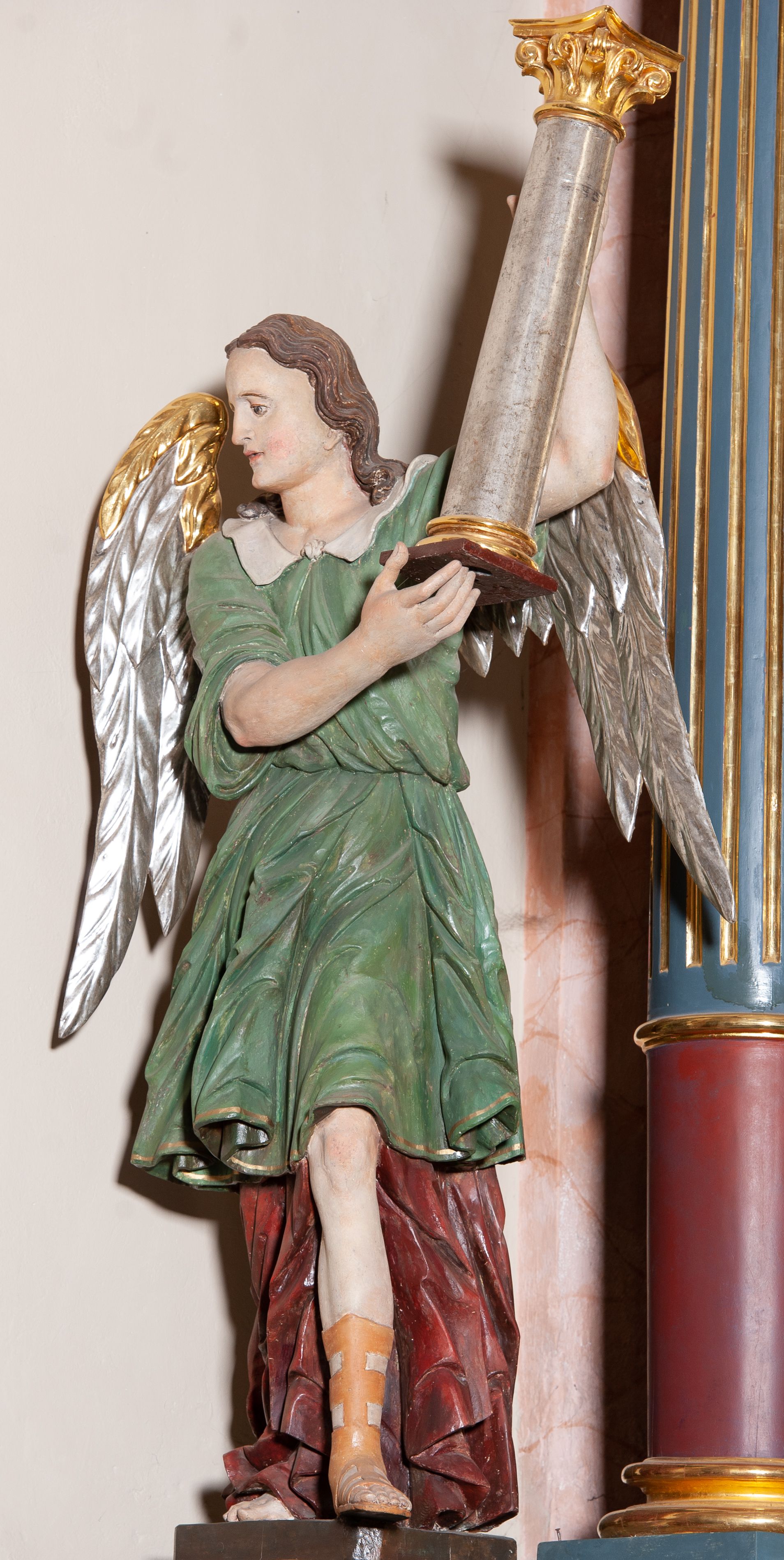 Rzeźba pełnoplastyczna, drążona, przedstawiająca anioła z arma Christi w dłoniach. Figura ustawiona frontalnie z lewą nogą wysuniętą do przodu, z głową skierowaną w prawą stronę. W uniesionych po swojej lewej stronie dłoniach trzyma kolumnę biczowania. Twarz szeroka z wysokim czołem, prostym nosem, wzrokiem skierowanym w dół i delikatnie rozchylonymi ustami. Włosy długie, ciemnobrązowe z przedziałkiem pośrodku, opadające na ramiona. Anioł jest ubrany w czerwoną, długą szatę spodnią, silnie drapowaną, na niej ma założoną zieloną tunikę z białym kołnierzykiem, na stopach pomarańczowe, rzymskie sandały. Kolumna ustawiona na bazie, trzon gładki, kapitel koryncki. Polichromia naturalistyczna, skrzydła posrebrzane i pozłacane.