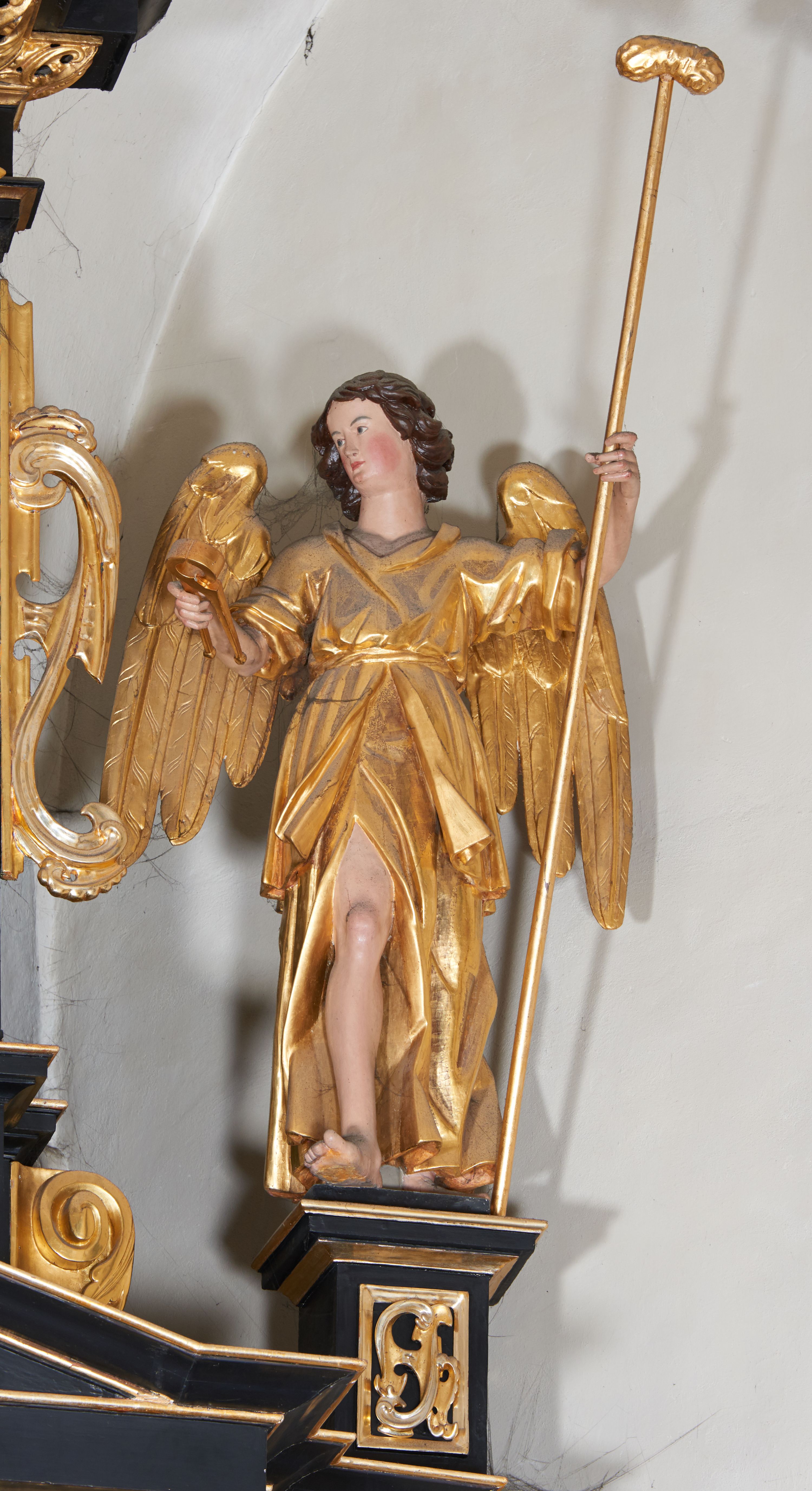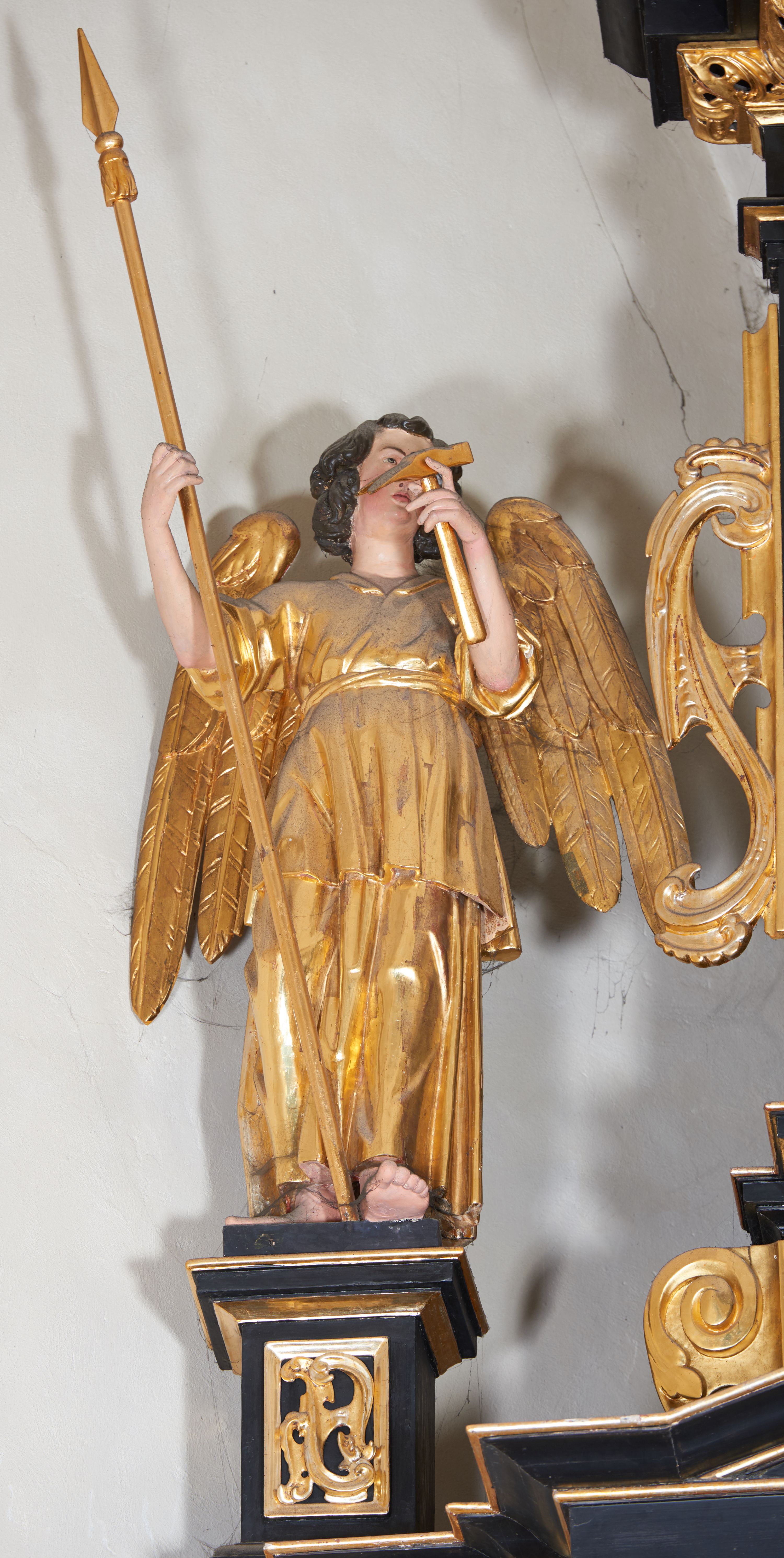 Drugi anioł ustawiony jest po drugiej stronie retabulum. Lewą ręką przytrzymuje opartą o ziemię włócznię, a w prawej trzyma młotek. Ubrany jest w długą suknię i tunikę spływające równoległymi fałdami do dołu. Głowa i skrzydła ukształtowane analogicznie jak w przypadku pierwszej postaci.