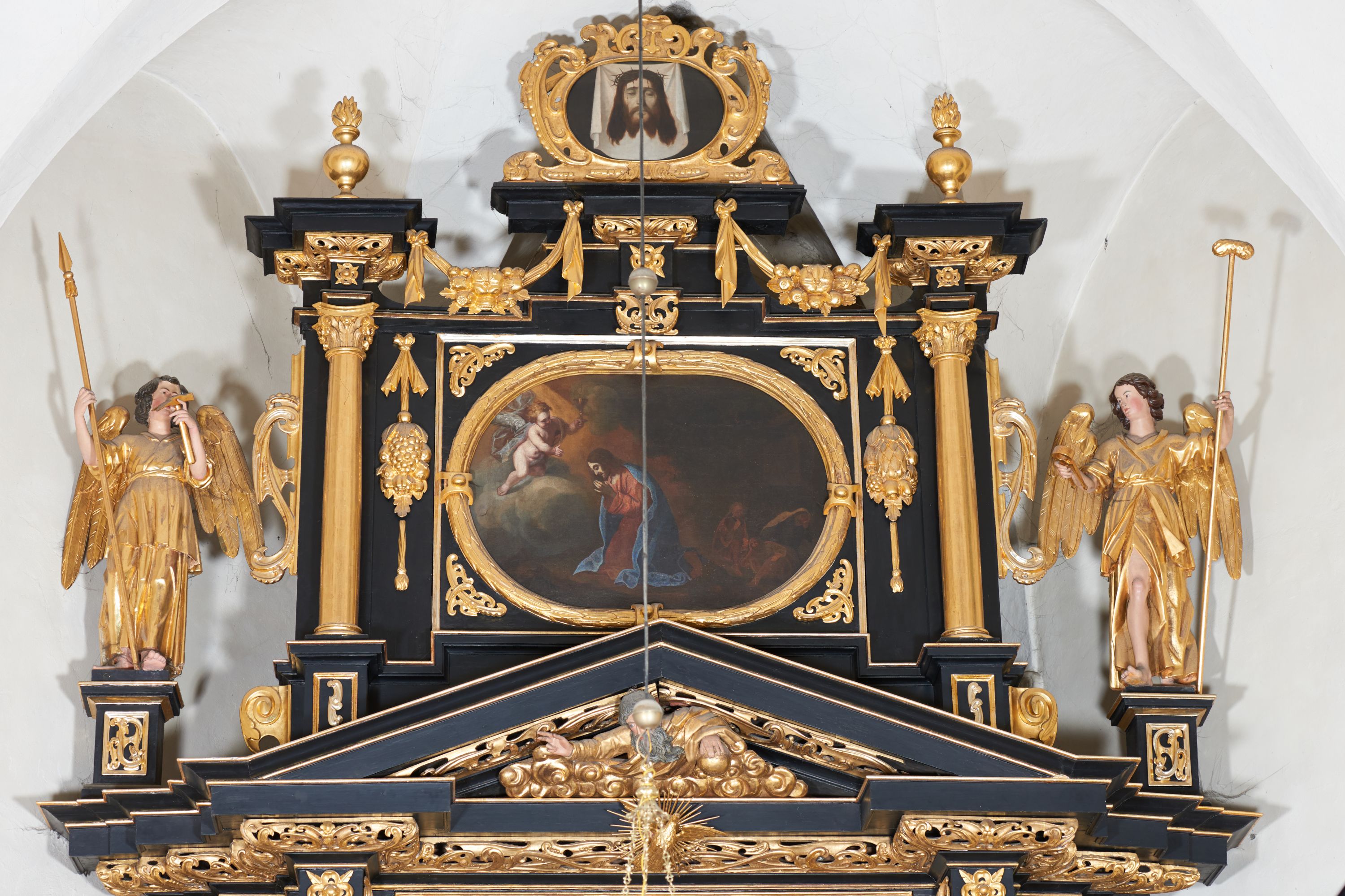 Anioł ukazany w całej postaci, stojący na postumencie po prawej stronie drugiej kondygnacji retabulum. Zwrócony frontalnie, w kontrapoście, z głową skierowaną w stronę ołtarza. Ciężar ciała oparty na lewej nodze, prawa zaś wysunięta w przód. Twarz owalna, osadzona na szerokiej szyi. W twarzy widoczne małe oczy, wąski, delikatnie zadarty nos, niewielkie usta oraz wystająca do przodu, okrągła broda; brązowe, kręcone włosy spływają na kark. W lewej ręce anioł trzyma włócznię z nabitą gąbką, a w prawej obcęgi. Ubrany jest w długą suknię odsłaniającą prawą nogę oraz szatę wierzchnią, przepasaną w talii sznurem; skrzydła złożone.