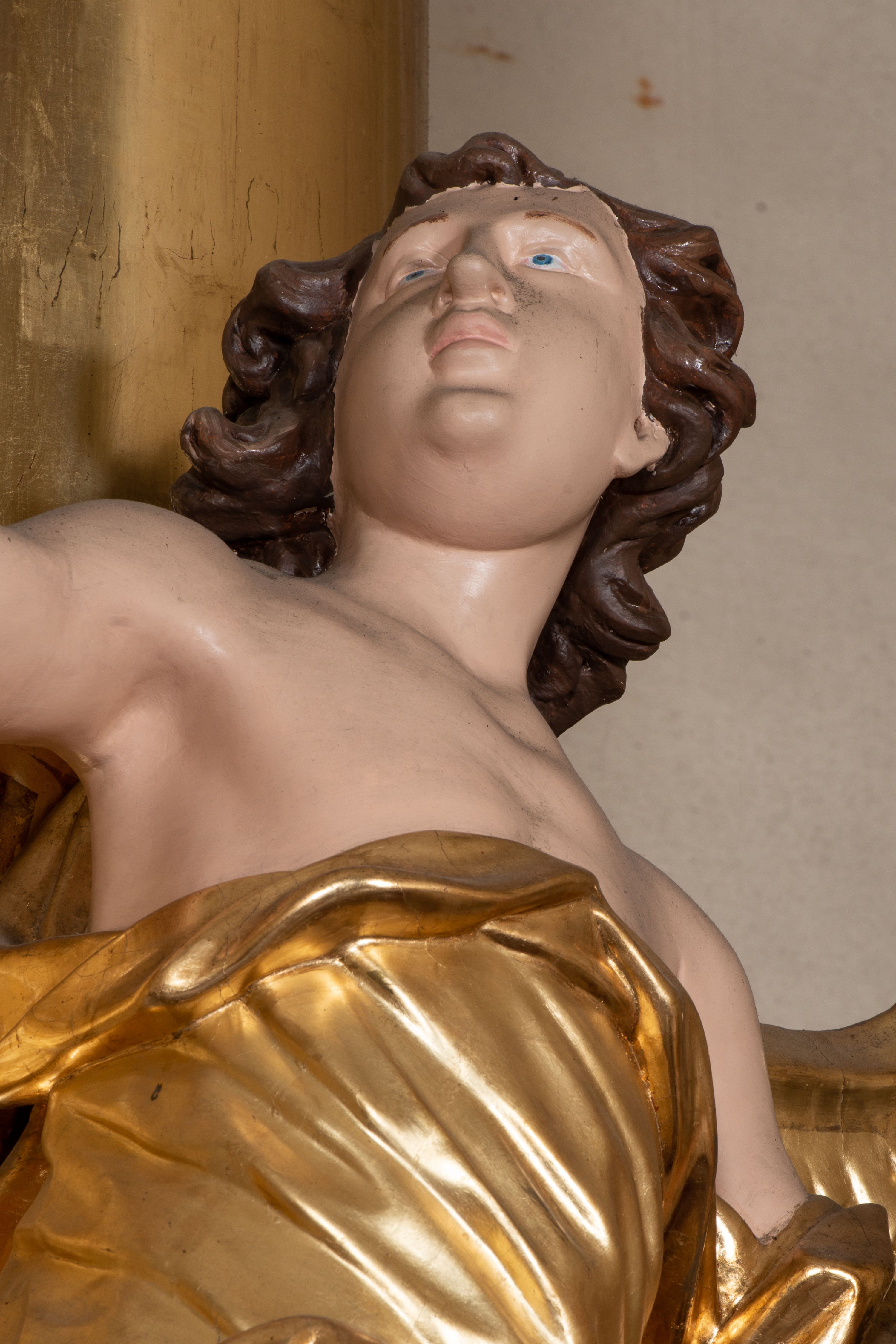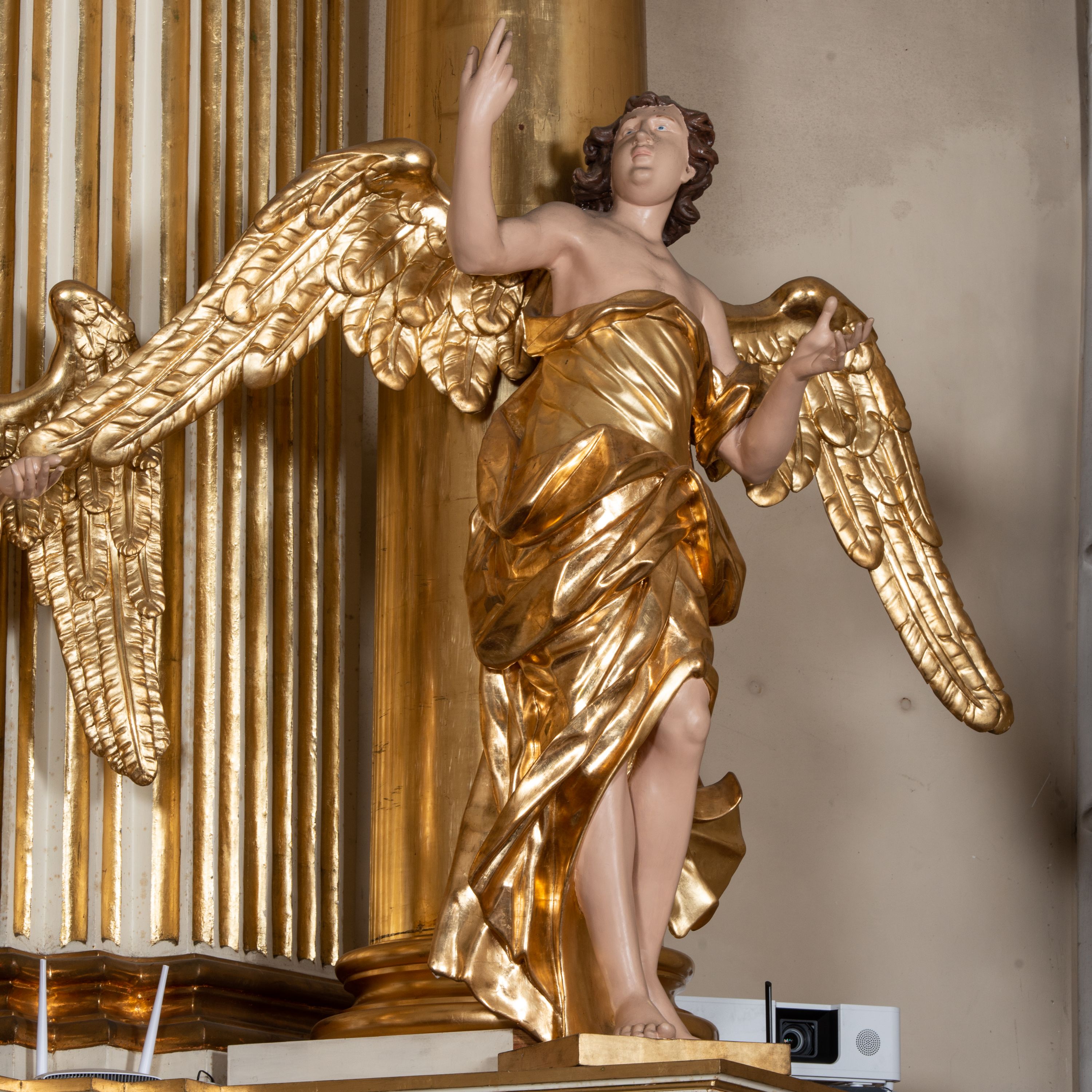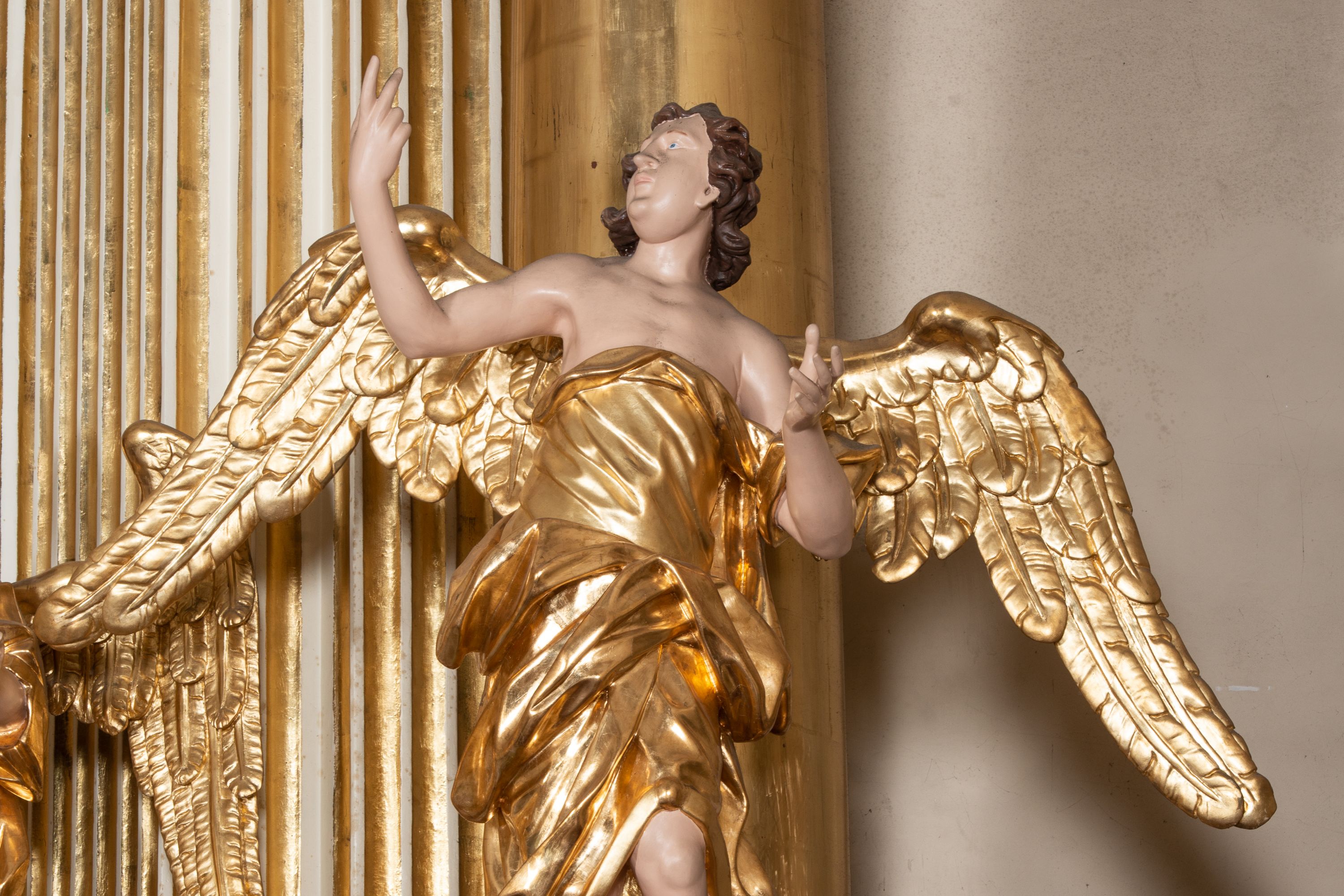 Rzeźba pierwszego z aniołów jest ścięta i drążona z tyłu. Postać została ustawiona frontalnie, w kontrapoście na obłoku. Głowa anioła jest skierowana w górę i obrócona w prawo. Lewą rękę ma uniesioną i odsuniętą od ciała, prawą natomiast unosi w górę. Jego twarz jest owalna, ma pełne usta, mały nos, i oczy skierowane w górę. Głowę otaczają krótkie i silnie kręcone włosy. Anioł ubrany jest w tunikę z jednym rękawem na lewej ręce, odsłaniającą ramiona oraz prawą rękę i lewe kolano. Fragment przerzuconego płaszcza widoczny jest w partii bioder. Jego skrzydła są rozłożone. Ciało zostało polichromowane w kolorze naturalnym, natomiast tunikę, płaszcz i skrzydła pozłocono. Także rzeźba drugiego anioła jest ścięta i drążona z tyłu. Ustawiony na prostokątnej, niskiej podstawie anioł w kontrapoście został ujęty frontalnie. Lewą rękę kładzie na piersi, prawą ma wyciąga w bok. Jego twarz jest owalna, o szeroko otwartych oczach, małym nosie, pełnych ustach, okolona krótkimi, silnie kręconymi włosami. Ubrany jest w tunikę odsłaniającą prawe ramię, z rękawem na lewym ramieniu, przewiązaną w talii, odsłaniającą prawe kolano oraz płaszcz przerzucony przez lewe ramię, otaczający postać, podtrzymany z przodu na tasiemce. Po bokach widoczne są złożone skrzydła. Figura polichromowana jest w partiach ciała naturalistycznie, natomiast szaty i skrzydła zostały wyzłocone.