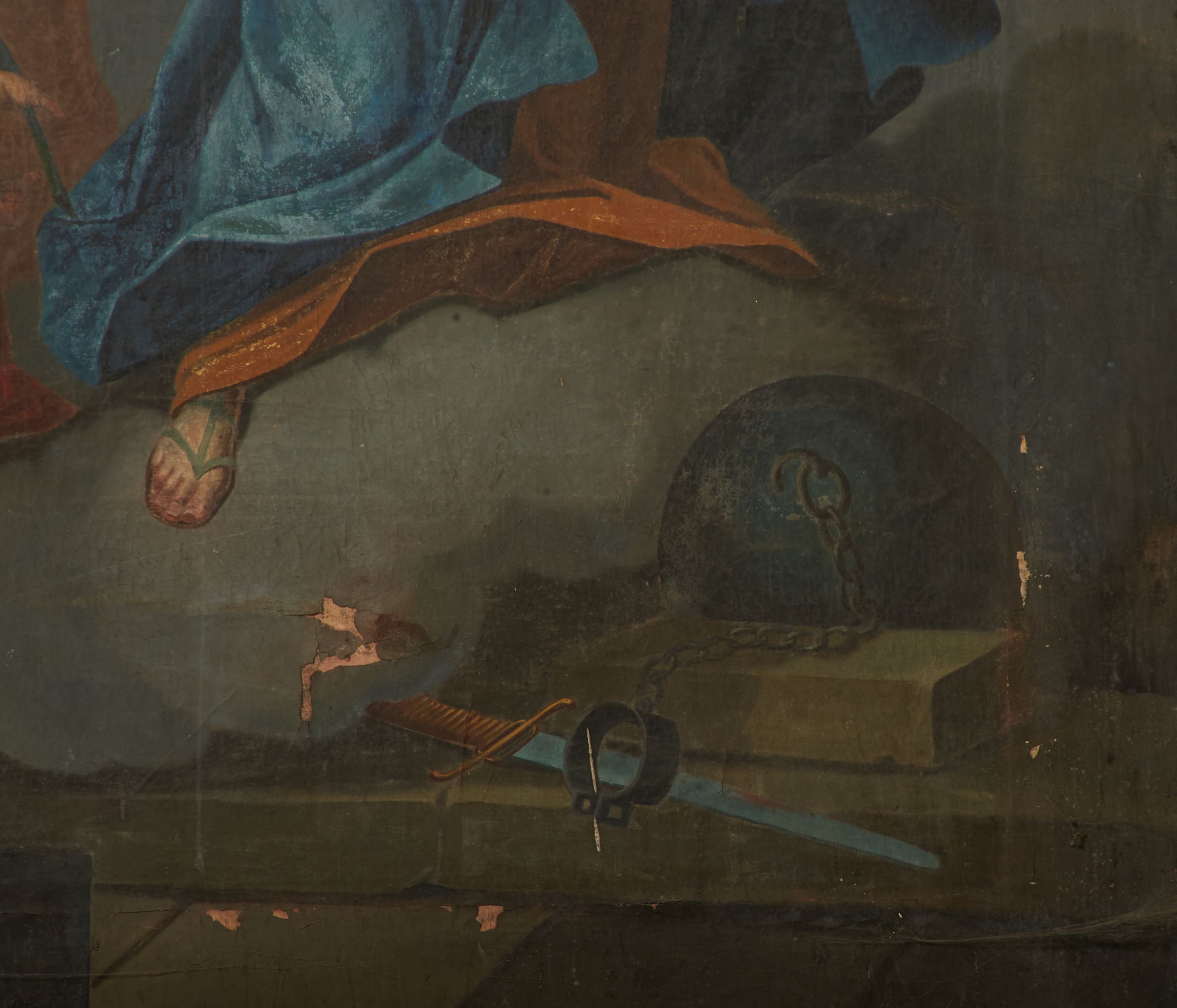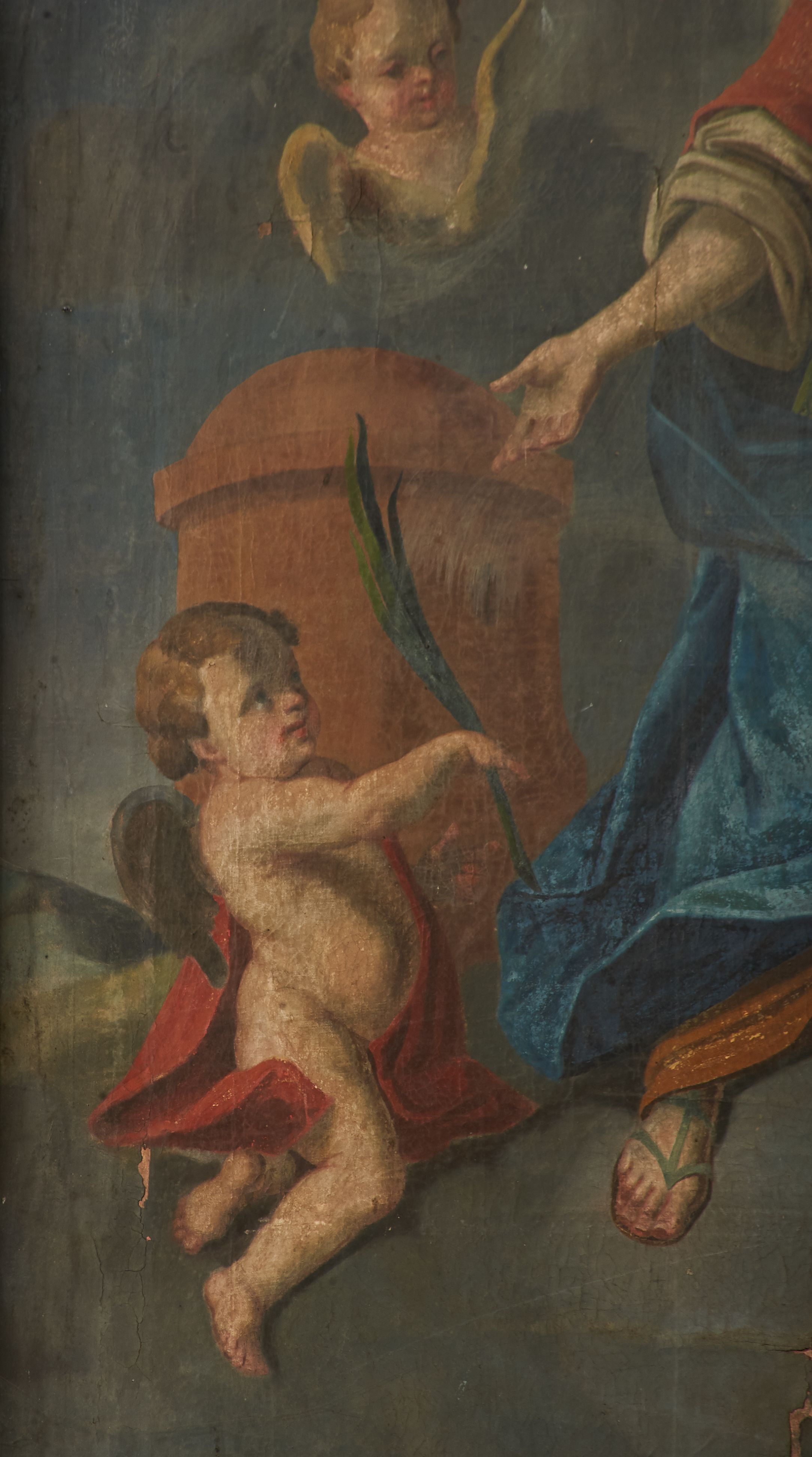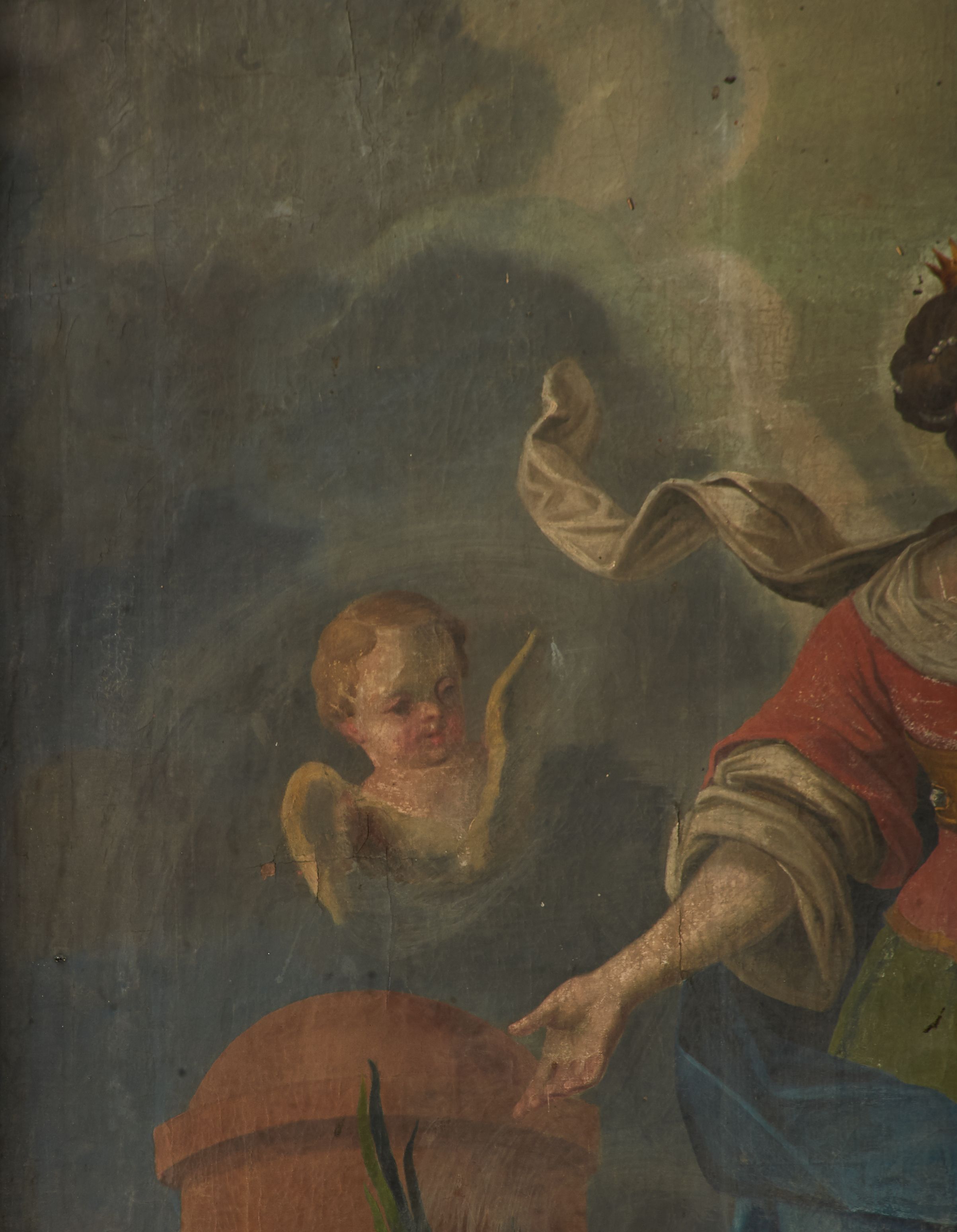 Zabrudzony, widoczne ubytki warstwy malarskiej.