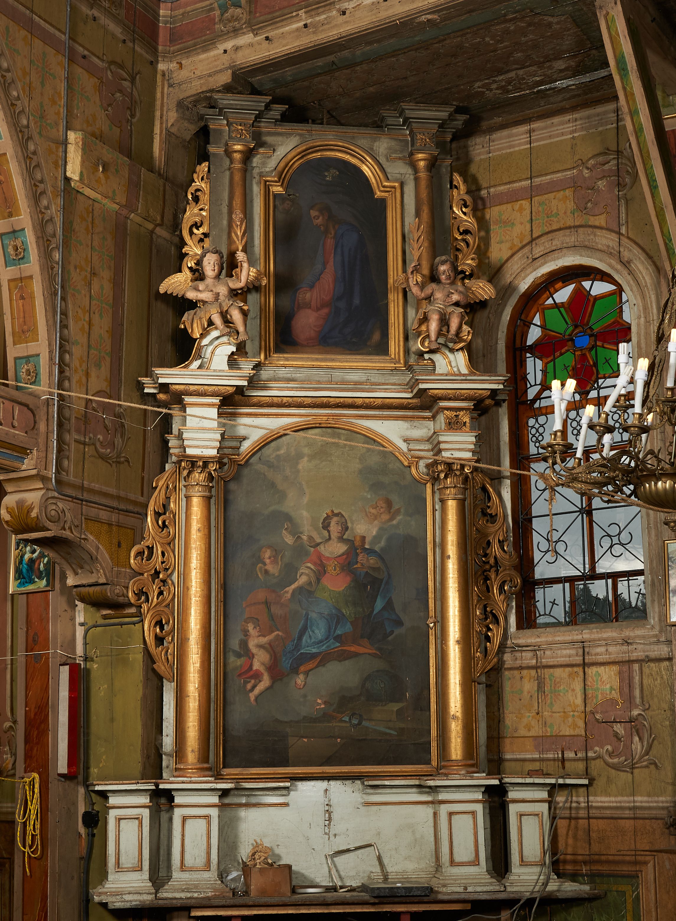 Obraz Apoteozy św. Barbary powstał przed 1766 rokiem. Prawdopodobnie dopiero na przełomie XIX i XX wieku został wprawiony do ołtarza bocznego. Święta w ikonografii jest ukazywana w koronie i bogatej sukni, co ma związek z pozycją społeczną jej rodziny. Atrybutem św. Barbary jest kielich z hostią, gdyż przed śmiercią w zamknięciu anioł przyniósł jej Komunię Świętą. W przedstawieniach świętej pojawiają się również wieża, miecz, a także palma męczeńska.