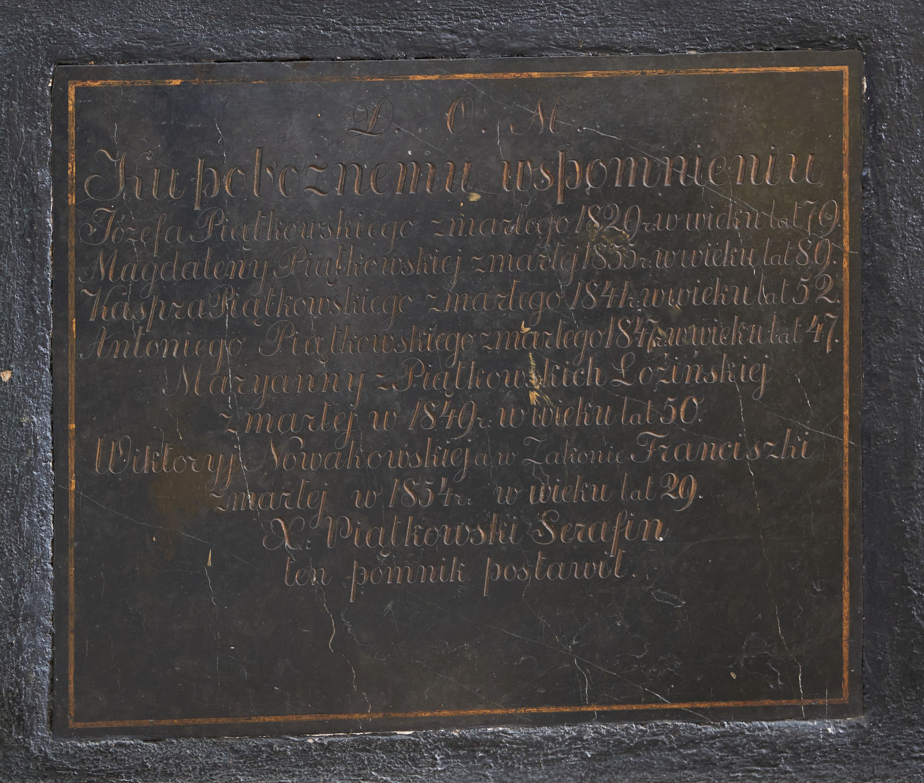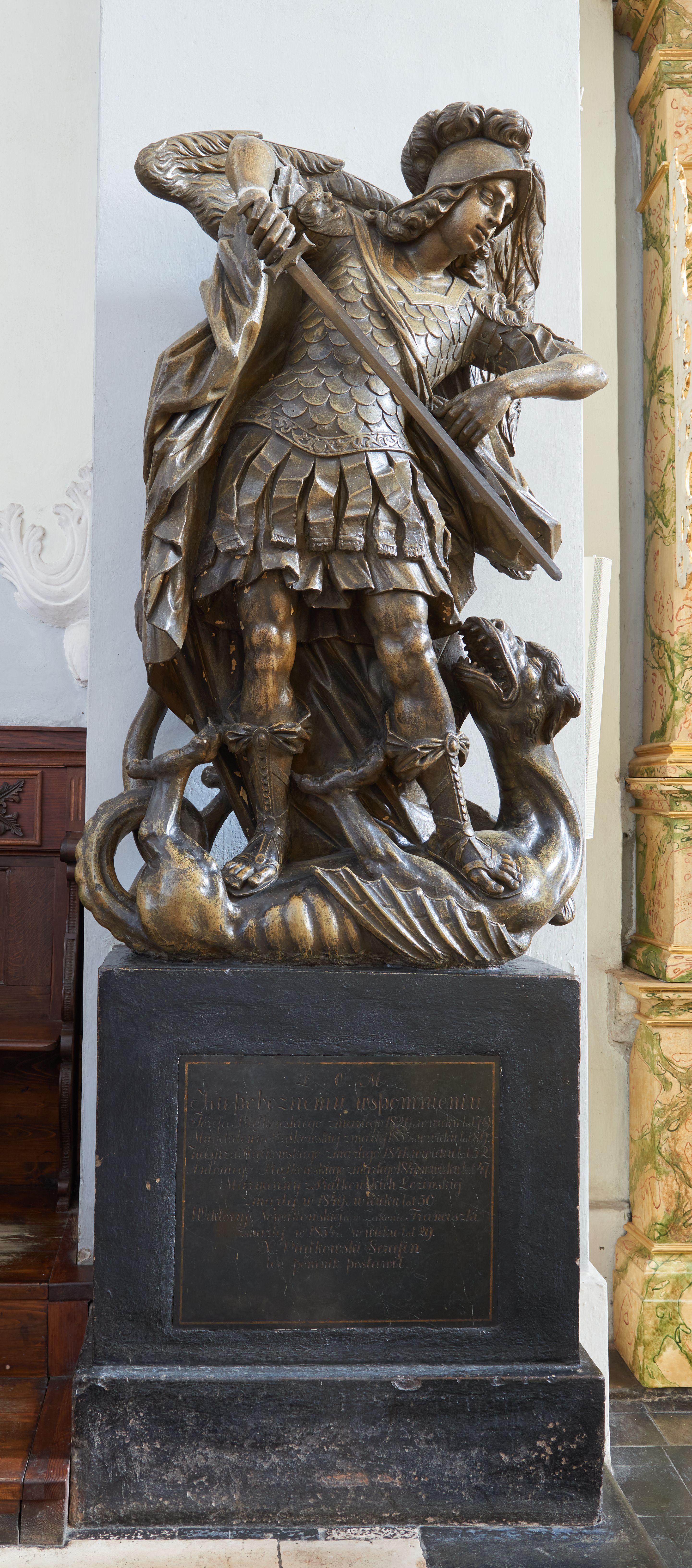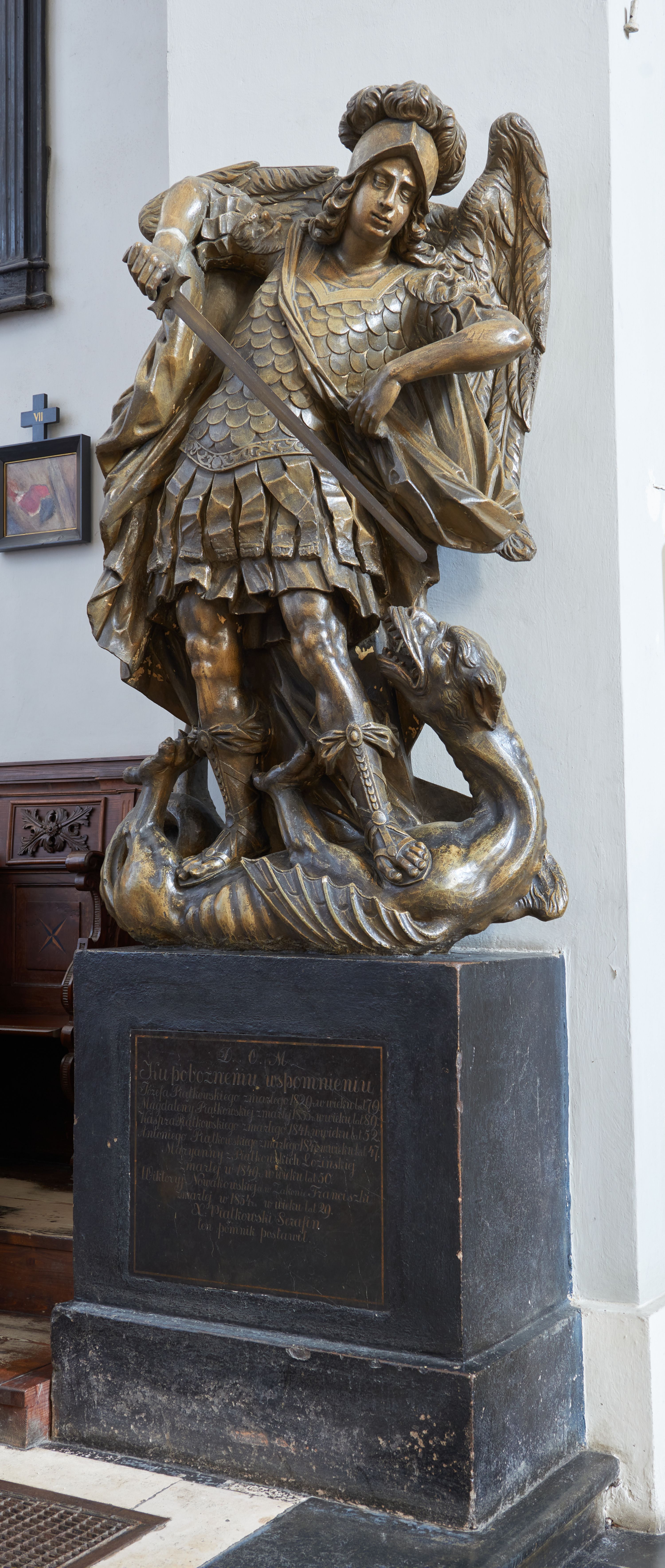 Rzeźba i nagrobek przyścienne. Nagrobek prostopadłościenny na cokole. Na nagrobku zamieszczona inskrypcja na marmurowej, wprawionej tablicy o wymiarach 70x 58 cm: „D.O.M./ Ku pobożnemu wspomnieniu/ Józefa Piątkowskiego zmarłego 1829 r: w wieku lat 70./ Magdaleny Piątkowskiej zmarłej 1855 r: w wieku lat 89./ Kaspra Piątkowskiego zmarłego 1847 r: w wieku lat 52./ Antoniego Piątkowskiego zmarłego 1847 r: w wieku lat 47./ Maryanny z Piątkowskich Łozińskiej/ zmarłej w 1849 r: w wieku lat 50./ Wiktoryj Nowakowskiej w Zakonie Franciszki zmarłej w 1854 r: w wieku lat 19/X: Piątkowski Serafin/ ten pomnik postawił”. Rzeźba ustawiona na nagrobku, przedstawia Michała Archanioła stojącego na smoku. Budowa ciała muskularna.Anioł w dynamicznej pozie, kontrapoście.Ciężar ciała oparty na prawej nodze. Tors i głowa silnie przechylone w lewą stronę. Ręce uniesione do wysokości ramion, ugięte w łokciach, przedramiona skierowane w dół. U ramion duże, dynamicznie ukształtowane skrzydła. Włosy kręcone, długością sięgające ramion, twarz o młodzieńczych rysach.W prawej dłoni trzyma miecz, skierowany ukośnie w dół, w stronę głowy smoka. Ubrany w zbroję łuskową, w dolnej partii zakończoną fartuchem złożonym zpasów, hełm z obfitym pióropuszem oraz sandały sięgające połowy łydki. Postać odziana jest w dekoracyjnie kształtowany płaszcz. Smok leżący na grzbiecie, pod stopami Archanioła, ma głowę i łapy wyciągnięte ku górze. Na grzbiecie łuska oraz skrzydła.
