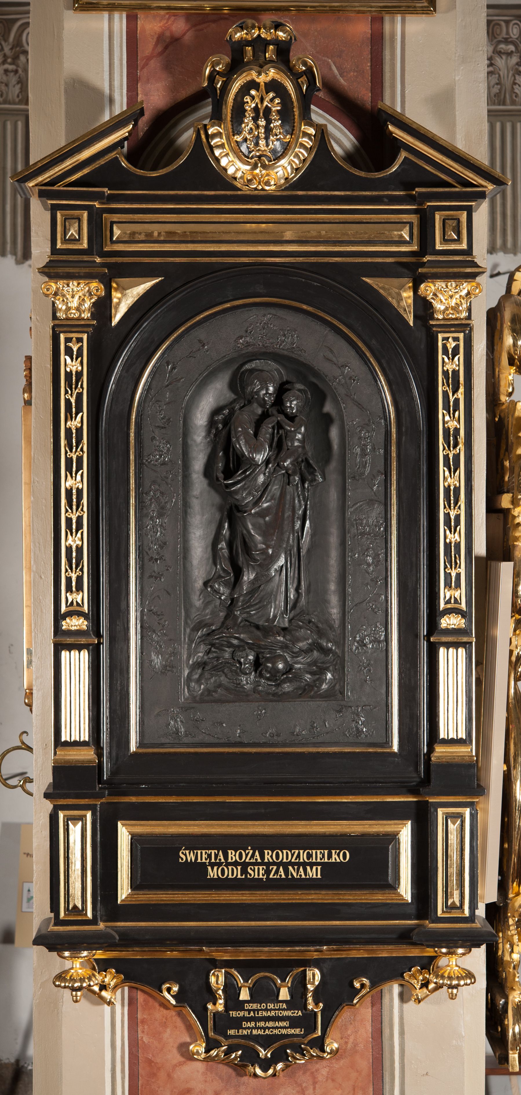 Płaskorzeźba przedstawiająca Matkę Boską z Dzieciątkiem w bogatym obramieniu w formie aediculi. Maria została przedstawiona całopostaciowo, zwrócona w trzech czwartych w lewo, z lewą nogą wysuniętą do przodu. Ma młodą twarz, którą okalają długie, opadające na plecy włosy. Jest ubrana w długą suknię i płaszcz, który tworzy obszerny zawój wokół jej prawego biodra. Lewą ręką podtrzymuje Dzieciątko, do którego wyciąga prawą rękę. Dzieciątko jest nagie, patrzy na Marię, wyciąga dłoń do jej ręki. Postacie stoją na obłokach, w których unoszą się główki anielskie. Intymne wyobrażenie jest ujęte bordiurą ze scenami z życia Marii. Płaskorzeźba ma kształt stojącego prostokąta zamkniętego od góry łukiem półkolistym. Ujmują ją pilastry o dekorowanych trzonach oparte na szerokim cokole z płyciną z napisem „ŚWIĘTA BOŻA RODZICIELKO / MÓDL SIĘ ZA NAMI”. Na dole cokołu podwieszenie z kartuszem z inskrypcją „DZIEŁO DŁUTA / TEOFILA LENARTOWICZA / DAR HRABIANKI / HELENY MAŁACHOWSKIEJ”. Od góry kompozycję zamyka trójkątny, przerwany przyczółek z kartuszem herbowym. Obramienie polichromowane na kolor czarny, profile, ornamenty i detale złocone.