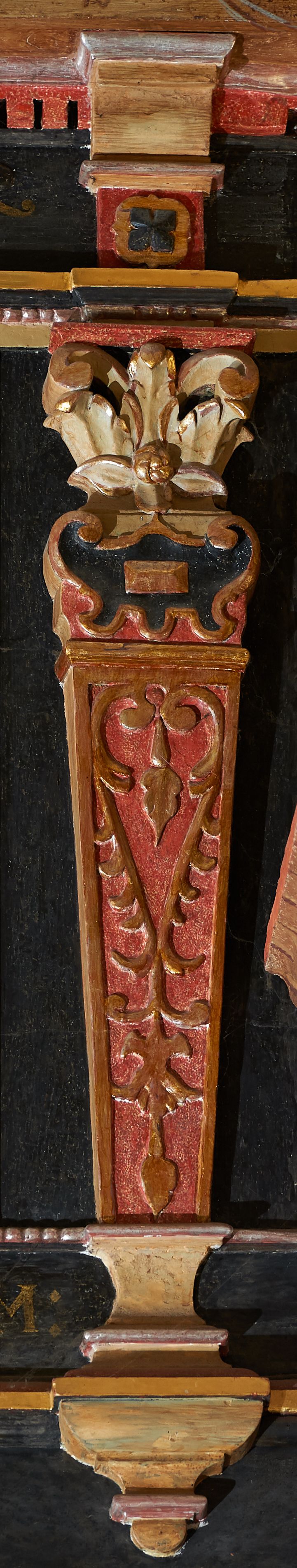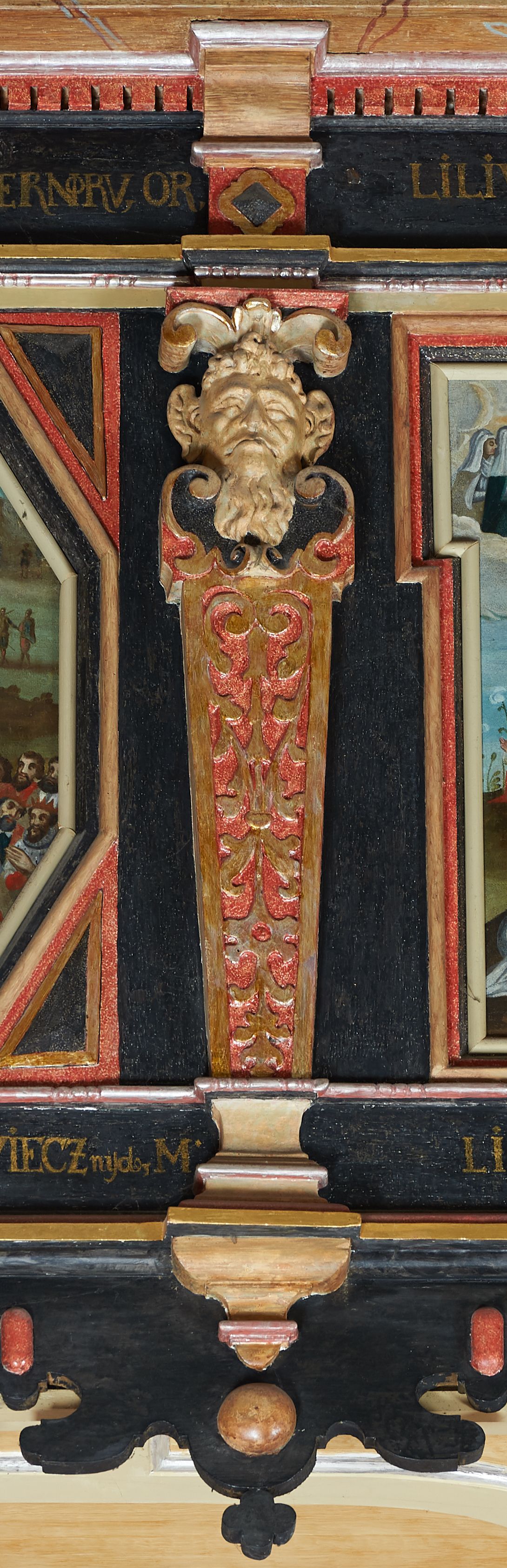 Balustrada ganku obiegająca ścianę zachodnią, północną i południową z malowanymi scenami Litanii Loretańskiej umieszczonymi w płycinach o różnorodnych kształtach, przeważnie stojącego prostokąta z modyfikacjami: o ściętych narożach, zamkniętych półkoliście, zamkniętych uszakami lub innych. Poszczególne osie wydzielone są pilastrami hermowymi, wspartymi na bazach i niskich cokołach. Podpory podtrzymują imposty zdobione rombami oraz niepełne belkowanie w postaci profilowanego gzymsu, wyłamanego na ich osi. Pod oraz ponad obrazami umieszczone są złocone napisy. Balustrada ujęta jest od dołu fantazyjnie wykrojonymi kartuszami, ozdobionymi kaboszonami i rautami. Struktura jest polichromowana na czarno, pilastry i detale na czerwono, ornamentyka i profilowania złocone oraz srebrzone. Poszczególne sceny opatrzone są napisami: