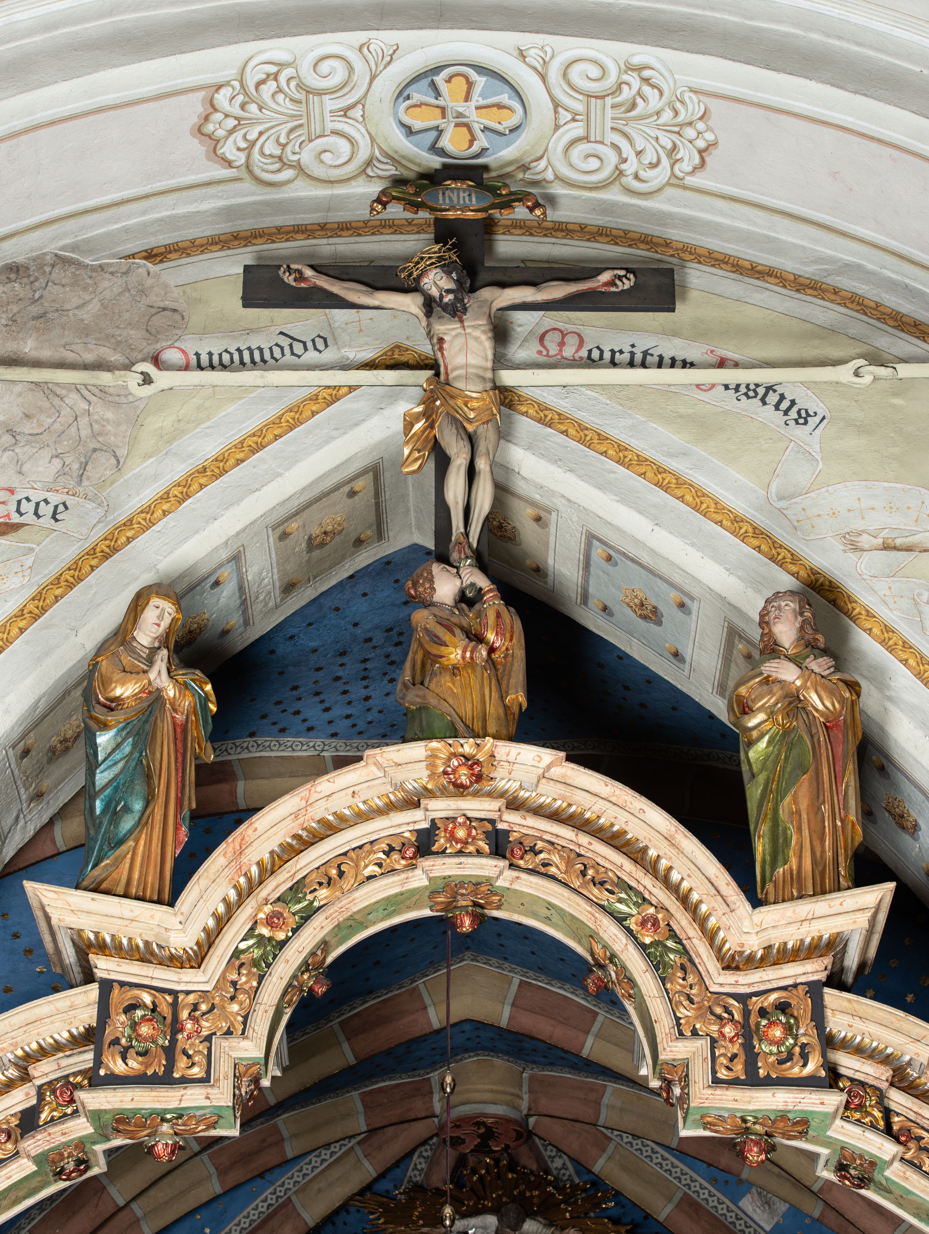 Belka profilowana, o formie pełnego belkowania, wygięta faliście, pośrodku wyłamana łukiem półkolistym nadwieszonym. Od frontu fryz dekorowany akantem i rozetami; od strony prezbiterium data: 1770; od spodu dekorowana rozetami. Na belce Grupa Ukrzyżowania. Rzeźby pełnoplastyczne, polichromowane. Pośrodku krzyż z figurą martwego Chrystusa. Ciało w lekkim zwisie, o szeroko rozłożonych ramionach. Kolana delikatnie ugięte, stopy przebite jednym gwoździem, założone prawa na lewą. Ciało wychudzone, smukłe, o podkreślonej muskulaturze, z zaznaczonymi śladami męki. Twarz pociągła, szczupła, oczy zamknięte; okolona zarostem. Włosy długie, opadające na ramiona. Na głowie korona cierniowa. Perizonium krótkie, ściśle opinające biodra, delikatnie drapowanie, ze zwisem tkaniny przy prawym boku. Na górnej belce krzyża titulus w formie kartusza z literami: INRI. U dołu krzyża klęcząca św. Maria Magdalena zwróconej en trois quarts w lewo, z głową skierowaną ku górze. Lewą ręką przytrzymuje stopę Chrystusa, prawa wyciągnięta przed siebie. Włosy upięte z tyłu głowy. Ubrana w bogatą suknię z gorsetem i dekoracyjnych rękawach oraz płaszcz zarzucony na ramiona. Po prawej stronie krzyża Matki Boska, ukazana frontalnie, z delikatnie pochylona głową i dłońmi złożonymi w geście modlitwy. Twarz pociągła, z uwypuklonym podbródkiem. Maria ubrana w suknię oraz płaszcz przewiązany na lewym ramieniu. Na głowie welon. Po lewej stronie krzyża św. Jan Ewangelista, ukazany en face, z głową skierowaną ku górze i dłońmi skrzyżowanymi na piersi. Twarz pociągła o młodzieńczych rysach, włosy długie, kręcone. Ubrany w długa tunikę przewiązaną w talii oraz płaszcz przewiązany na lewym ramieniu. Polichromia naturalistyczna w odsłoniętych partiach ciała, szaty złocone z laserunkiem.