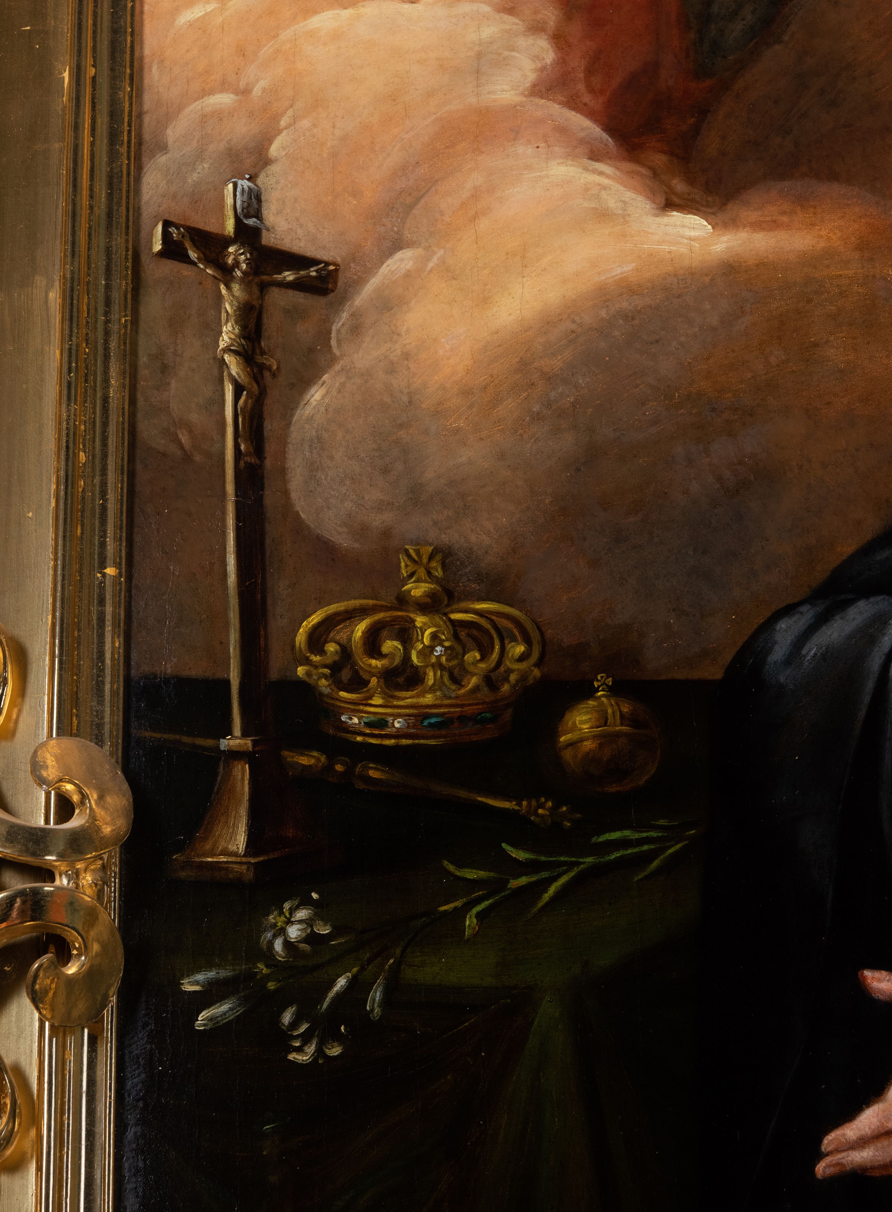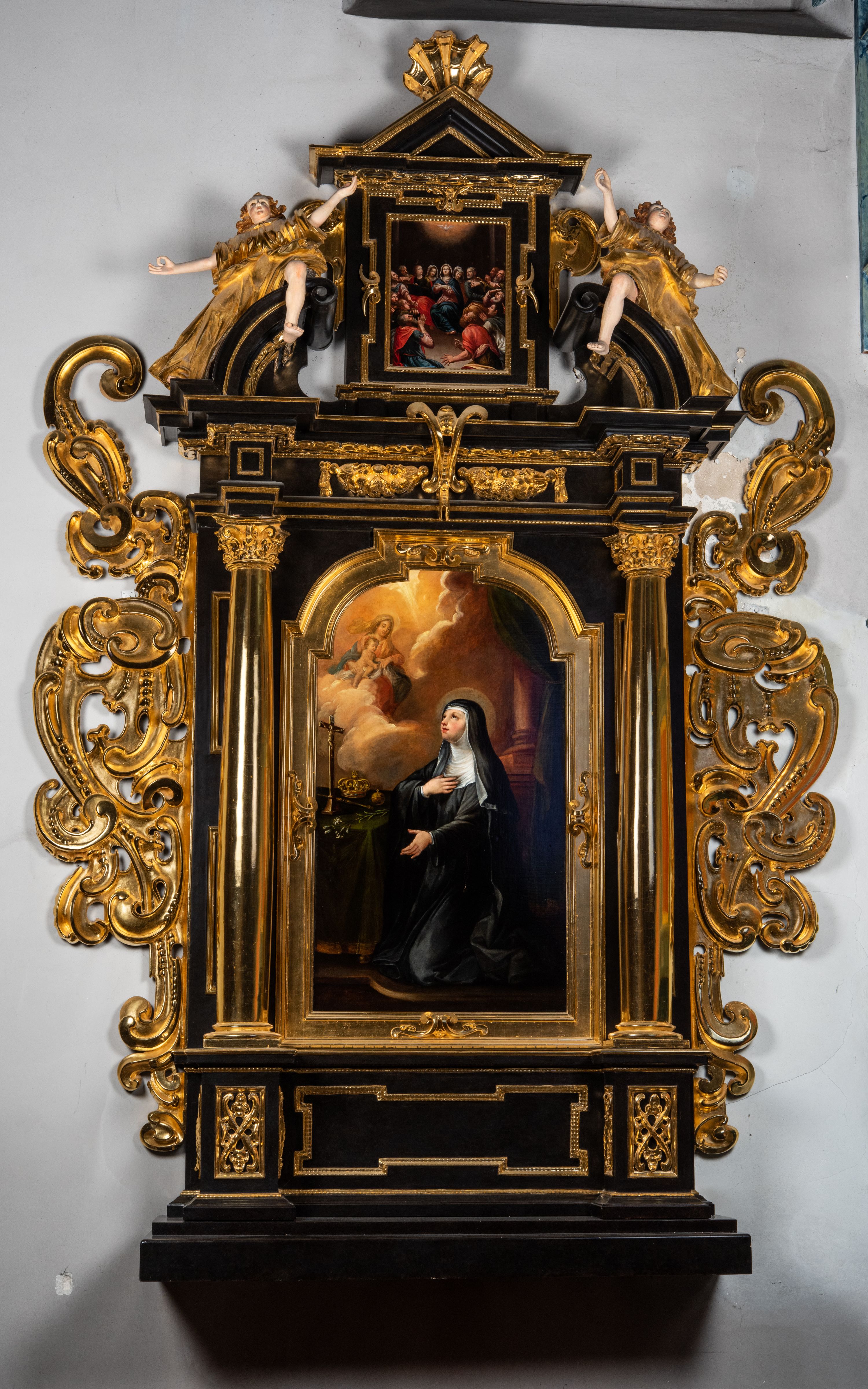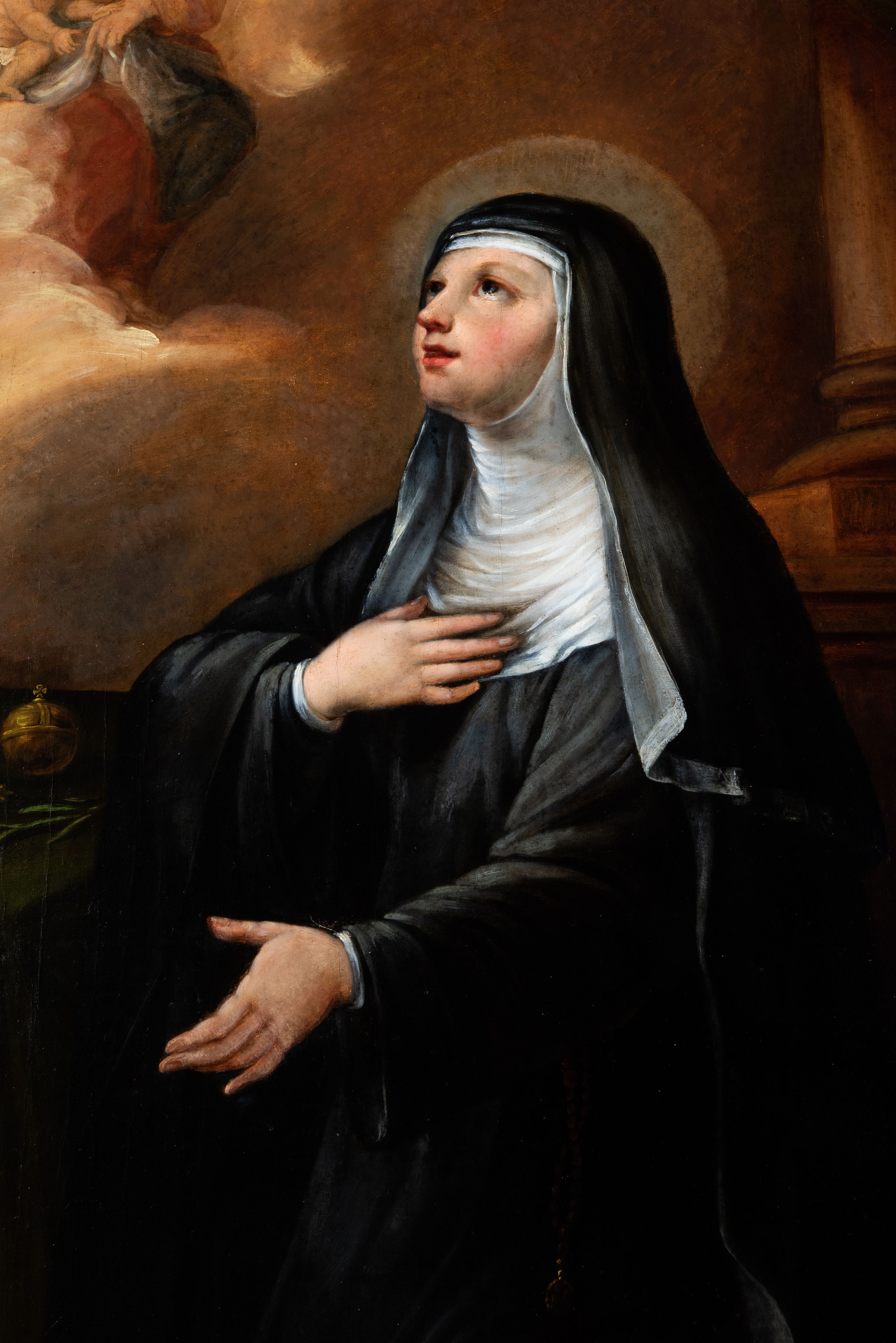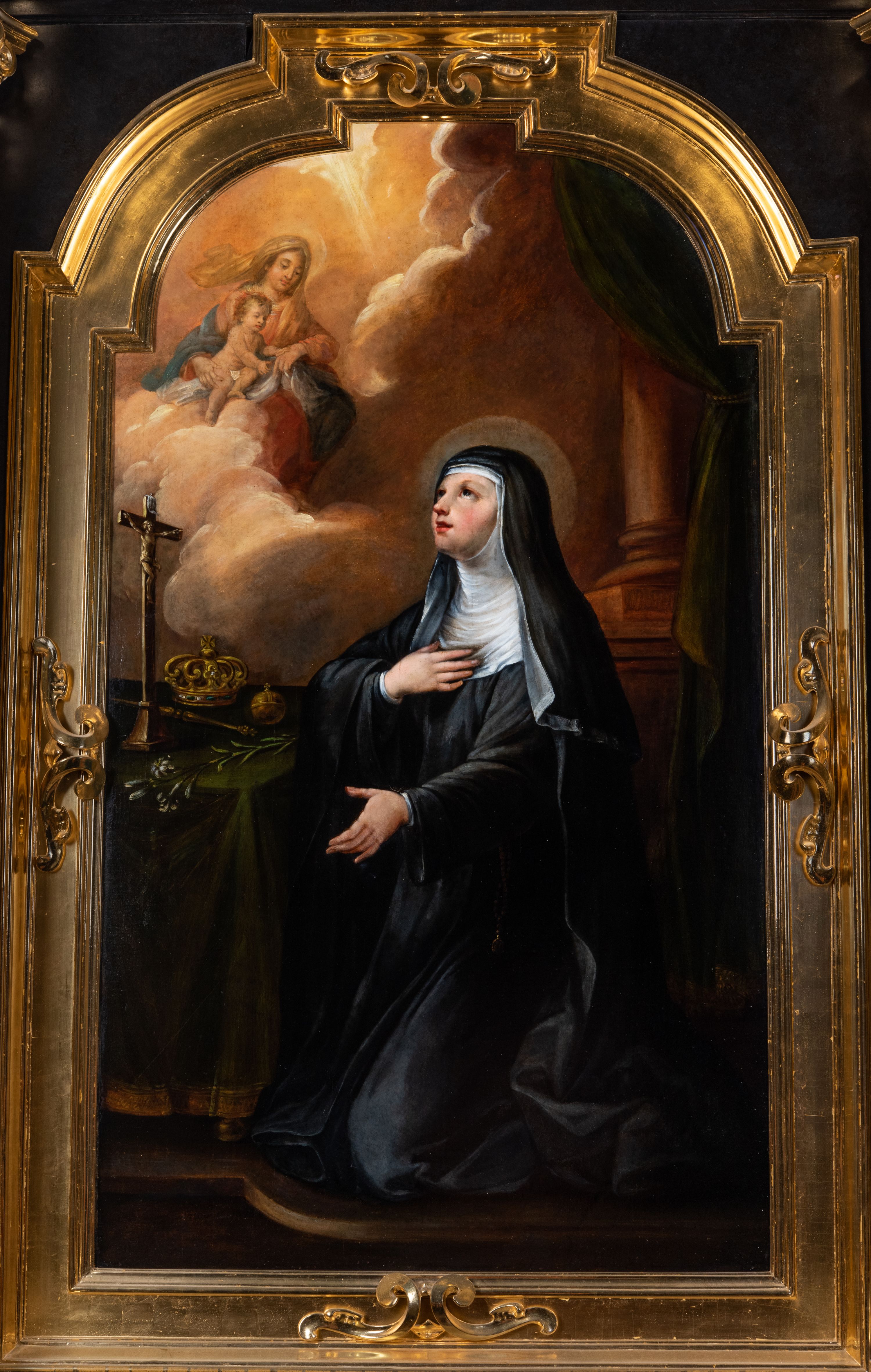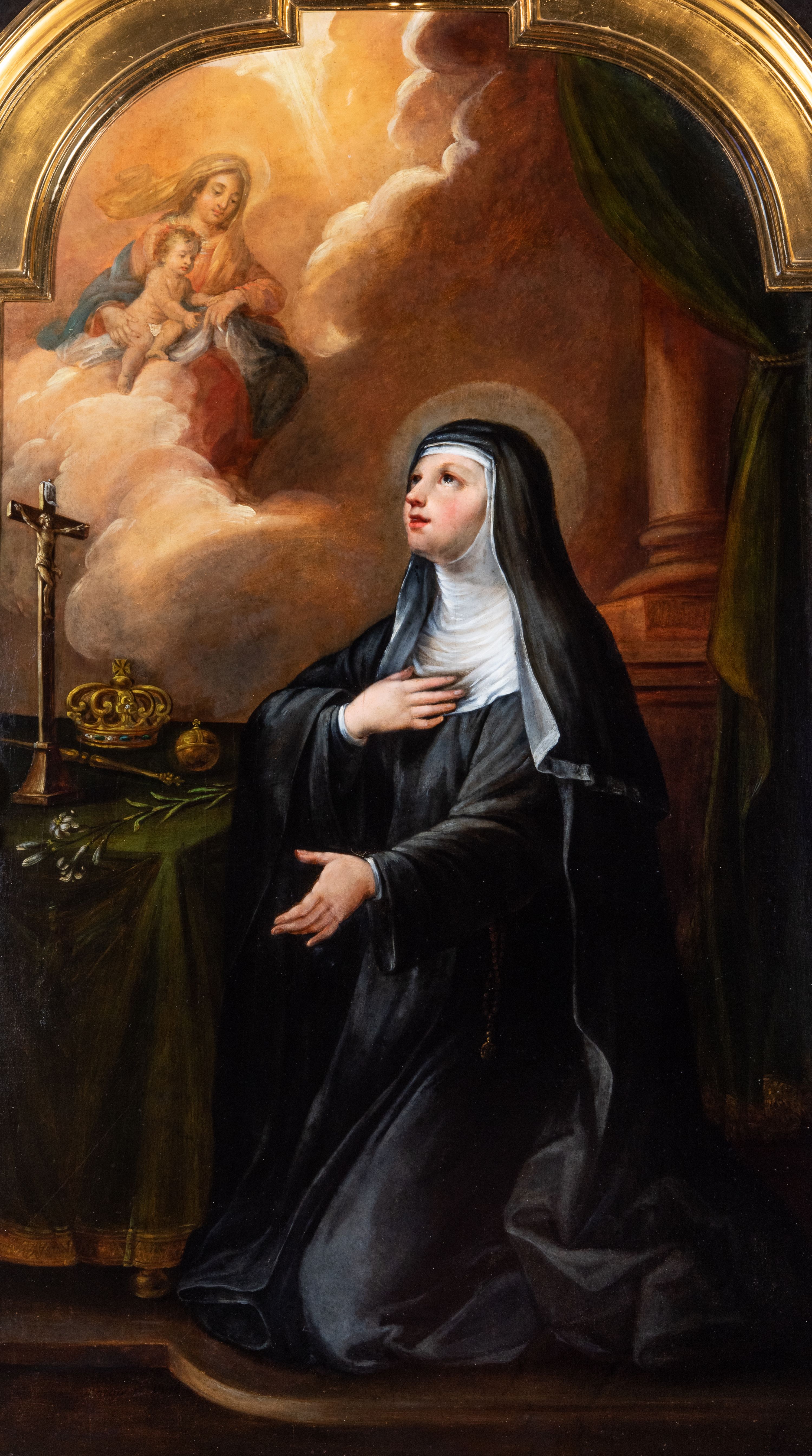 Obraz w kształcie stojącego prostokąta zamkniętego łukiem półkolistym, nadwieszonym, z występem. Święta ukazana w całej postaci, w pozycji klęczącej, w trzech czwartych. Ubrana jest w czarny habit i białą podwikę. Jej twarz jest pełna, nos długi, usta czerwone, lekko otwarte, oczy otwarte. Prawą rękę składa na piersi, lewą opuszcza w dół. Spogląda w kierunku Matki Boskiej z Dzieciątkiem wyłaniającej się z chmur. Przed nią stolik nakryty zieloną tkaniną ze złotym obszyciem, na którym znajdują się krucyfiks, korona zamknięta, berło, jabłko i lilia. W tle kolumna na postumencie i fragment kotary.