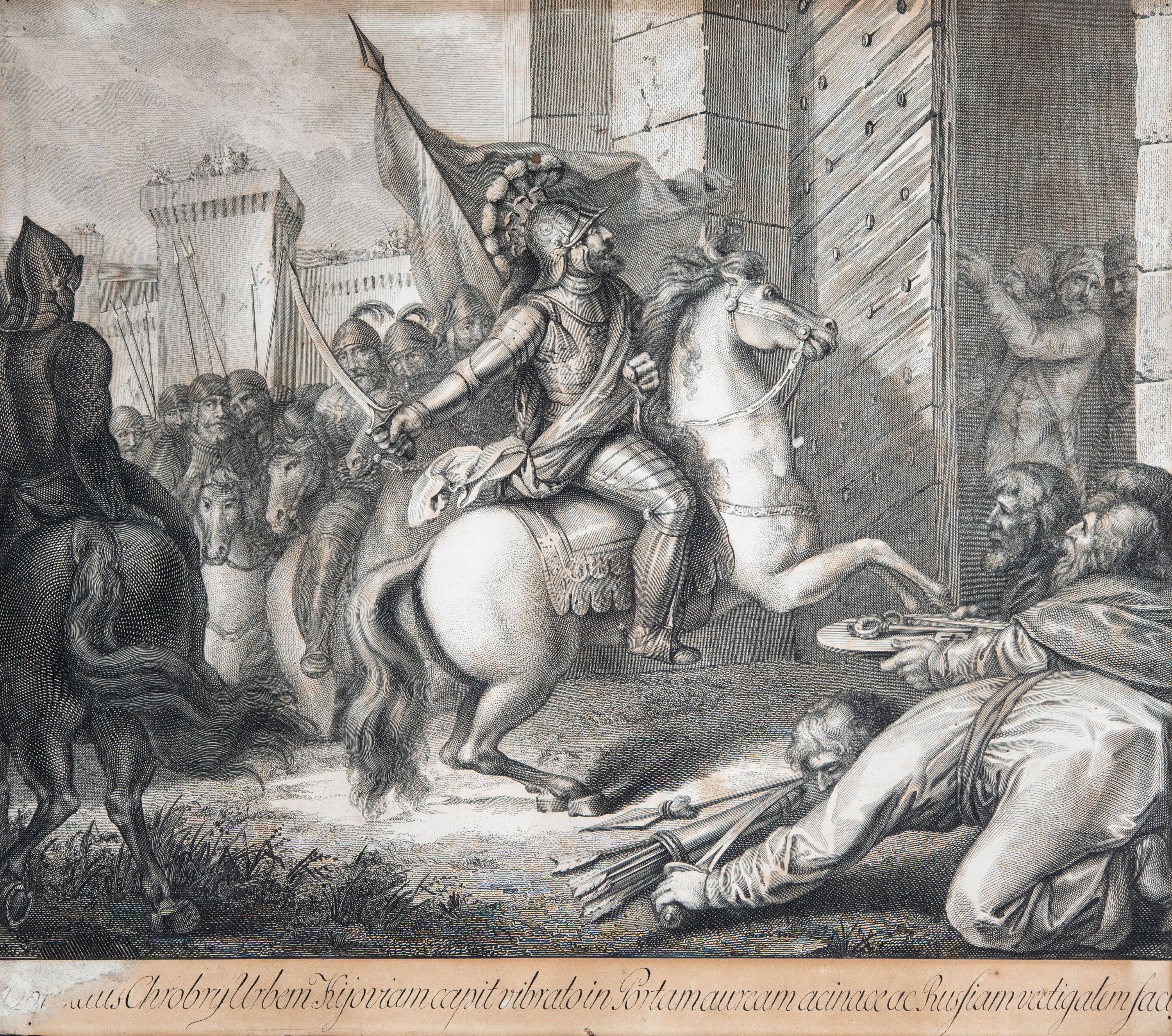 U dołu grafiki: "Boleslaus Chrobry Urbem Kijoviam capit vibrato in Portam auream acinace ac Russiam Vectigalem faci".