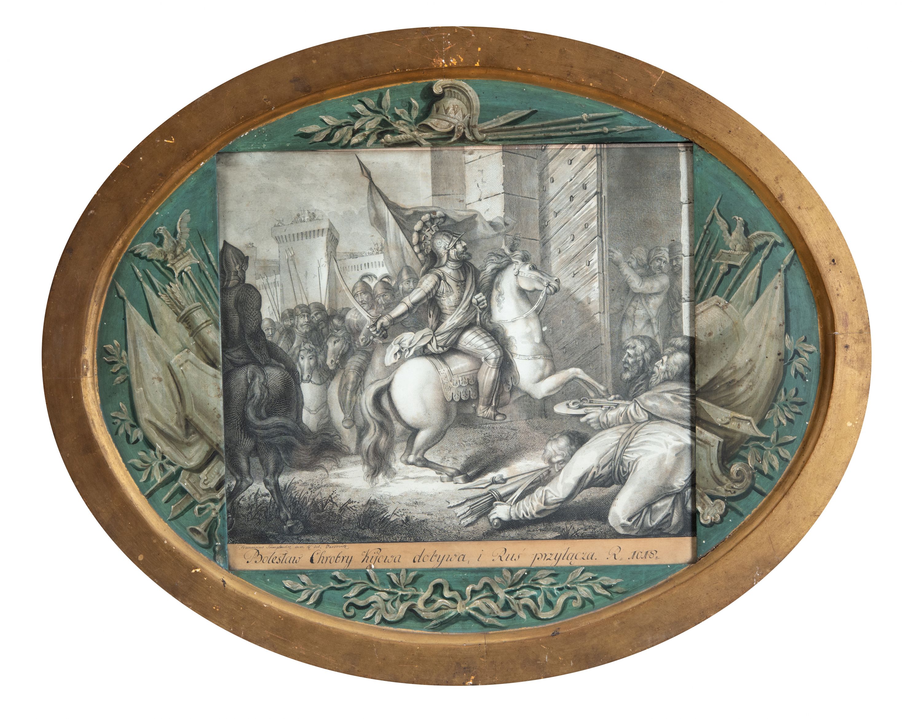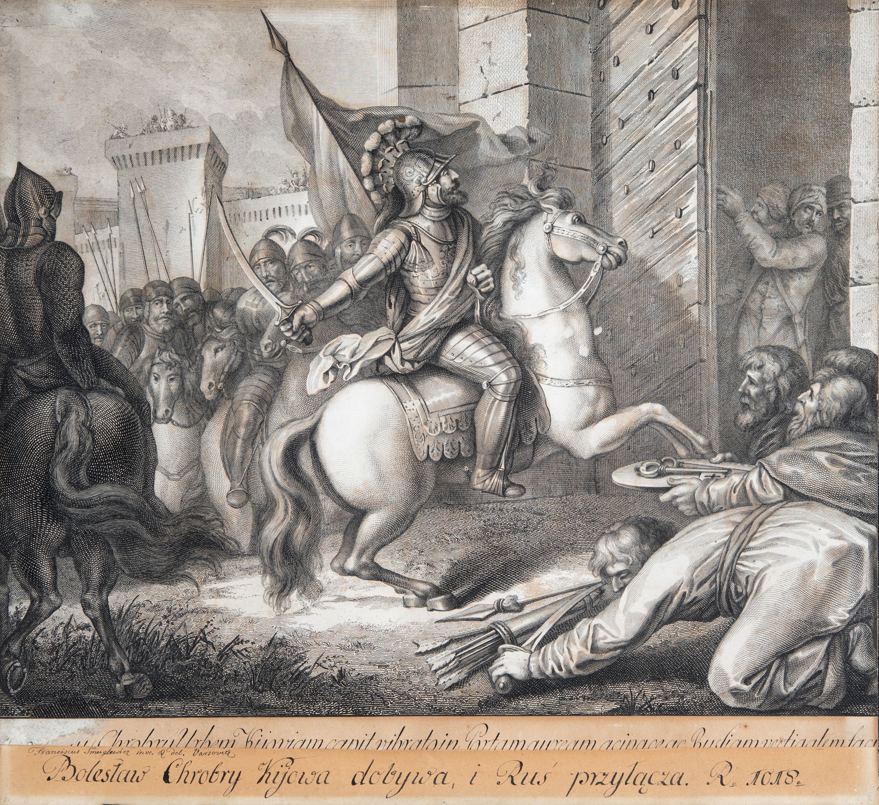 Na grafikę nałożona kartka z napisem: "Franciscus Smuglewicz inve. et del. Varsovia" i "Bolesław Chrobry Kijowa dobywa i Ruś przyłącza. R. 1018."