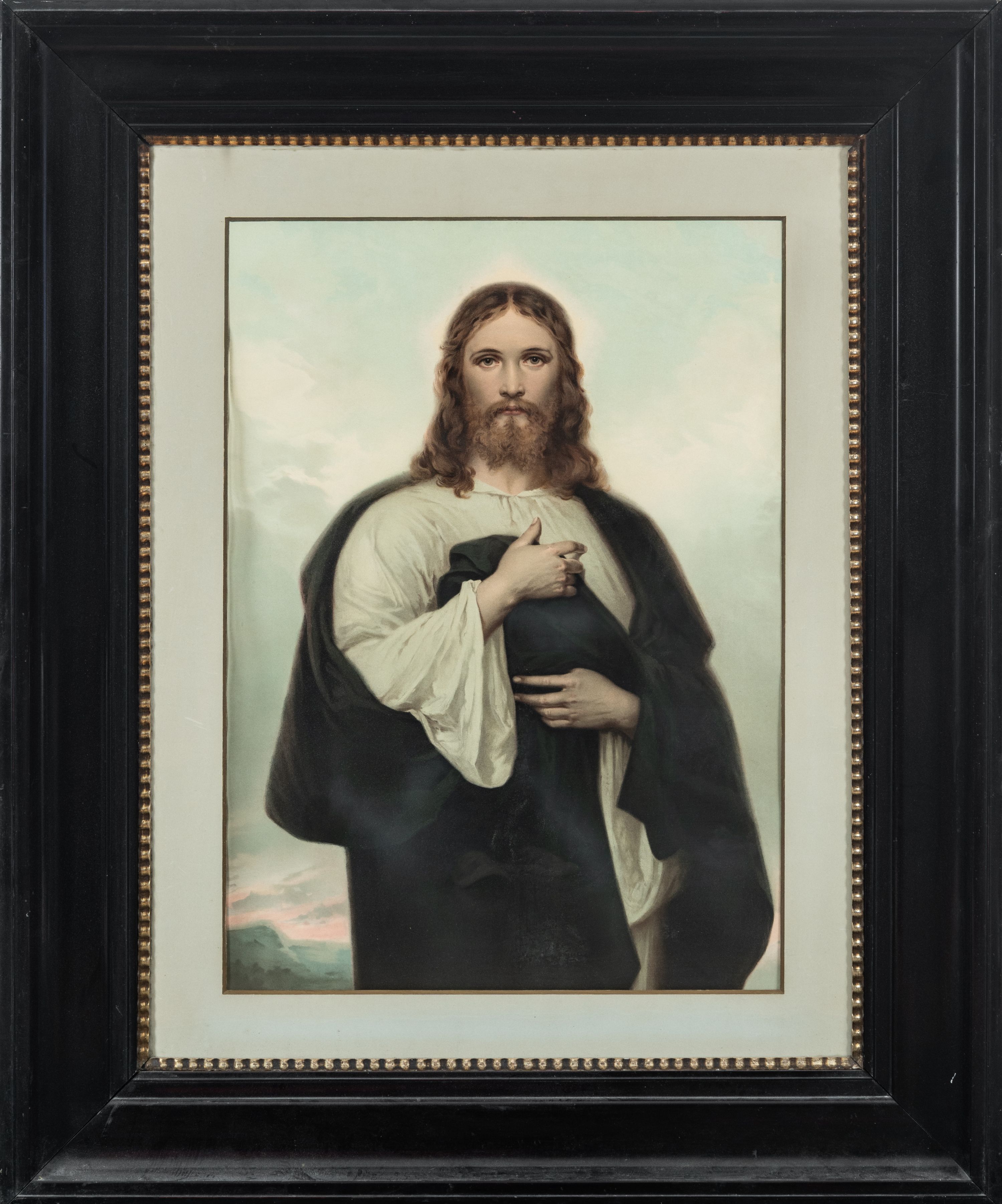 Obraz w formie stojącego prostokąta. W centrum Chrystus ukazany w półpostaci, zwrócony w trzech czwartych w lewo, z głową skierowaną frontalnie, obiema rękami przytrzymuje na piersi płaszcz. Twarz ma owalną, o niskim czole, migdałowatych oczach, prostym nosie i pełnych ustach; okoloną jasnobrązowymi, kręconymi brodą i włosami. Chrystus ubrany jest w białą, luźną tunikę oraz granatowy płaszcz zarzucony na ramiona i podtrzymywany z przodu postaci. Chrystus ukazany jest na tle pejzażu z błękitno-różowym niebem. Obraz ujęty szeroką, profilowaną, czarną ramą z złoconym perełkowaniem.