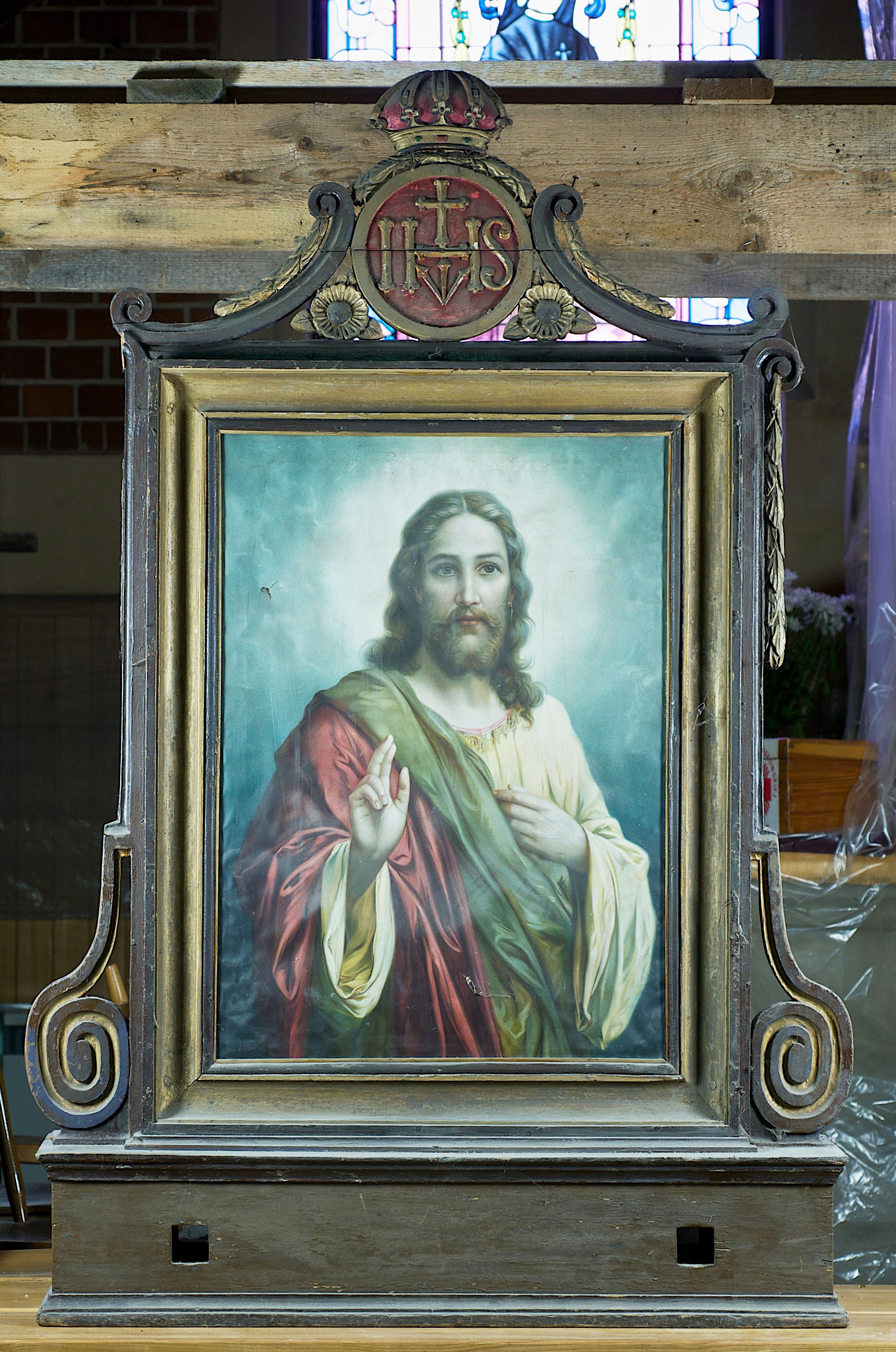 W dwudziestowieczny feretron, czyli przenośny, obustronny obraz (czasem rzeźbę) na podstawie, w którą wsuwa się drążki, wkomponowano wizerunek Matki Boskiej z Dzieciątkiem oraz podobiznę Chrystusa Błogosławiącego.