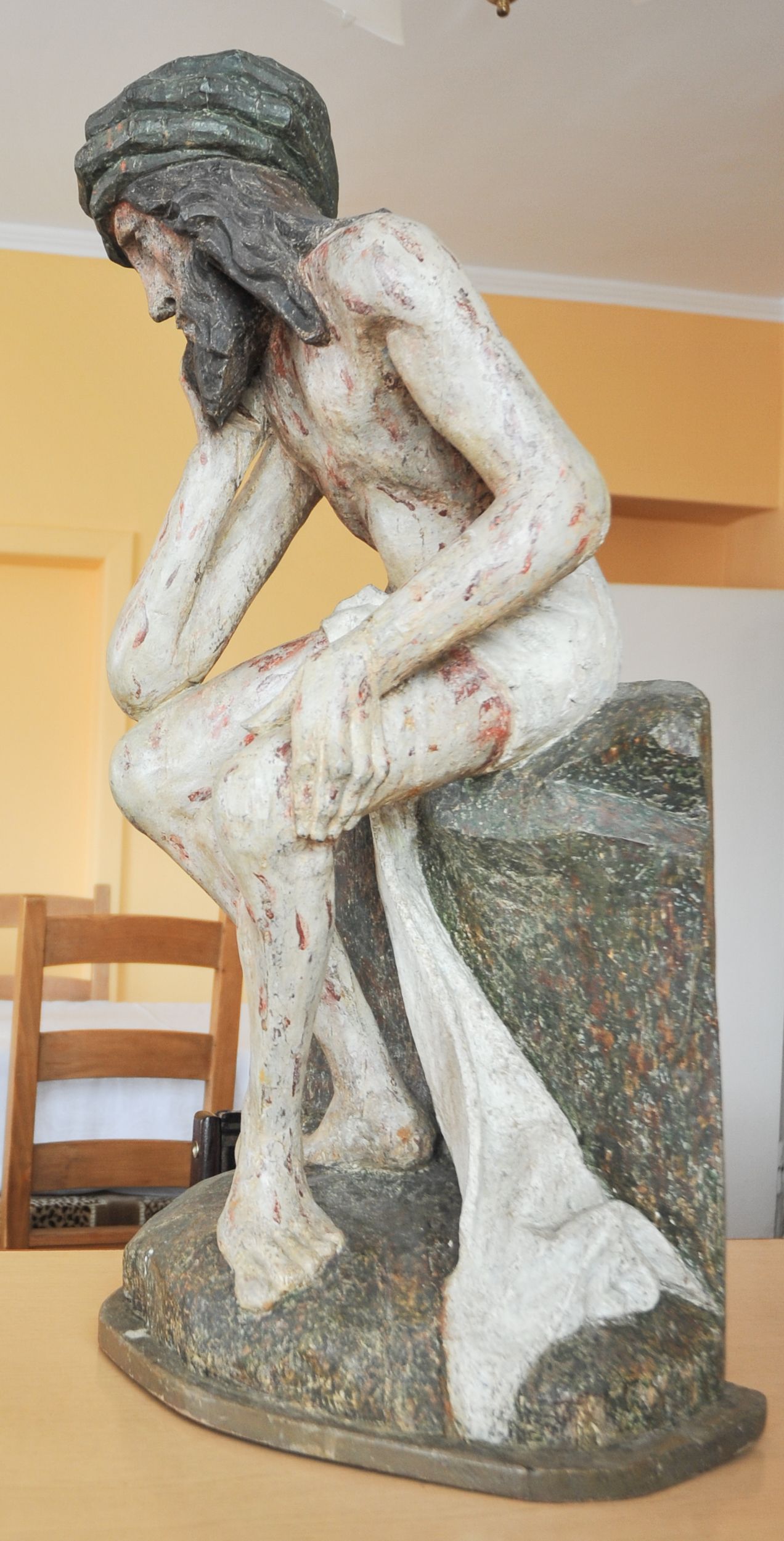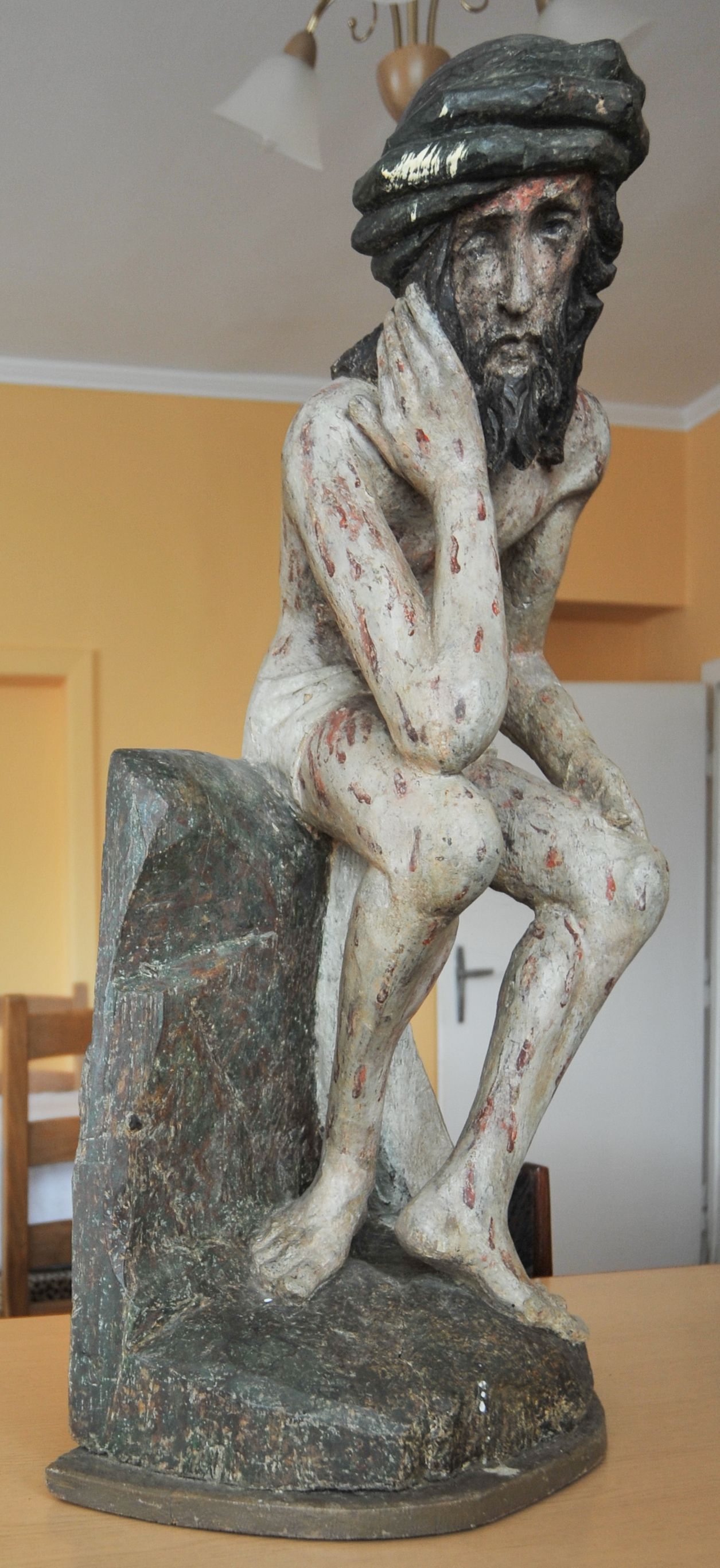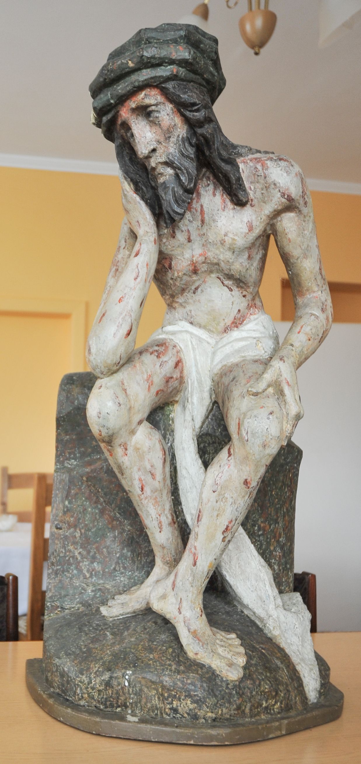 Rzeźba pełna, całopostaciowa, ustawiona na niewysokim cokole. Chrystus ukazany w pozycji siedzącej, na podstawie imitującej blok skalny. Prawą ręką, opartą na udzie podtrzymuje głowę, lewą dłoń opiera na lewej nodze; kolana ma rozchylone, lewą stopę ustawioną przed prawą. Chrystus ma pociągłą twarz o wydatnych kościach policzkowych, wąskie brwi opadające prostą linią w dół, długi nos, zagłębione oczy i wyraźnie zaznaczone usta. Długie włosy opadają mu na ramiona i plecy, broda dzieli się w dwa pukle; na głowie grube zwoje korony cierniowej. Biodra ma przepasane białym perizonium, którego długi, wolny koniec opada między udami i za lewą nogą aż na podłoże. Na całym ciele zaznaczono ślady męki – równomiernie rozmieszczone krople spływającej krwi. W partiach ciała polichromia naturalistyczna.