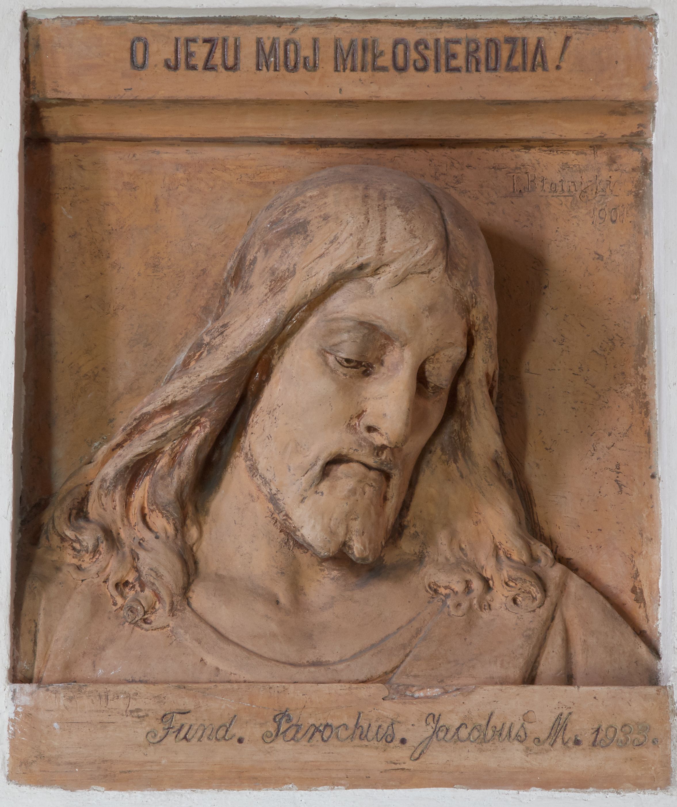 Płaskorzeźba w kształcie stojącego prostokąta z przedstawieniem w popiersiu Chrystusa Miłosiernego ujętego od dołu i od góry poziomymi listwami. Chrystus ukazany frontalnie, z głową lekko pochyloną i przechyloną na lewy bark. Twarz pociągła, z wydatnym nosem, wpółprzymkniętym oczami i wzrokiem skierowanym w dół; z wąsami i krótką, rozdwojoną na końcu brodą. Włosy długie, pofalowane, opadające na ramiona okryte cienką suknią z półkolistym wycięciem pod szyją. U góry na profilowanej belce inskrypcja majuskułą po polsku: O JEZU, z krót MÓJ MIŁOSIERDZIA! Na dolnej listwie inskrypcja: Fund. Parochus Jacobus M(orajka) 1933. Całość pomalowana w kolorze jasnego beżu z przetarciami warstwy malarskiej.