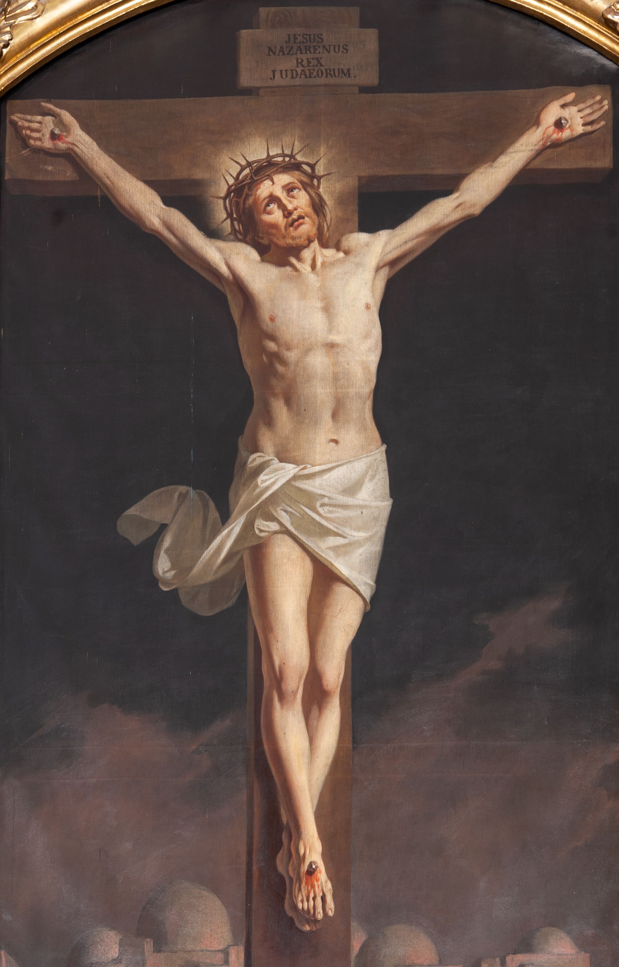Zbawiciel ukazany został jako „Christus triumphans”, jego śmierć przekracza ludzki wymiar, jest ponadczasowa, łączy Ziemię z Niebem. Jezus nie zwisa bezwładnie, martwy, lecz trwa w boskim uniesieniu. Osamotniony kieruje wzrok w stronę nieba, ku Ojcu.