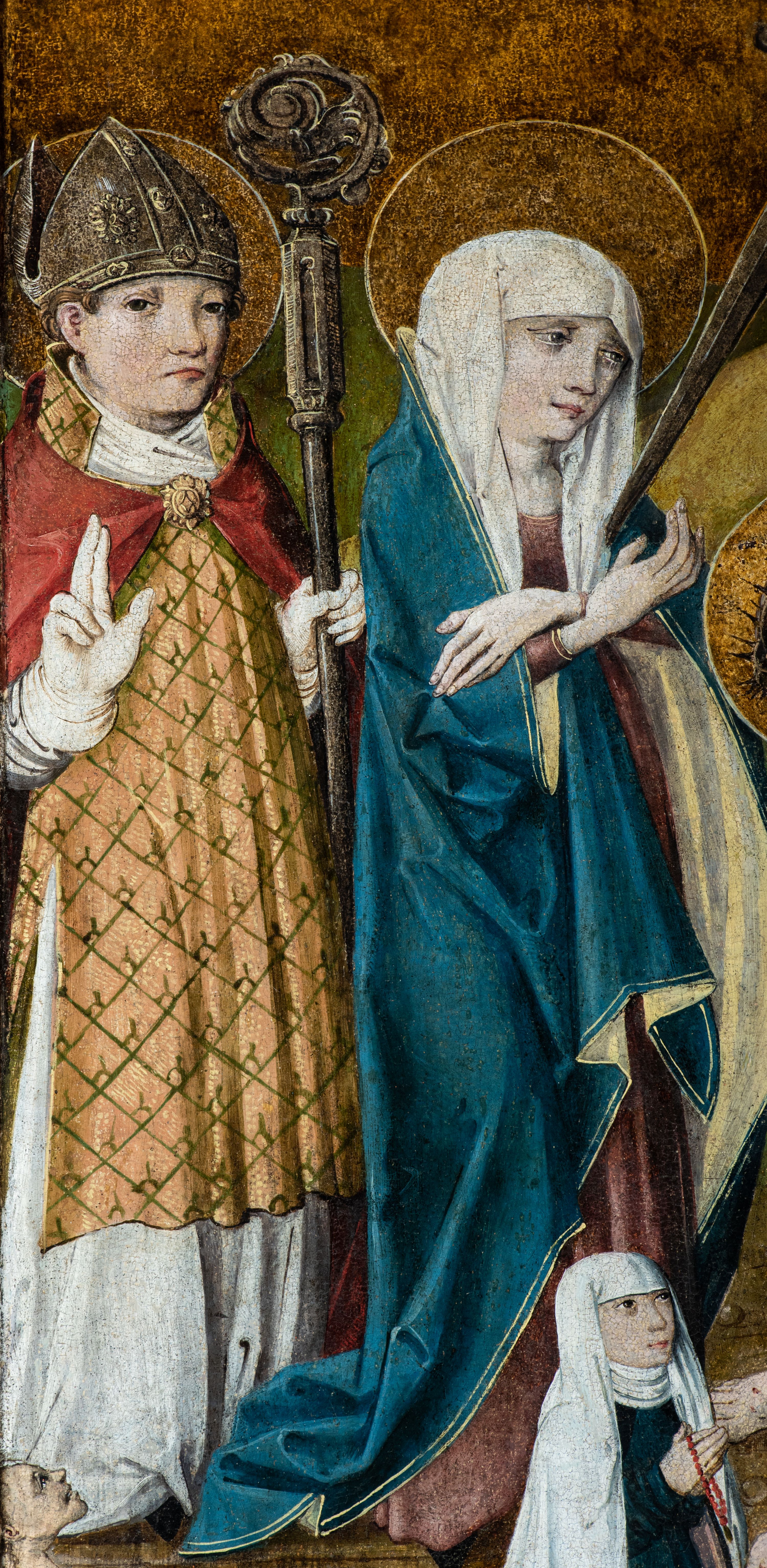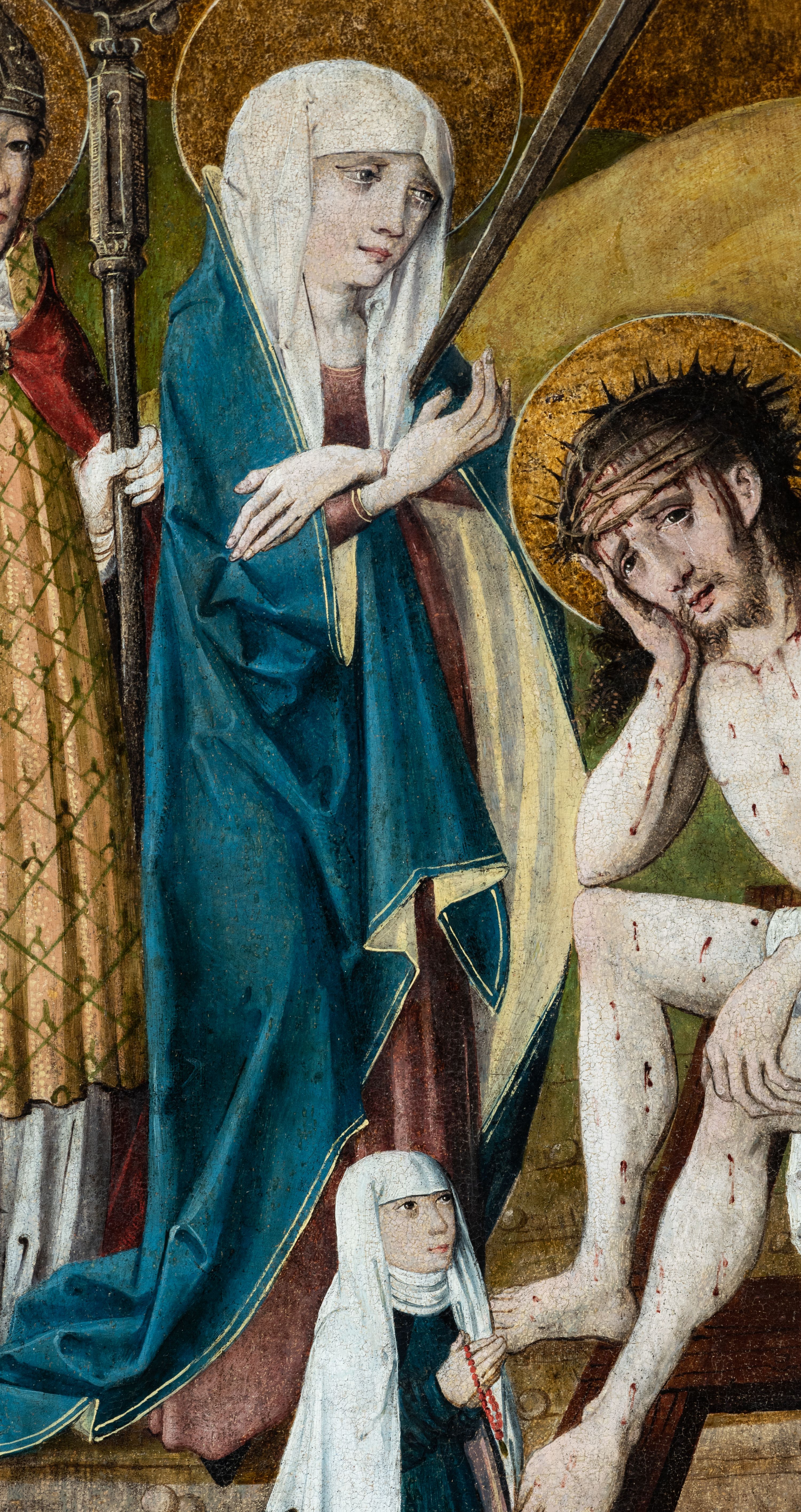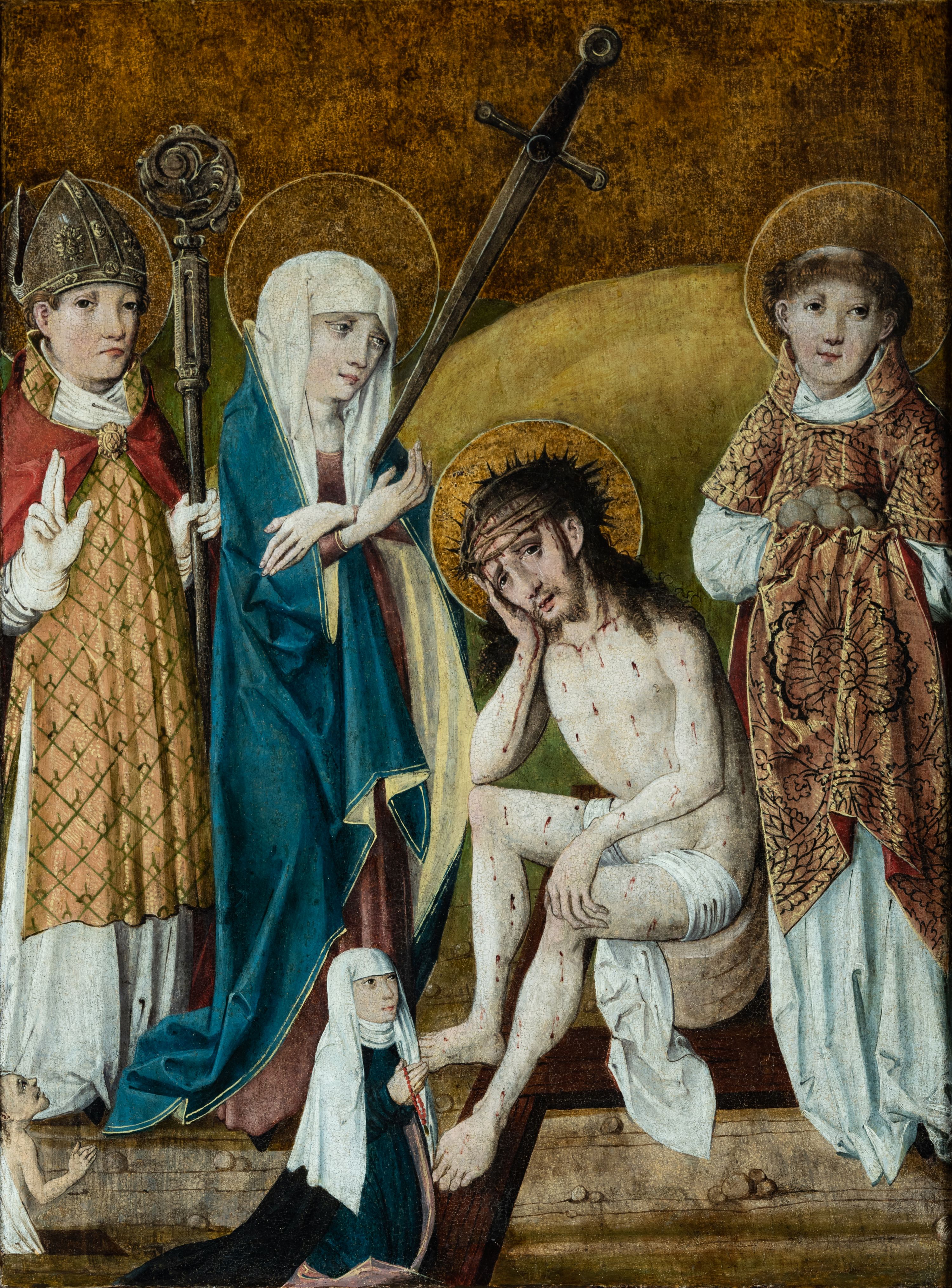 Obraz w kształcie stojącego prostokąta przedstawia Jezusa oczekującego na ukrzyżowanie w otoczeniu Matki Boskiej, św. Stanisława z Piotrowinem, św. Szczepana oraz ukazanej w mniejszej skali postaci kobiecej — fundatorki obrazu. W centrum kompozycji ukazany Chrystus siedzący na kamieniu, przedstawiony całopostaciowo z ciałem zwróconym w trzech czwartych w lewo. Prawą dłonią podpiera pochyloną nieznacznie do dołu głowę, lewą wspiera na kolanie. Twarz szczupła, podłużna, okolona ciemnobrązowym zarostem. Długie, kędzierzawe włosy opadają na ramiona i plecy postaci. Na głowie otoczonej złotym nimbem korona cierniowa, spod której spływają strużki krwi. Oczy otwarte, wpatrzone przed siebie nadające twarzy smutny, zamyślony wyraz. Chrystus ubrany jedynie w białe, wąskie perizonium owinięte luźno wokół bioder i ud. Ciało o jasnej karnacji z widocznymi śladami biczowania — na torsie, ramionach i nogach postaci widnieją krople krwi. Stopy Chrystusa wsparte są na ramionach krzyża ukazanego w dolnej części kompozycji. Po lewej stronie przedstawione stojące postaci Matki Boskiej Bolesnej oraz św. Stanisława biskupa. Obie ukazane całopostaciowo z ciałem zwróconym w trzech czwartych w prawo. Maria przedstawiona jako dojrzała kobieta w długiej, czerwonej sukni okrytej obszernym, ciemnogranatowym płaszczem z żółtą podszewką oraz białej chuście na głowie. Ręce postaci o długich, szczupłych palcach skrzyżowane na wysokości piersi, w którą wbity miecz. Twarz o jasnej karnacji, dużych, jasnych oczach, prostym nosie i niewielkich zaznaczonych czerwienią ustach. Wzrok skierowany na Chrystusa. Nieco za Marią przedstawiony św. Stanisław ubrany w szaty pontyfikalne: albę, na której złocona dalmatyka dekorowana wzorem ukośnej kratki oraz czerwona kapa spięta pod szyją złotą klamrą. Pod szyją widoczny humerał, na dłoniach białe rękawiczki. Na otoczonej złotym nimbem głowie srebrna infuła. Twarz o jasnej karnacji, pozbawiona zarostu. Oczy skierowane przed siebie, w kierunku widza. Święty prawą dłonią wykonuje gest błogosławieństwa, lewą wspiera na pastorale o dekorowanej akantem krzywaśni. W lewym, dolnym rogu obrazu, u stóp św. Stanisława przedstawiona niewielka postać ukazanego z profilu, klęczącego Piotrowina w białej szacie. Z prawej strony kompozycji, nieco z tyłu ukazany św. Szczepan. Święty przedstawiony całopostaciowo, frontalnie, jako młody mężczyzna o owalnej twarzy pozbawionej zarostu; jasnobrązowe włosy z widoczną tonsurą; uszy nieco odstające. Twarz o łagodnym, zamyślonym wyrazie z oczami skierowanymi przed siebie, w kierunku widza. Głowę otacza złoty nimb. Postać ubrana w długą, obficie fałdowaną albę, na której bogato zdobiona ornamentem roślinnym (owoce granatu) złota dalmatyka; wokół szyi biały humerał. W dłoniach okrytych połą dalmatyki święty oburącz podtrzymuje kilka okrągłych kamieni. W dolnej części kompozycji, na pierwszym planie przedstawiona w mniejszej skali postać klęczącej fundatorki. Kobieta ubrana w długą ciemną suknię z białą podwiką wokół szyi i głową okrytą długim, białym welonem. Postać kieruje wzrok ku twarzy Chrystusa, ręce składa na wysokości piersi w geście modlitwy; wokół dłoni przepleciony koralowy różaniec. Na dalszym planie kompozycji widoczny pagórkowaty krajobraz na jednolitym, ugrowym tle. Kolorystyka ciepła, ciemna z mocniejszymi akcentami złota, czerwieni oraz ciemnego granatu.