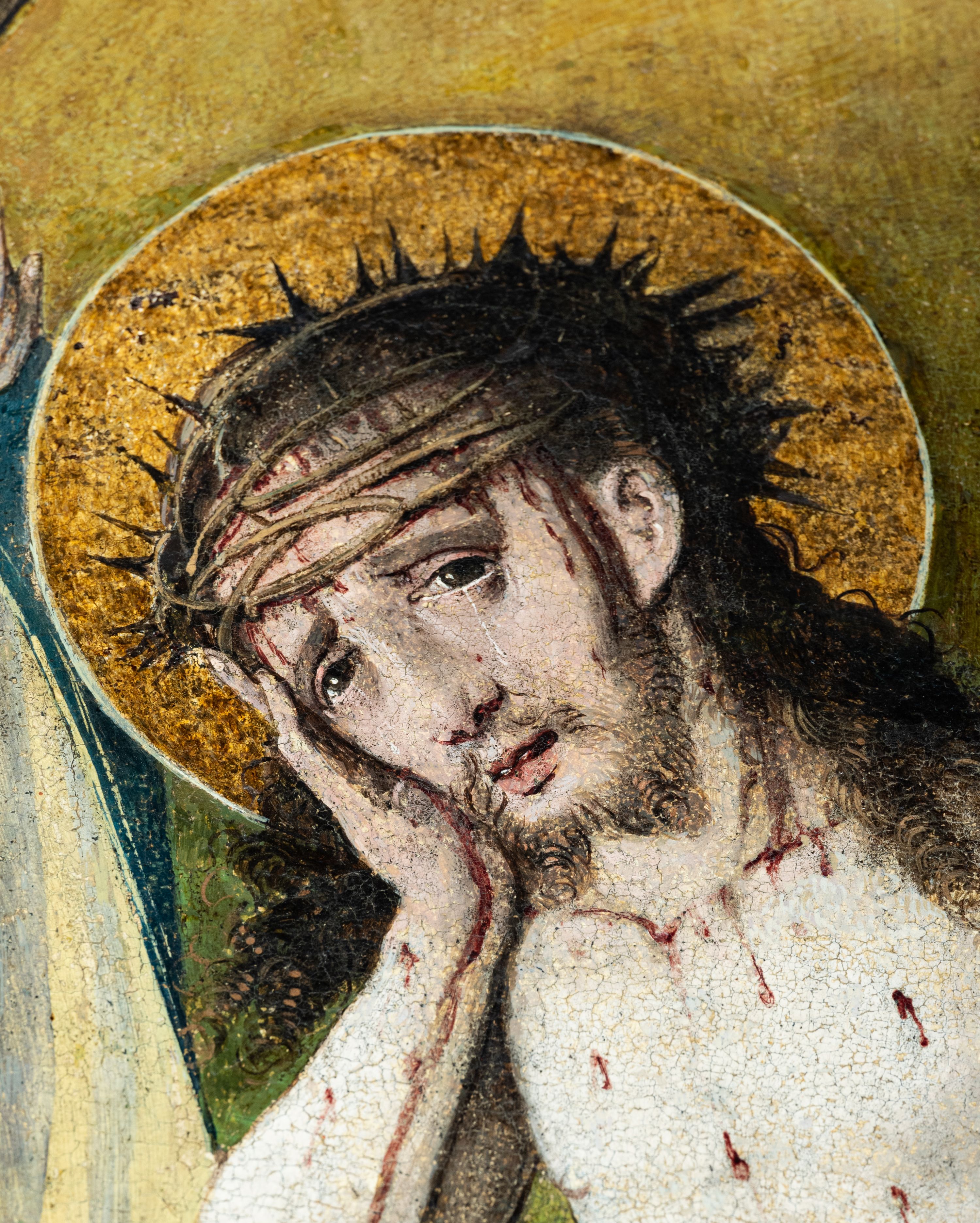 Obraz przedstawiający Chrystusa Oczekującego na Mekę został wykonany około 1510-1515 roku w warsztacie małopolskim, najprawdopodobniej przez krakowskiego malarza Marcina Czarnego lub jego syna Mikołaja, również malarza. Fundatorką dzieła była anonimowa kobieta stanu szlacheckiego, najpewniej wdowa, przedstawiona w dolnej części kompozycji. Obraz pełnił funkcję wizerunku wotywnego tj. ufundowanego jako wotum błagalne lub dziękczynne za otrzymane przez donatora łaski. Przedstawienie Chrystusa obnażonego z szat, z cierniową koroną na głowie i ciałem pokrytym krwawym potem, który siedząc na skale oczekuje na mękę nie wywodzi się z tekstu ewangelii. Na popularyzację tematu w małopolskim malarstwie tablicowym początku XVI wieku wpływ miała współczesna literatura dewocyjna opowiadająca historię męki Pańskiej, m.in. wydane w 1507 roku w norymberskiej oficynie Ulryka Pindera i: „Speculum passionis domini Ihesu Christi” oraz nieco późniejsze, bo spisane w drugiej ćwierci XVI wieku, i „Rozmyślania dominikańskie”. W obu dziełach pojawia się opis ostatnich przed Ukrzyżowaniem chwil Chrystusa, który oczekując na mękę miał przysiąść na kamieniu „gdy krzyż dla niego przygotowywano”. Podobne ujęcia tematu można odnaleźć na predelli ołtarza w kościele w Sromowcach Niżnych oraz na jednej w kwater poliptyku pochodzących z kościoła w Szydłowcu, który zdaniem Jerzego Gadomskiego mógł powstać w tym samym warsztacie co omawiane dzieło. Centralną pod względem kompozycyjnym, ale i ideowym postacią obrazu jest Chrystus. Towarzysząca mu Maria, ukazana w typie Matki Boskiej Bolesnej, której pierś przenika „miecz boleści” odnoszący się do proroctwa starca Symeona wypowiedzianego podczas ofiarowania Chrystusa w świątyni. Symeon, słowami „A Twoją duszę miecz przeniknie” zapowiedział cierpienie Marii, a tym samym przyszłą mękę Chrystusa. Postaci dwóch świętych męczenników biskupa Stanisława i diakona Szczepana odnoszą się zapewne do fundatorki obrazu, która mogła mieć wpływ na program ikonograficzny dzieła. Dzieło było kilkukrotnie konserwowane. W latach 1957-1958 pzez krakowski PKZ oraz w 1995 roku przez Małgorzatę Schuster-Gawłowską z Akademii Sztuk Pięknych w Krakowie.