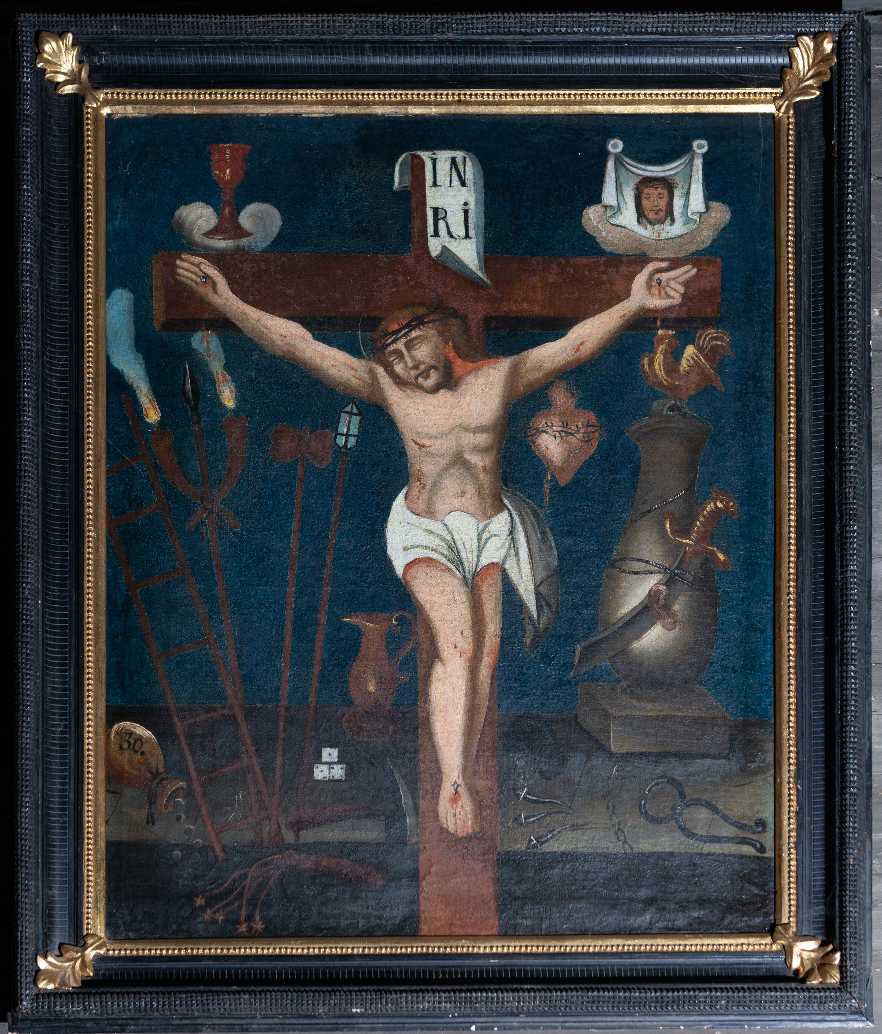 Szczególne zwrócenie uwagi na cierpienia, jakie kolejno zadawano Jezusowi spowodowało wykształcenie się nabożeństwa do Pięciu Ran Jezusa, a w związku z tym samodzielnych przedstawień ikonograficznych narzędzi Męki Pańskiej, które spopularyzowały się od XV wieku dzięki produkcji drzeworytów. W dobie sztuki nowożytnej przedstawienia Arma Christi pojawiały się w licznych kompozycjach alegorycznych, często także towarzyszyły wizerunkom Jezusa Ukrzyżowanego. Zastosowany w ten sposób obrazowy skrót umożliwia rozważanie kolejnych etapów Męki. Przedstawiona na malowidle Judaszowa sakiewka z trzydziestoma srebrnikami, „kielich cierpienia”, pochodnie oraz miecz z odciętym uchem Malchusa odnoszą się do wydarzeń w Ogrodzie Oliwnym. Kogut i mosiężny dzban przywołują postaci św. Piotra i Piłata. Do policzkowania Jezusa podczas przesłuchiwań nawiązuje rękawica. Kamienny słup i leżące pod krzyżem flagellum, czyli bicz z wiązką zakończonych haczykami rzemieni to znaki kary ubiczowania, jaka poprzedzała wyrok śmierci. Korona cierniowa to wspomnienie publicznej hańby, na jaką wystawiono Jezusa, natomiast chusta św. Weroniki przywołuje wydarzenia z drogi na Golgotę. Gwoździe, młotek, krzyż i titulus wraz z trzciną z nasączoną w occie gąbką i kośćmi do gry wiążą się z ostatnimi cierpieniami i wydarzeniami przed śmiercią Jezusa. Historię cierpienia domykają włócznia i gorejące serce oraz drabina i obcęgi odnoszące się do sylwetek św. Longina z Cezarei Kapadockiej i Józefa z Arymatei.