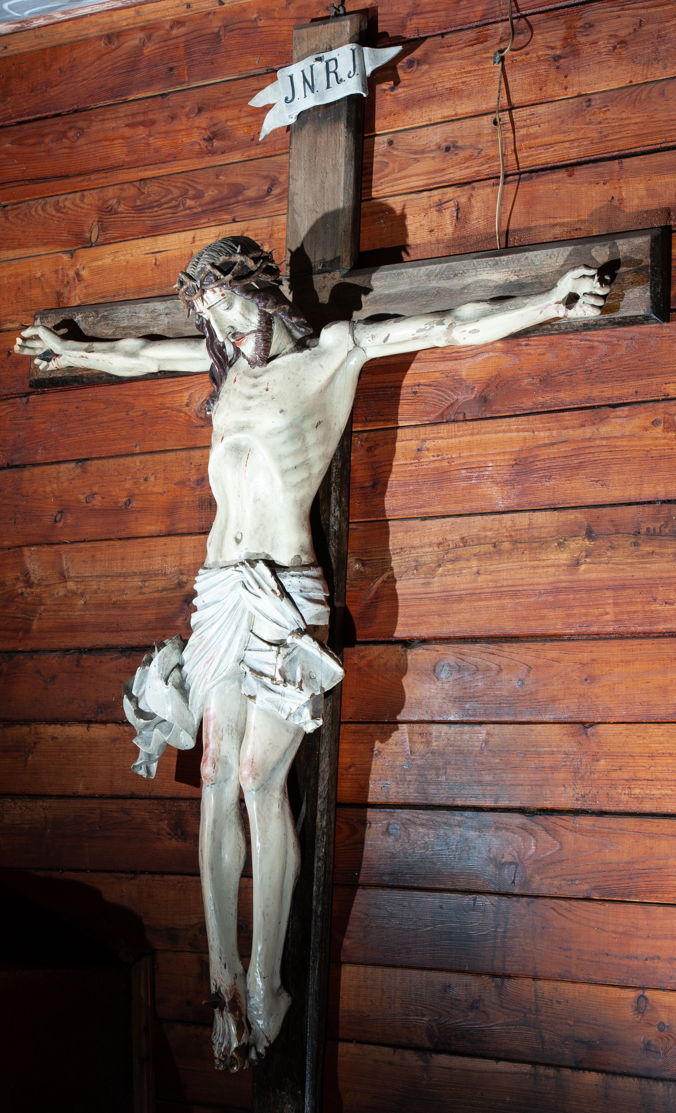 Chrystus rozpięty na krzyżu z głową opuszczoną na pierś, z wyprostowanymi poziomo rękami i wyprostowanymi nogami, ze stopami założonymi prawa na lewą i przybitymi jednym gwoździem. Ciało wychudzone, z podkreśloną budową anatomiczną i naprężoną muskulaturą, z rozdętą klatką piersiową i wklęsłym brzuchem. Twarz pociągła, z długim nosem i zapadniętymi policzkami, okolona krótką brodą i włosami opadającymi na barki, z pasmem włosów spływającym na prawy obojczyk. Na włosy nałożona korona cierniowa upleciona z dwóch cienkich gałązek. Wokół bioder perizonium przewiązane z przodu, po lewej stronie brzucha, z dwoma dekoracyjnie udrapowanymi i rozwianymi końcami. Na górnej belce krzyża ułożony poziomo titulus o kształcie lekko pofałdowanej wstęgi z końcami wyciętymi w jaskółczy ogon, z literami : J. N. R. J. Karnacja ciała w jasnym odcieniu, włosy i broda brązowe, perizonium i titulus białe, krzyż w kolorze naturalnego drewna.