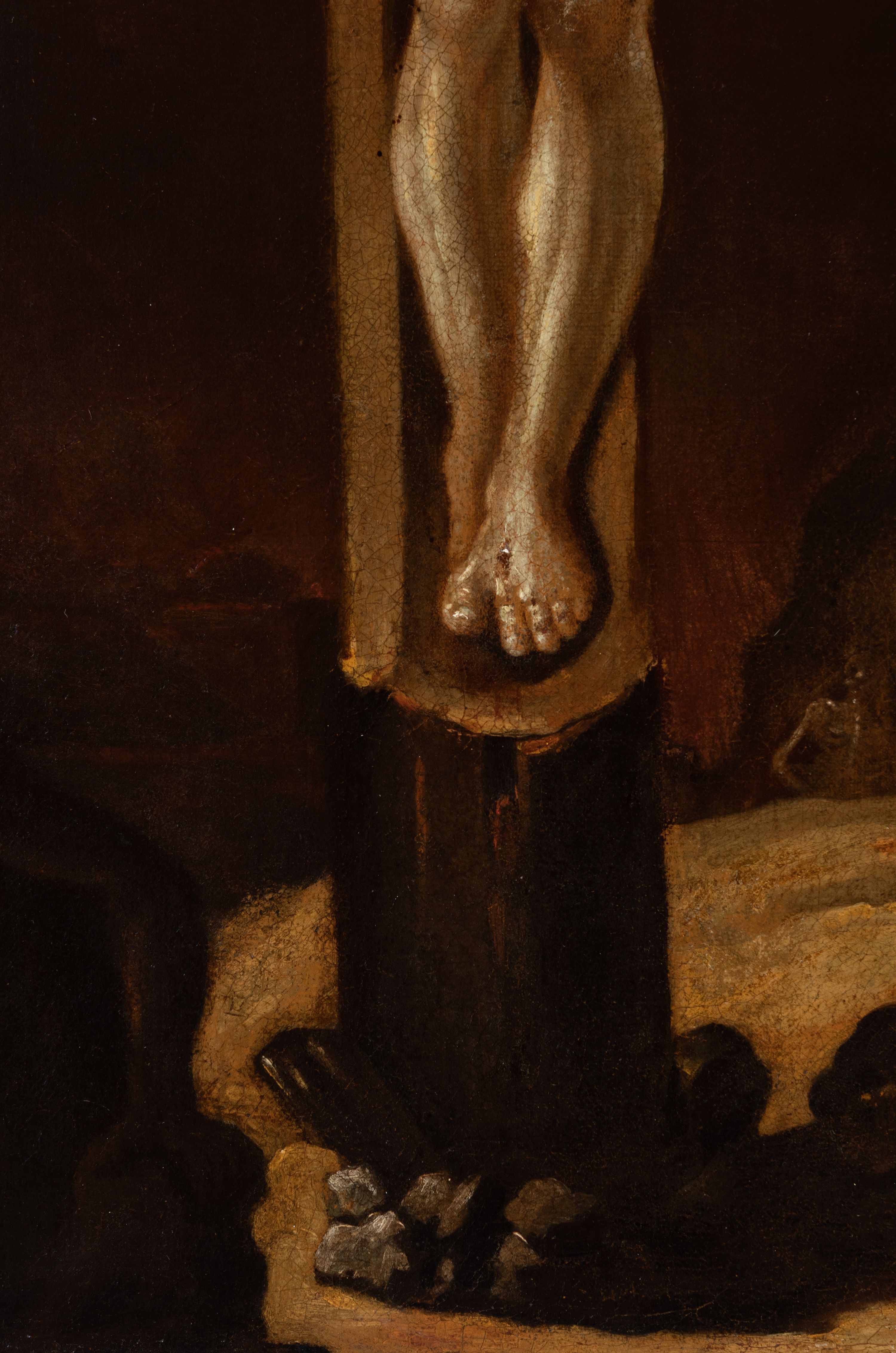 Obraz w formie stojącego prostokąta. W centrum krzyż o prostym zakończeniu belek z przybitą do niego trzema gwoździami postacią żyjącego Chrystusa. Ciało w lekkim zwisie, o szeroko rozłożonych ramionach, układających się łukowato, z uniesioną głową skierowaną w prawo, stopy skrzyżowane w układzie lewa na prawą. Twarz Chrystusa wychudzona, ze szklistymi oczami skierowanymi w górę, prostym nosem i pełnymi ustami; okolona krótką brodą i brązowymi włosami opadającymi na ramiona. Na głowie korona cierniowa. Ciało szczupłe, muskularne, zwłaszcza w partii ramion i nóg. Przez biodra ma przewiązane białe, krótkie, opadające perizonium, zawiązane na prawym boku, z rozwianym zwisem tkaniny. Pionowa belka krzyża zakończona tabliczką z napisem „IN /RI”, u dołu krzyża leży czaszka. W lewym dolnym rogu obrazu niewyraźna, wstająca postać. W prawym dolnym rogu kilka zarysowanych sylwetek postaci oraz kościotrupów na tle płomieni (dusze czyścowe?). Scena na tle brunatnego, cieniowanego nieba, z widocznym zaćmionym słońcem przy górnej krawędzi obrazu. Dzieło ujęte złoconą ramą, dekorowaną ornamentem geometrycznym i rozetami.