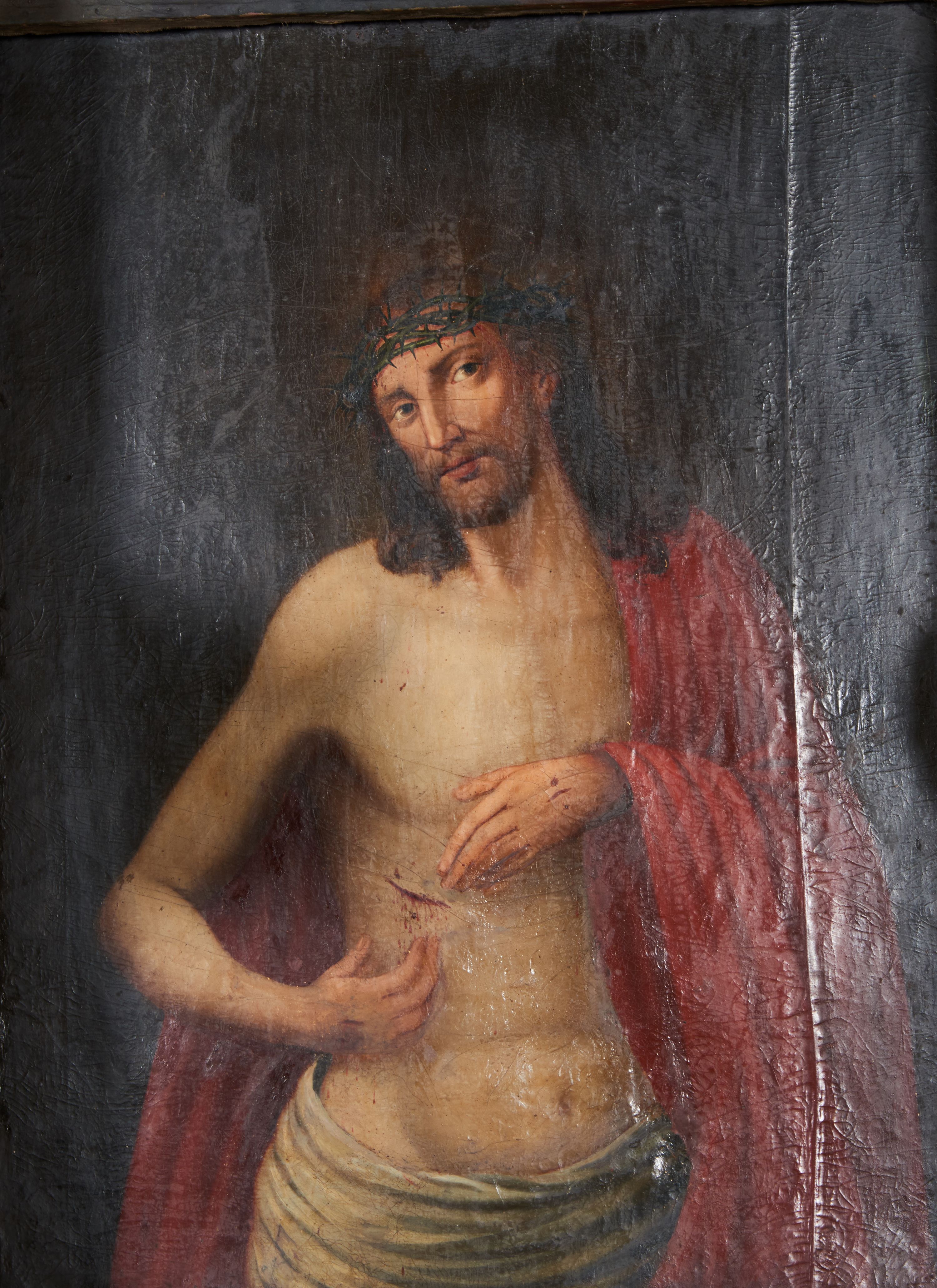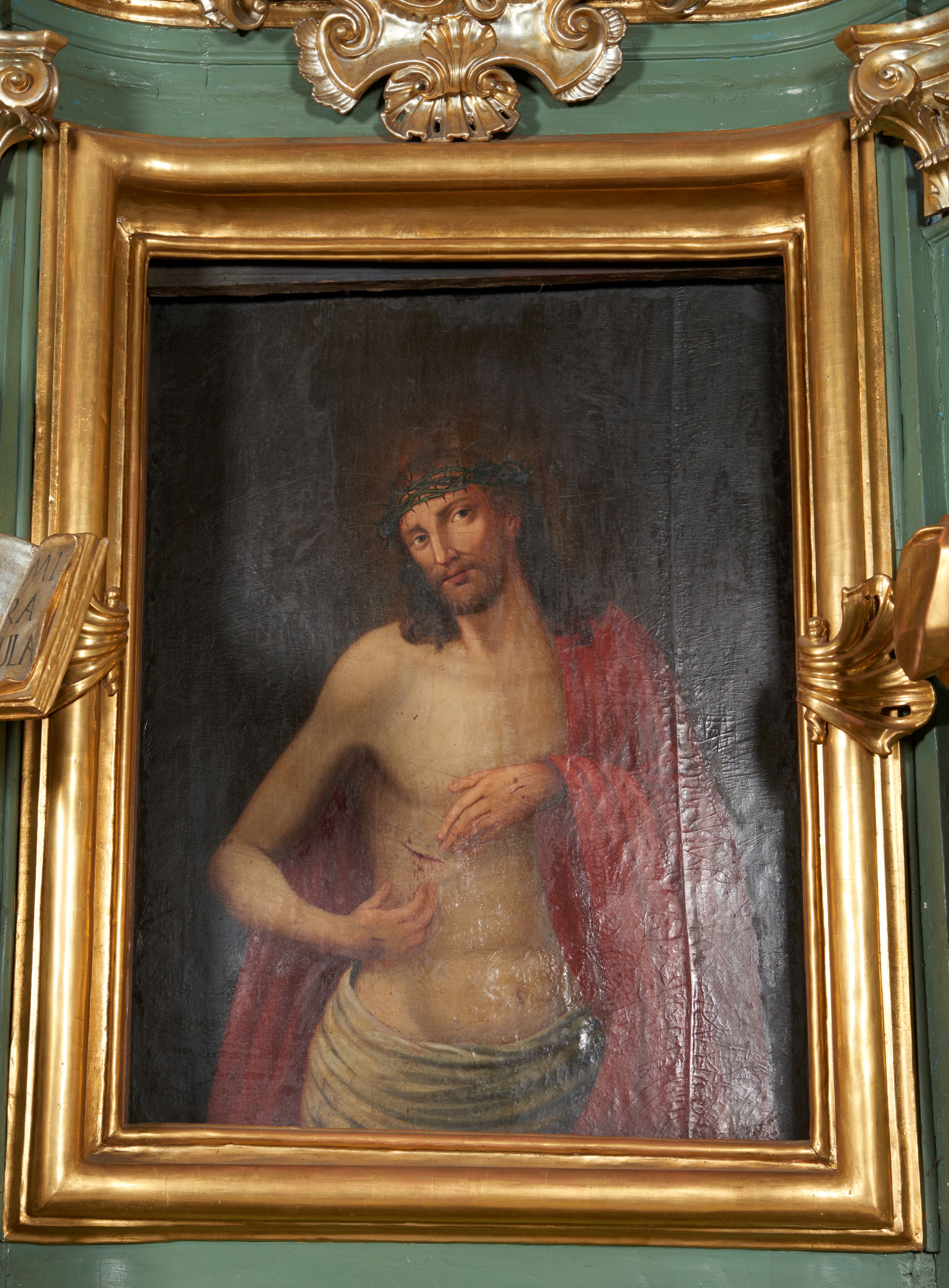 Obraz w formie stojącego prostokąta. Chrystus przedstawiony w półpostaci, zwrócony w trzech czwartych w lewo, z głową przechyloną na prawe ramię, obiema rękami wskazuje na ranę w prawym boku. Twarz podłużna, modelowana światłocieniem, o migdałowatych oczach, prostym nosie i pełnych ustach, okolona jasną, krótką brodą. Włosy brązowe, lekko kręcone, opadają na ramiona. Na głowie korona cierniowa. Chrystus w partii bioder przepasany białą, drapowaną tkaniną, na lewe ramię i plecy narzucony czerwony płaszcz. Ciało szczupłe, o miękkim modelunku światłocieniowym, delikatnie zarysowanym torsie, z zaznaczonymi śladami męki na dłoniach i prawym boku. Tło ciemnobrązowe, rozjaśnione wokół głowy postaci. Obraz utrzymany w ciepłej tonacji.