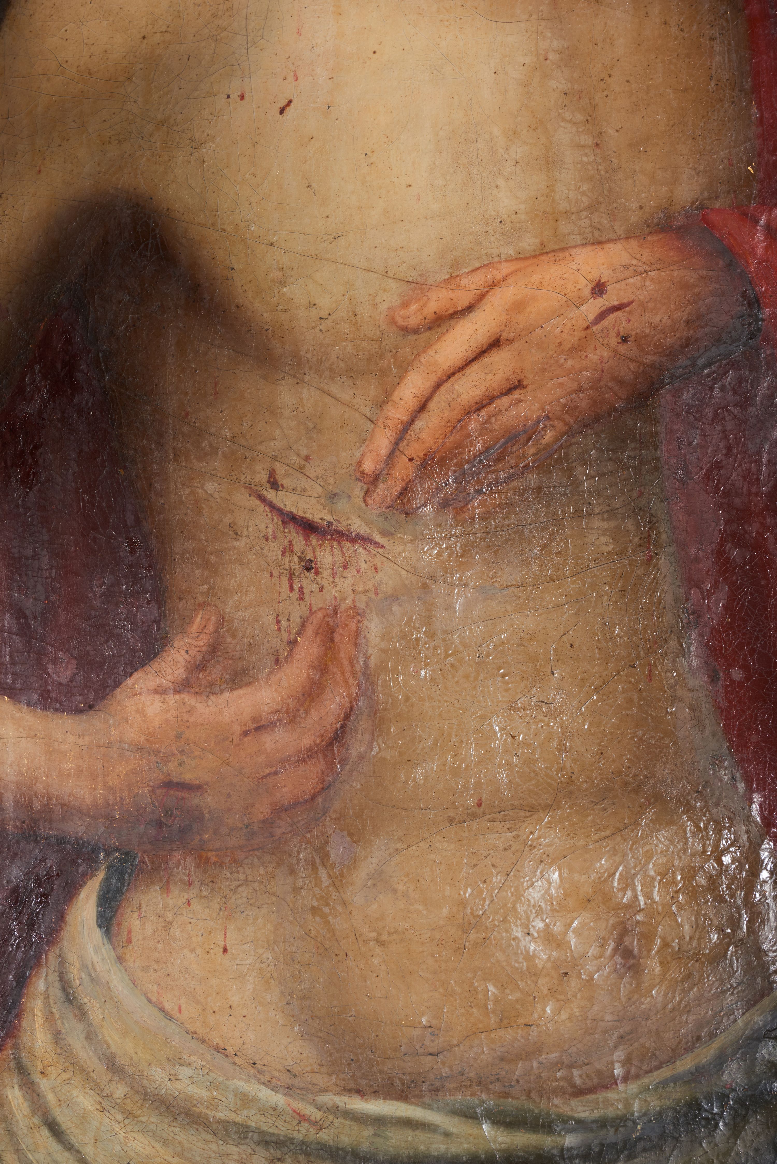 Delikatne zabrudzenia, krakelury, widoczne przecięcie i zszycie płótna przez całą wysokość obrazu. Obraz był odnawiany razem z całym ołtarzem w latach 1905, 1976-1979 i 1998.