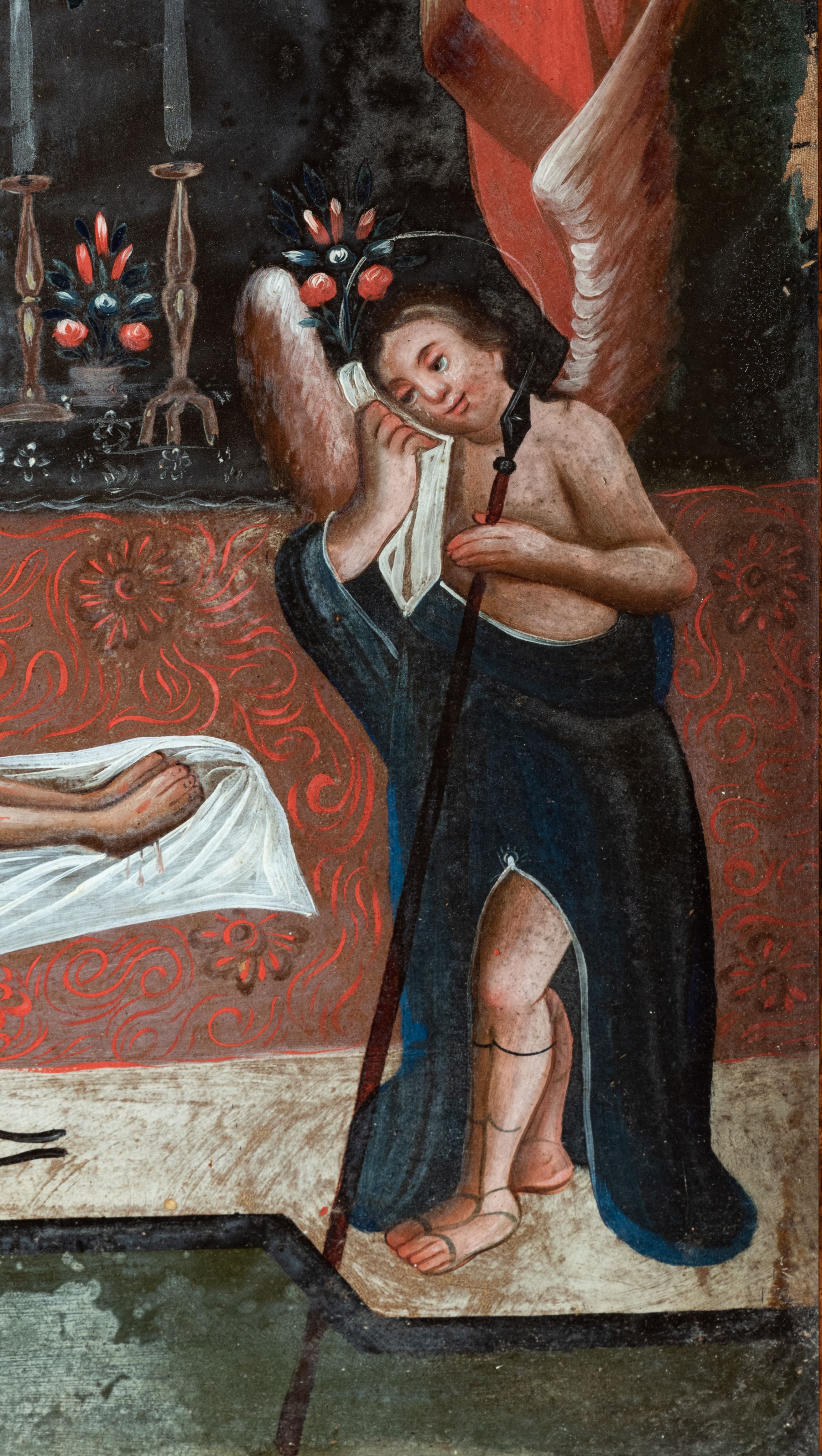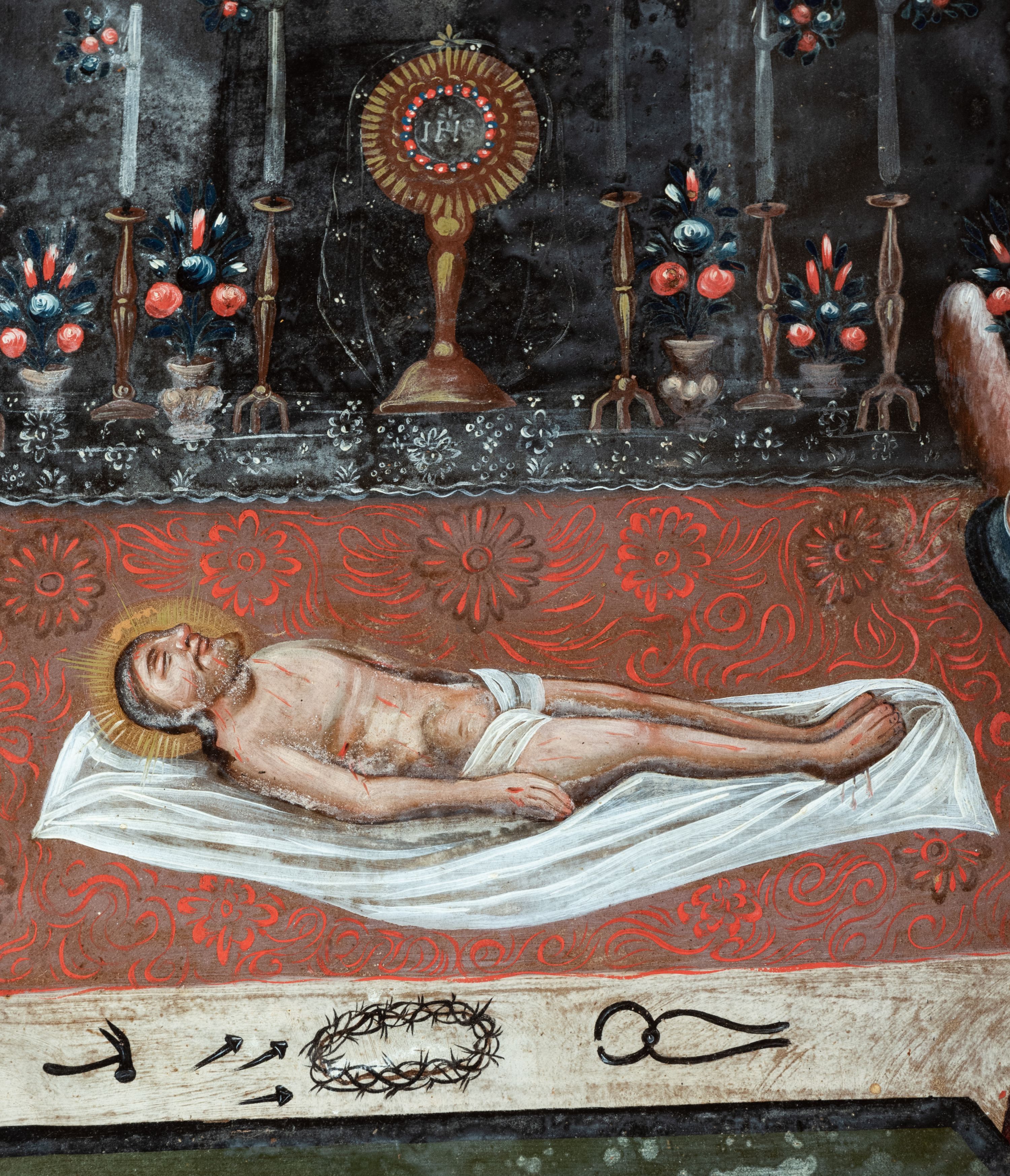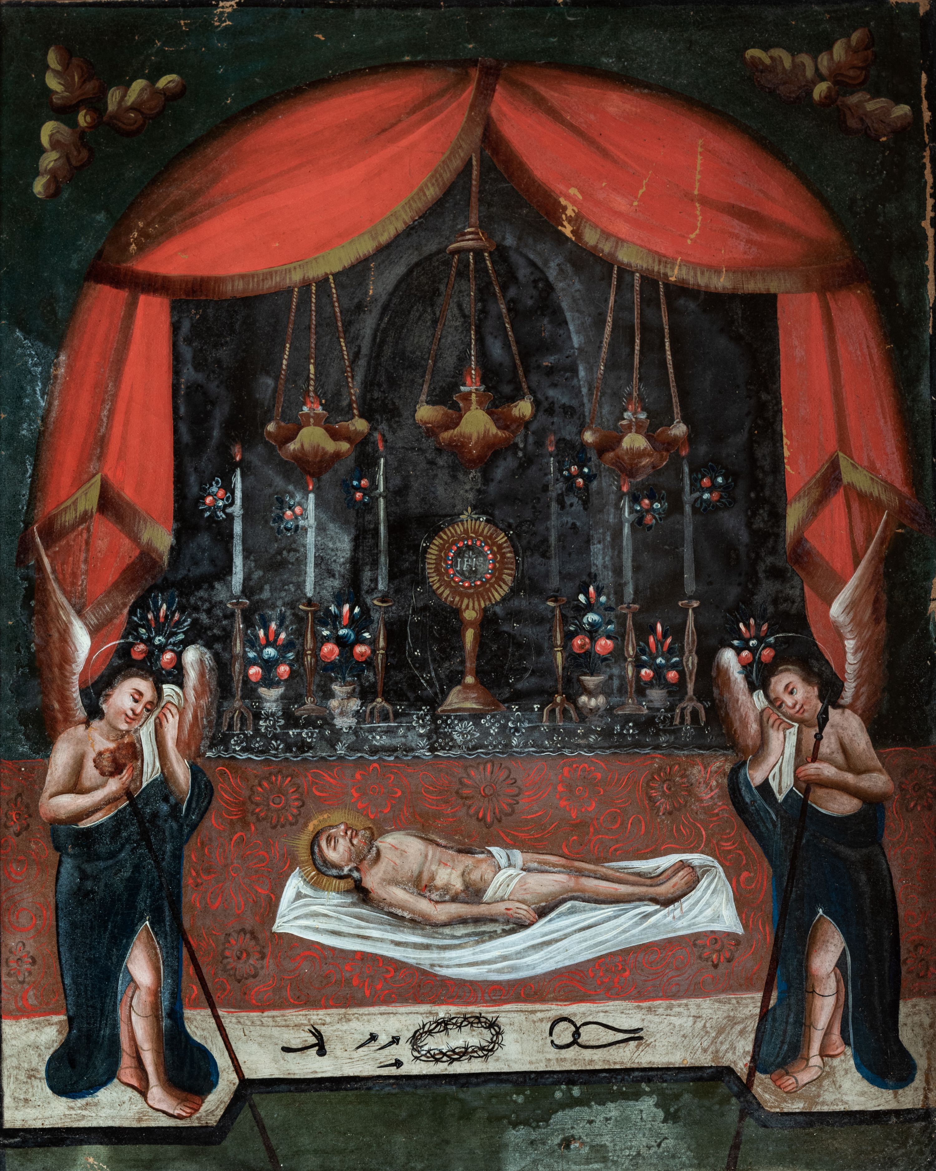 Obraz w kształcie stojącego prostokąta. Na osi kompozycji u dołu ukazane ciało Chrystusa zdjęte z krzyża i ułożone na białym całunie, który rozłożono na czerwonym podium z białym pasem od przodu; ramiona Chrystusa ułożone wzdłuż ciała. Głowa ujęta z prawego profilu, otoczona promienistym nimbem. Oczy zamknięte, włosy i broda siwe. Tors nagi z widoczną raną w boku, wokół bioder owinięte białe perizonium. Na pierwszym planie po bokach, na wyodrębnionych częściach podium ukazane postaci dwóch stojących naprzeciw siebie aniołów trzymających arma Christi. Anioł z lewej strony kompozycji prawą ręką podtrzymuje gąbkę zamieszczoną na długim drzewcu, gest lewej, zbliżonej do policzka, wyraża żal. Anioł z prawej strony obrazu w lewej ręce trzyma włócznię, prawą ręką wykonuje analogiczny gest jak anioł z lewej. Obie postaci przedstawione jako młodzieńcy o długich włosach ubrani w obszerne, granatowe płaszcze. U ich stóp, na białej części podium przedstawione pozostałe narzędzia męki Chrystusa: młotek, gwoździe, korona cierniowa i kleszcze. Na dalszym planie, w głębi kompozycji widoczna półkolista arkada udekorowana czerwoną draperią. Przedstawiono w niej ołtarz, na którym stoją monstrancja promienista z hostią, sześć lichtarzy oraz wazony z kwiatami. Nieco powyżej ukazane trzy podwieszone lampy wieczne w kolorze złotym. W górnych narożnikach, ponad arkadą dekoracyjne motywy zbudowane z trzech ulistnionych gałęzi. Kolorystyka ciemna, chłodna z dominacją szarości i czerni. Obraz oprawiony w ramę z szerokiej, wypukłej listwy zdobionej rodzajem pseudomarmoryzacji w odcieniach brązu.