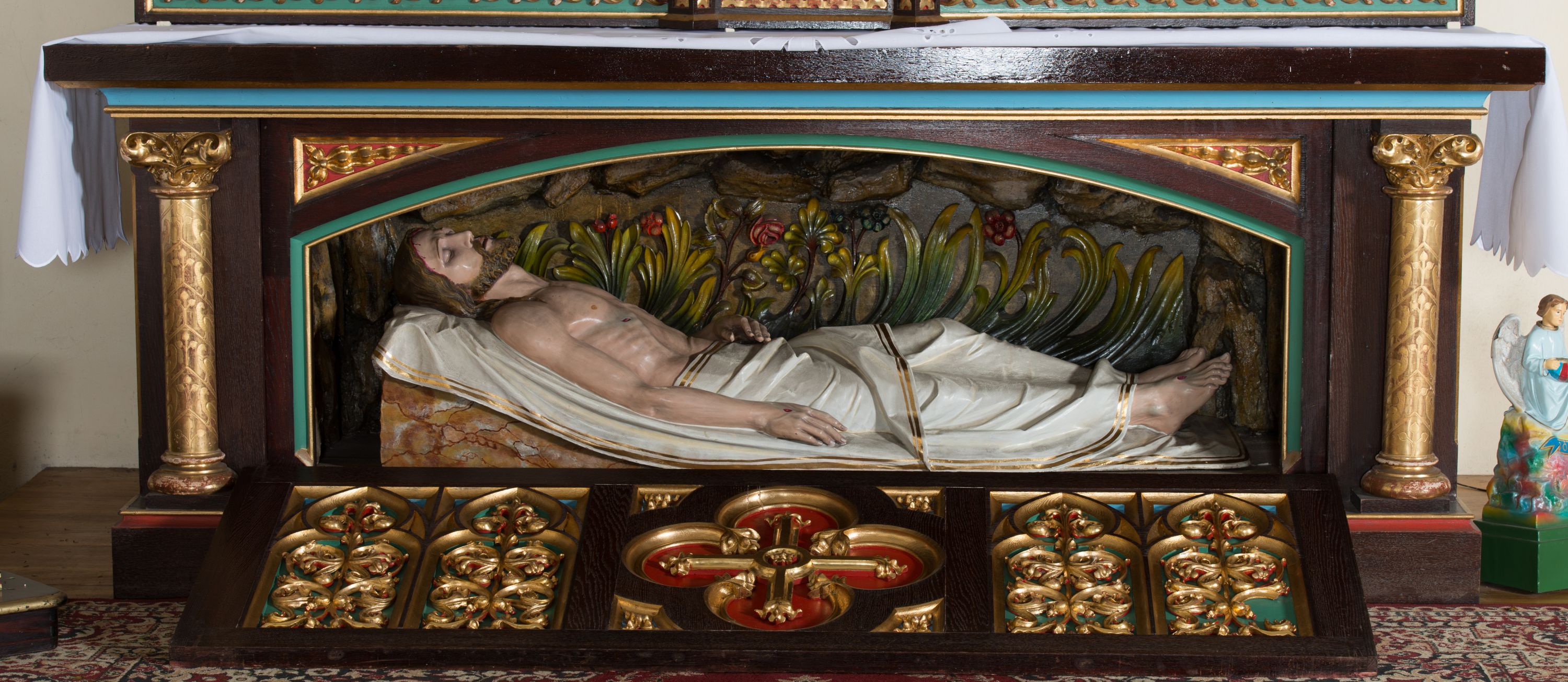 Figura umieszczona w mensie ołtarza bocznego, w niszy w formie leżącego prostokąta zamkniętego obniżonym łukiem koszowym, od przodu ujętej w profilowaną ramę. Chrystus leżący na plecach, ułożony na białych tkaninach, widoczny z prawego profilu. Głowa Jezusa lekko opada na prawe ramię; twarz pociągła, oczy zamknięte, nos prosty, lekko uchylone, wąskie usta. Twarz okolona zarostem, włosy długie, spod których widoczne strugi krwi. Prawa ręka ułożona wzdłuż ciała, lewa złożona na pasie. Lewa noga lekko ugięta, prawa wyprostowana. Nogi przykryte białym materiałem ze złotą lamówką, tors nagi. Widoczne ślady męki, polichromia w odsłoniętych partiach ciała naturalistyczna. Za Chrystusem płaskorzeźbione tło z bujną roślinnością i skałami.