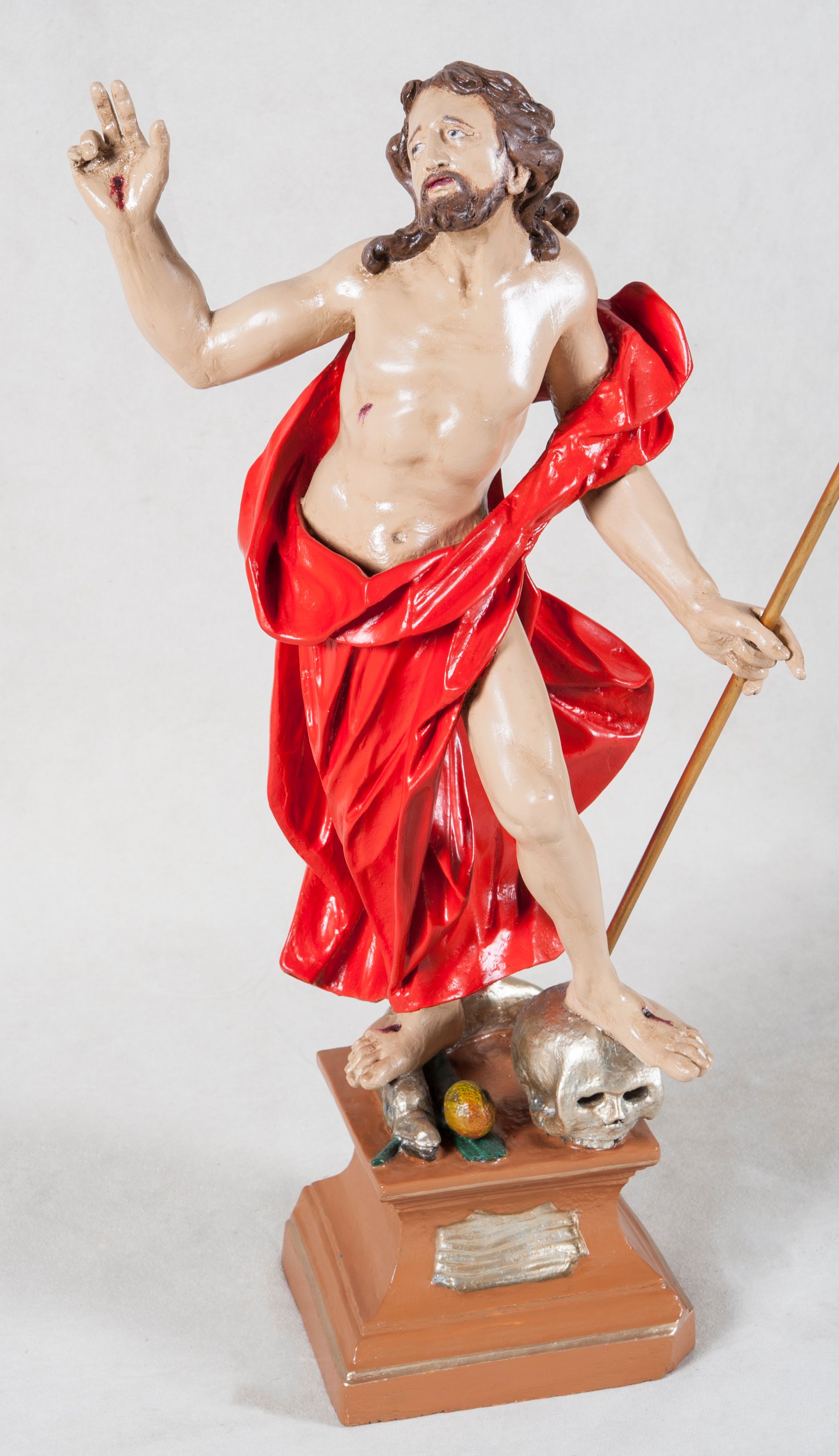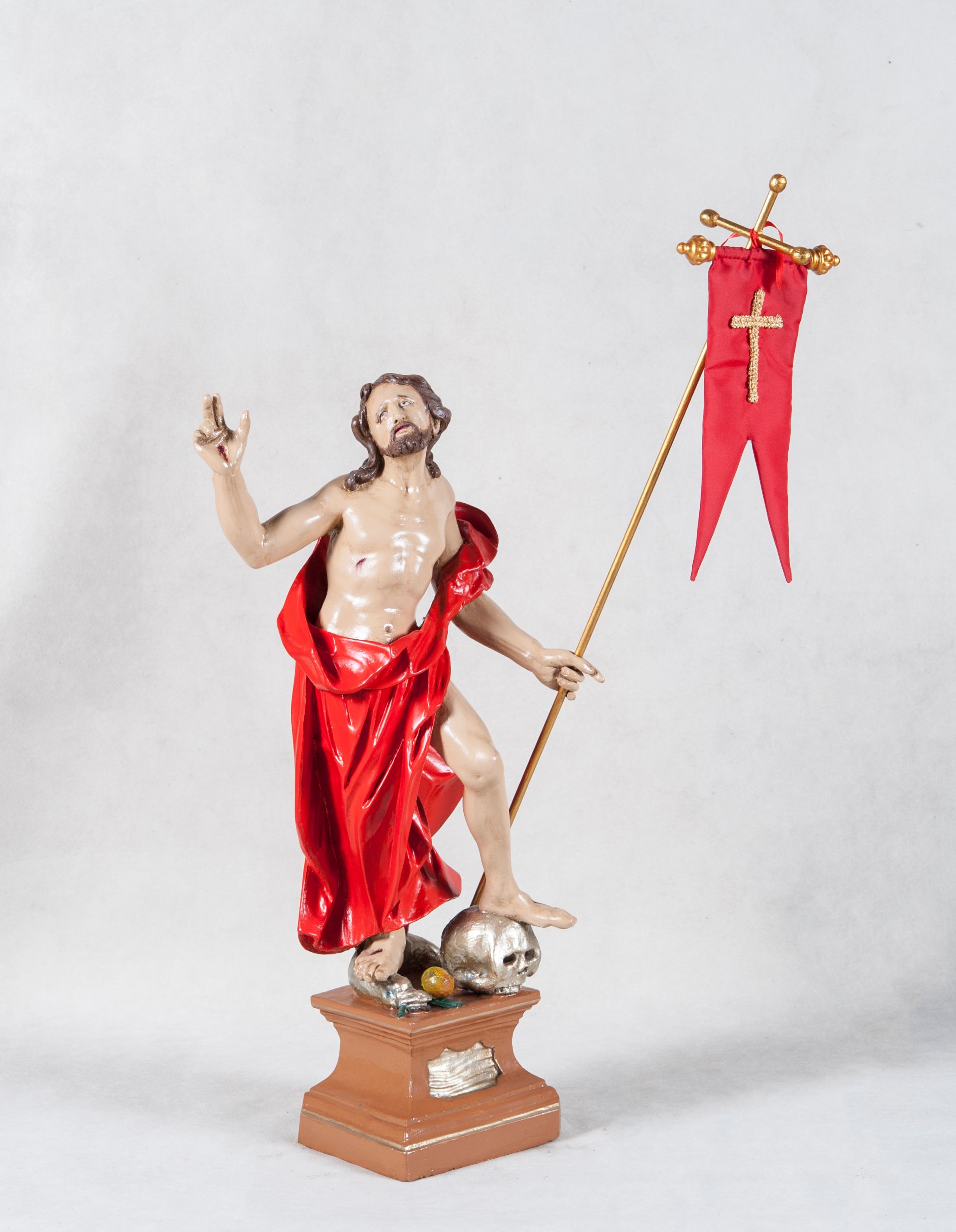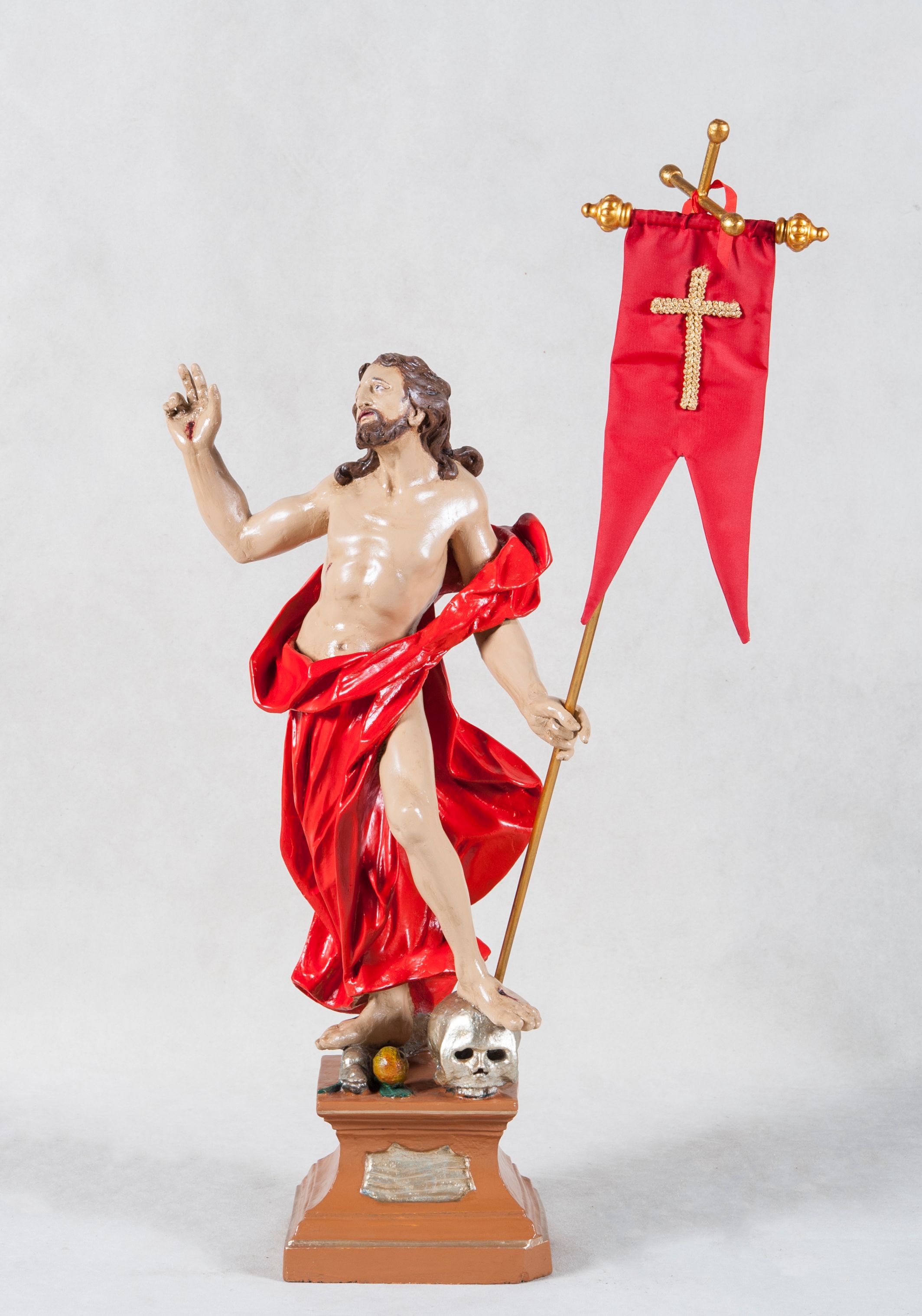 Moment zmartwychwstania Chrystusa nie został opisany w żadnej z Ewangelii, wiadomo jedynie, co stało się następnego poranka. Artyści skupiali się zatem na ukazaniu w tym przedstawieniu faktu zwycięstwa nad śmiercią. Od czasów baroku zmartwychwstały Chrystus wskazuje prawą ręką w stronę nieba i ten gest jest zapowiedzią nadchodzącego wniebowstąpienia. W drugiej ręce trzyma chorągiew triumfalną będącą właśnie znakiem jego zwycięstwa. Purpura płaszcza odnosi się do władzy, jest też ona kolorem Boga. Zestaw zastosowanych symboli świadczy o wyjątkowym znaczeniu zmartwychwstania Chrystusa dla historii religii. Rzeźba wykazuje cechy sztuki późnobarokowej – Chrystus został ukazany w skręcie, w dynamicznej pozie podkreślonej jeszcze wywijającym się fantazyjnie silnie drapowanym płaszczem.