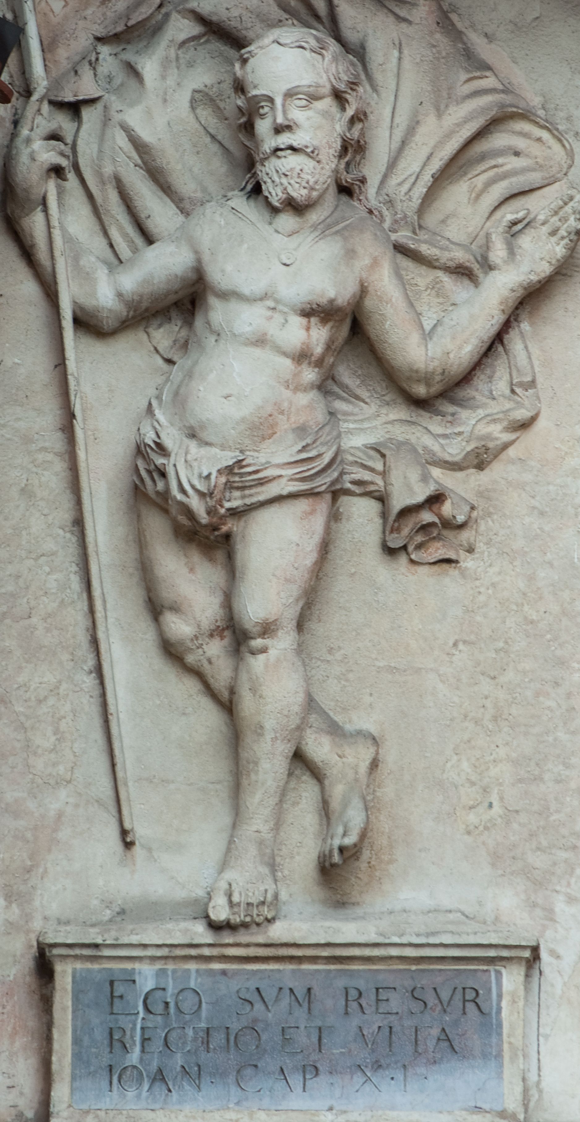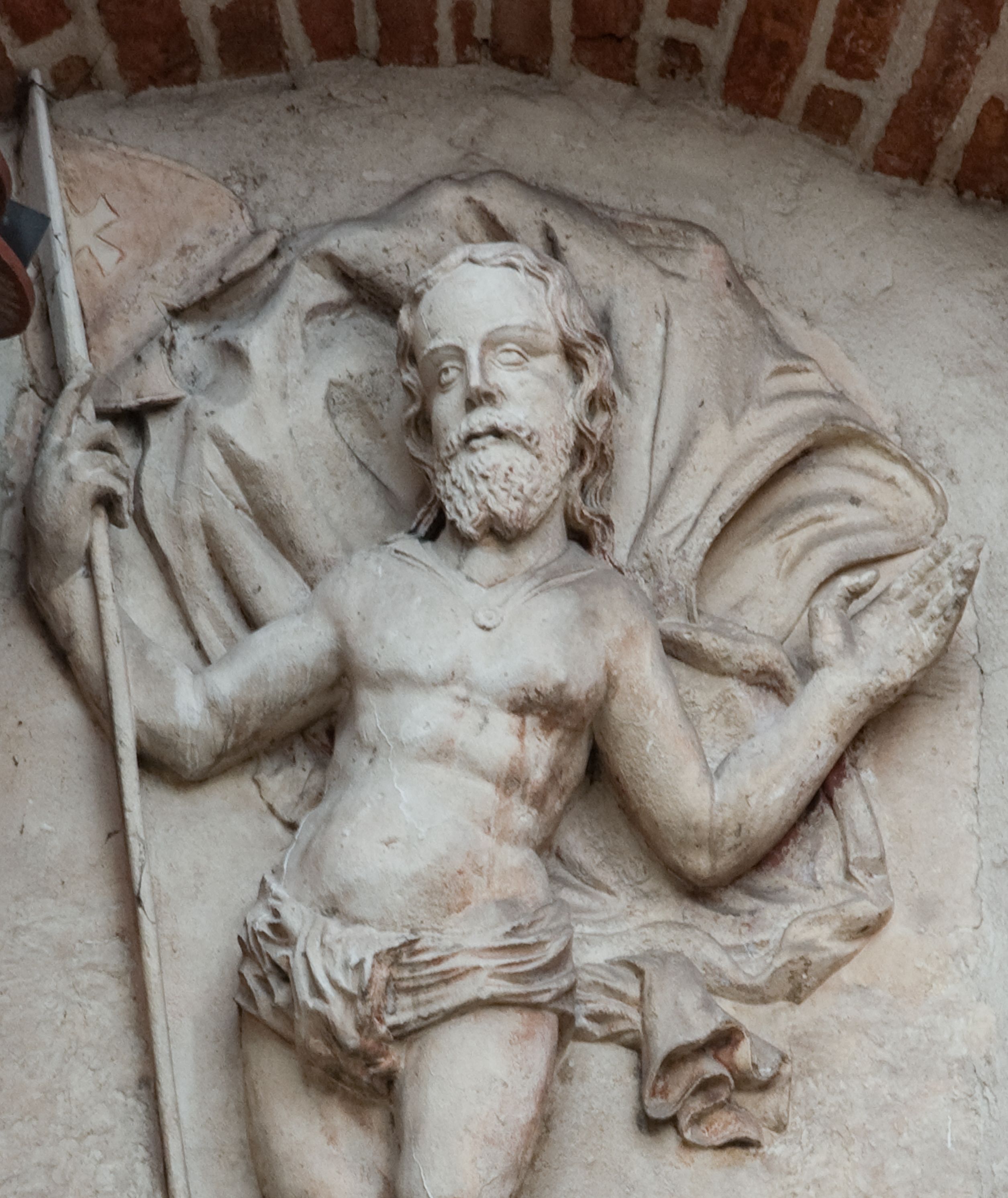 Płaskorzeźbione przedstawienie Chrystusa Zmartwychwstałego ukazanego w całej postaci, w trzech czwartych w prawo, w wykroku, z prawą nogą zgiętą w kolanie. W prawej, uniesionej ręce trzyma chorągiew z białym krzyżem na czerwonym tle, lewa uniesiona do góry w geście błogosławieństwa. Twarz owalna, pociągła, z migdałowatymi oczami i prostym nosem, okolona falowaną brodą i włosami sięgającymi ramion. Chrystus przez biodra ma przewiązane krótkie, obficie fałdowane perizonium, z rozwianym na lewym boku fragmentem. Pod szyją ma zapięty płaszcz rozwiany z tyłu postaci. Ciało krępe, muskularne, z podkreślonymi mięśniami klatki piersiowej. Postać umieszczona na profilowanym postumencie z tablicą z inskrypcją „EGO SVM RESVR/RECTIO ET VITA / IOAN(NES) CAP(UT) XI”.