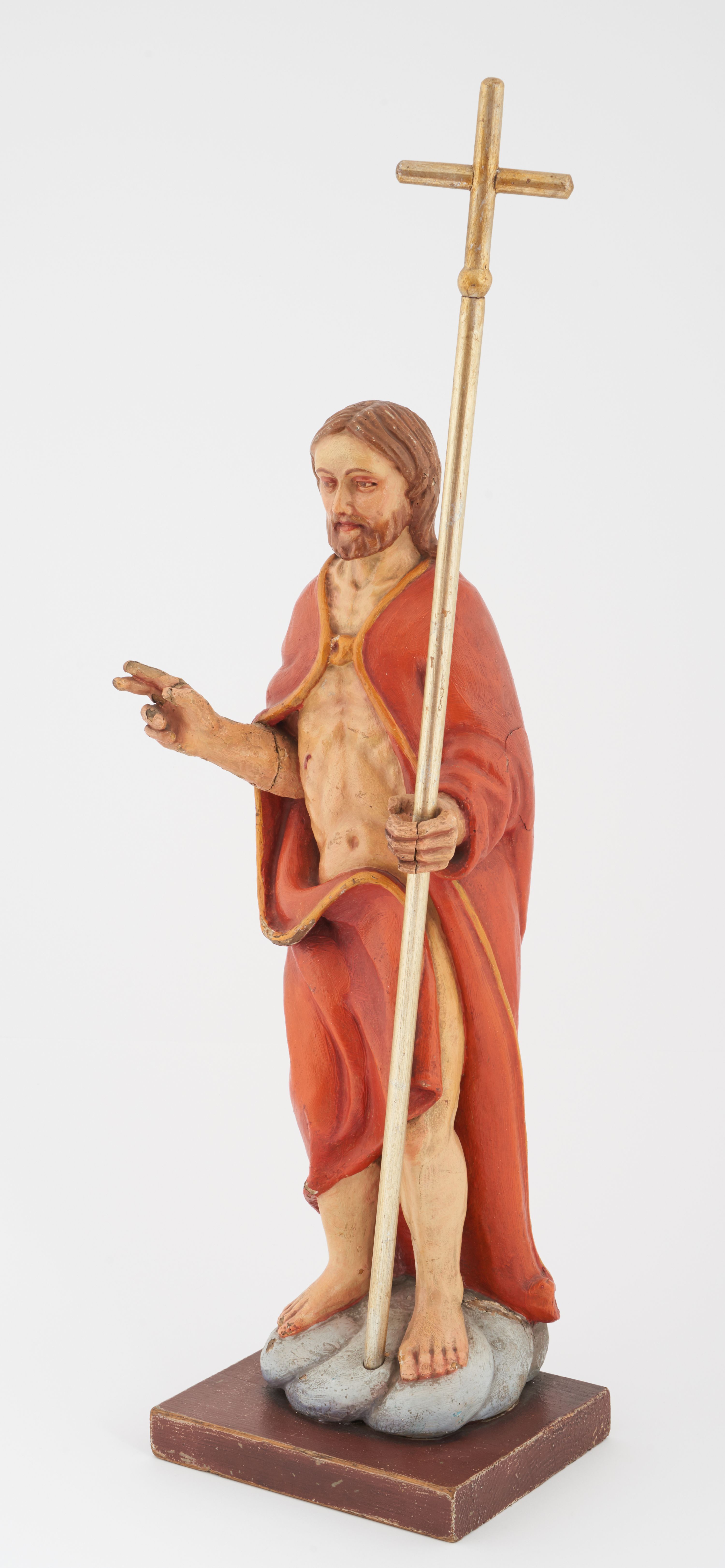 Pełnoplastyczna rzeźba Chrystusa Zmartwychwstałego stojącego na chmurze z prawą ręką wzniesioną w geście błogosławieństwa, lewą trzymającego krzyż na długim drzewcu. Twarz szeroka, z wydatnym nosem, ciemnobrązowymi oczami, ciemnoróżowymi ustami, okolona zarostem oraz włosami z przedziałkiem pośrodku głowy, opadającymi na plecy. Karnacja jasnobeżowa. Chrystus ukazany nagi, przesłonięty czerwonym płaszczem, spiętym na piersi, opadającym ukośnymi fałdami do ziemi.