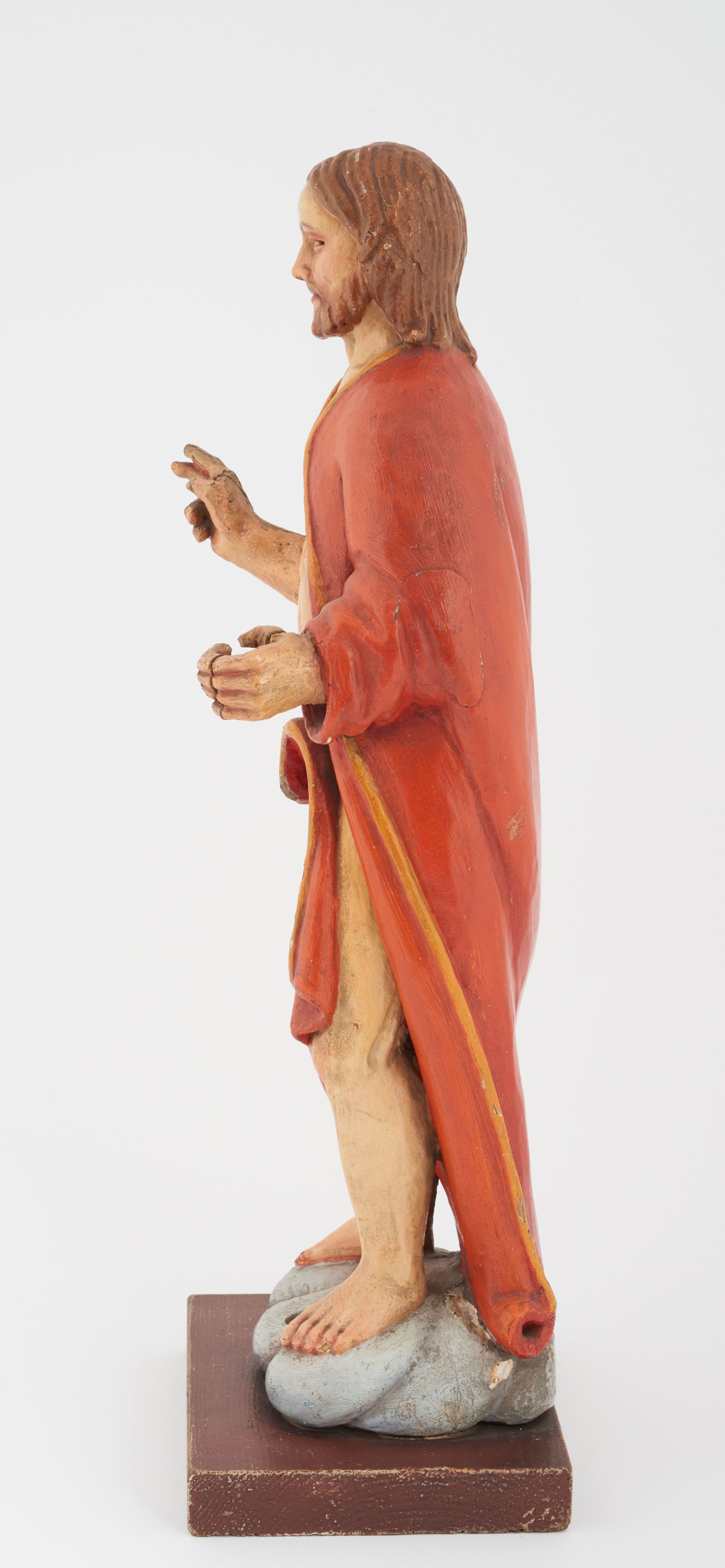 Lewa ręka nadłamana, prawa wymieniona, polichromia wtórna, w miejscu płaszcza i cokołu odspojona i uszkodzona.