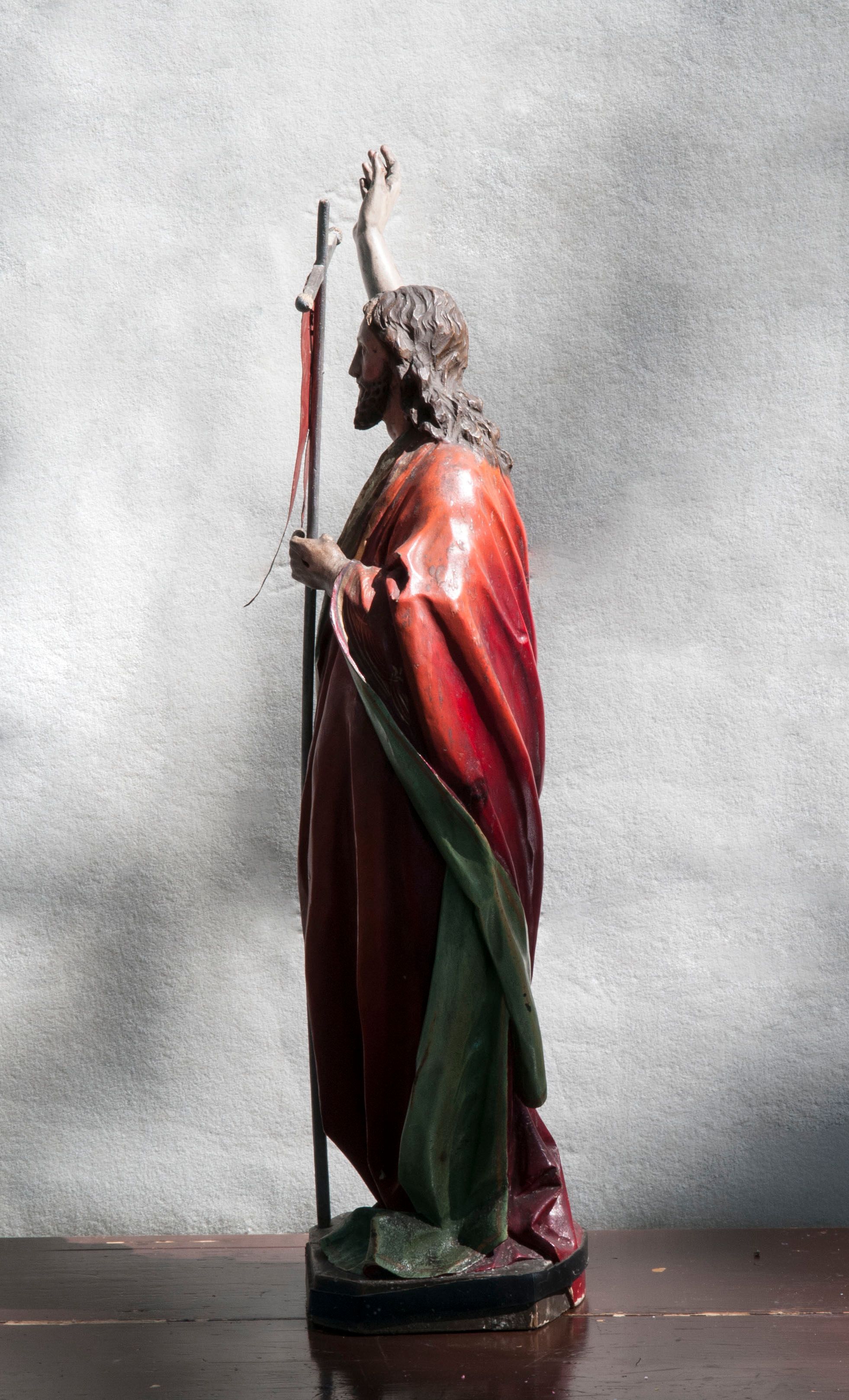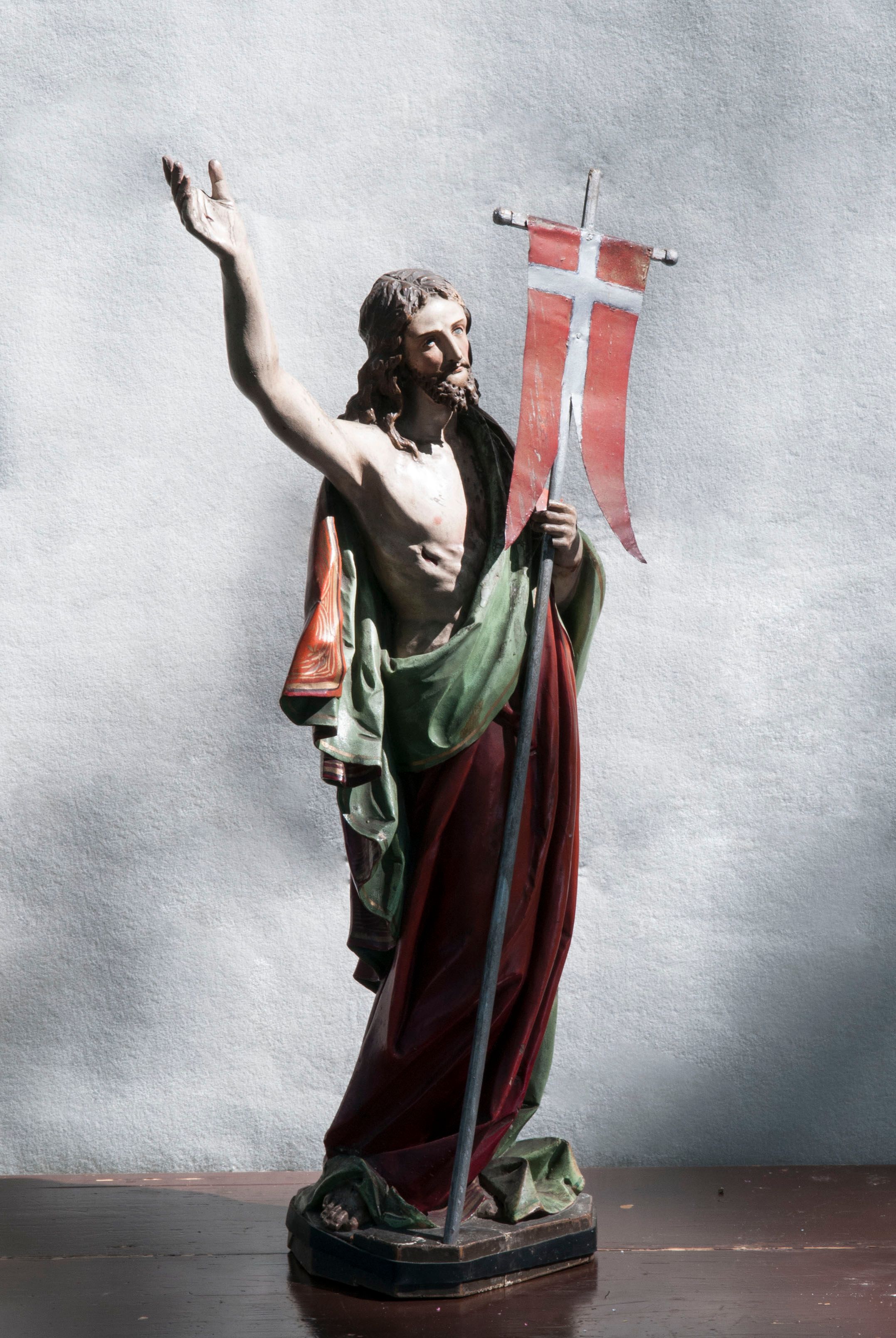 Moment zmartwychwstania Chrystusa nie został opisany w żadnej z Ewangelii, wiadomo jedynie, co stało się następnego poranka. Artyści skupiali się zatem na ukazaniu w tym przedstawieniu faktu zwycięstwa nad śmiercią. Od czasów baroku zmartwychwstały Chrystus wskazuje prawą ręką w stronę nieba i ten gest jest zapowiedzią nadchodzącego wniebowstąpienia. W drugiej ręce trzyma chorągiew triumfalną będącą właśnie znakiem jego zwycięstwa. Purpura płaszcza odnosi się do władzy, jest też ona kolorem Boga. Zestaw zastosowanych symboli świadczy o wyjątkowym znaczeniu zmartwychwstania Chrystusa dla historii religii. Figura tego typu jest używana w procesji podczas rezurekcji, po której stawia się ją na ołtarzu po lewej stronie, gdzie znajduje się do czasu Wniebowstąpienia. Rzeźba wykazuje cechy sztuki dziewiętnasto- i dwudziestowiecznej.