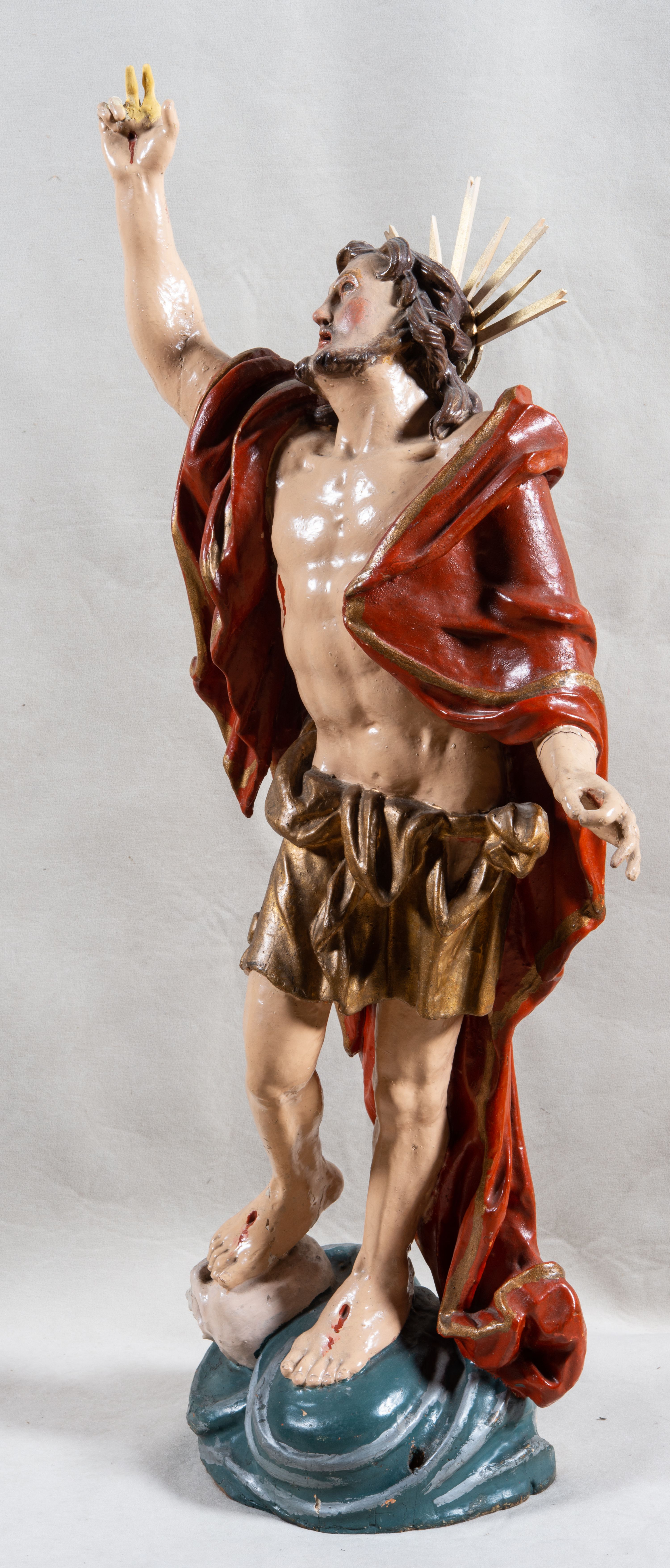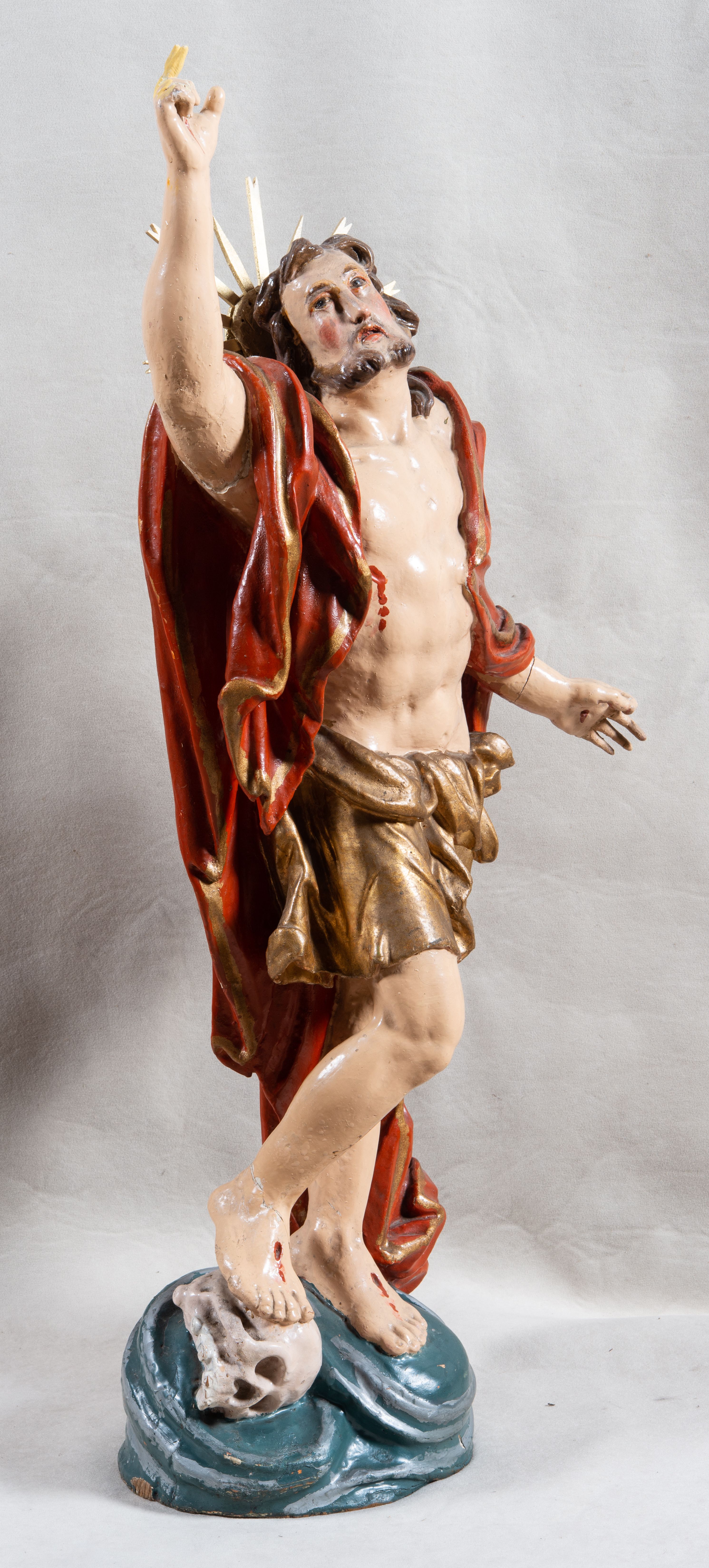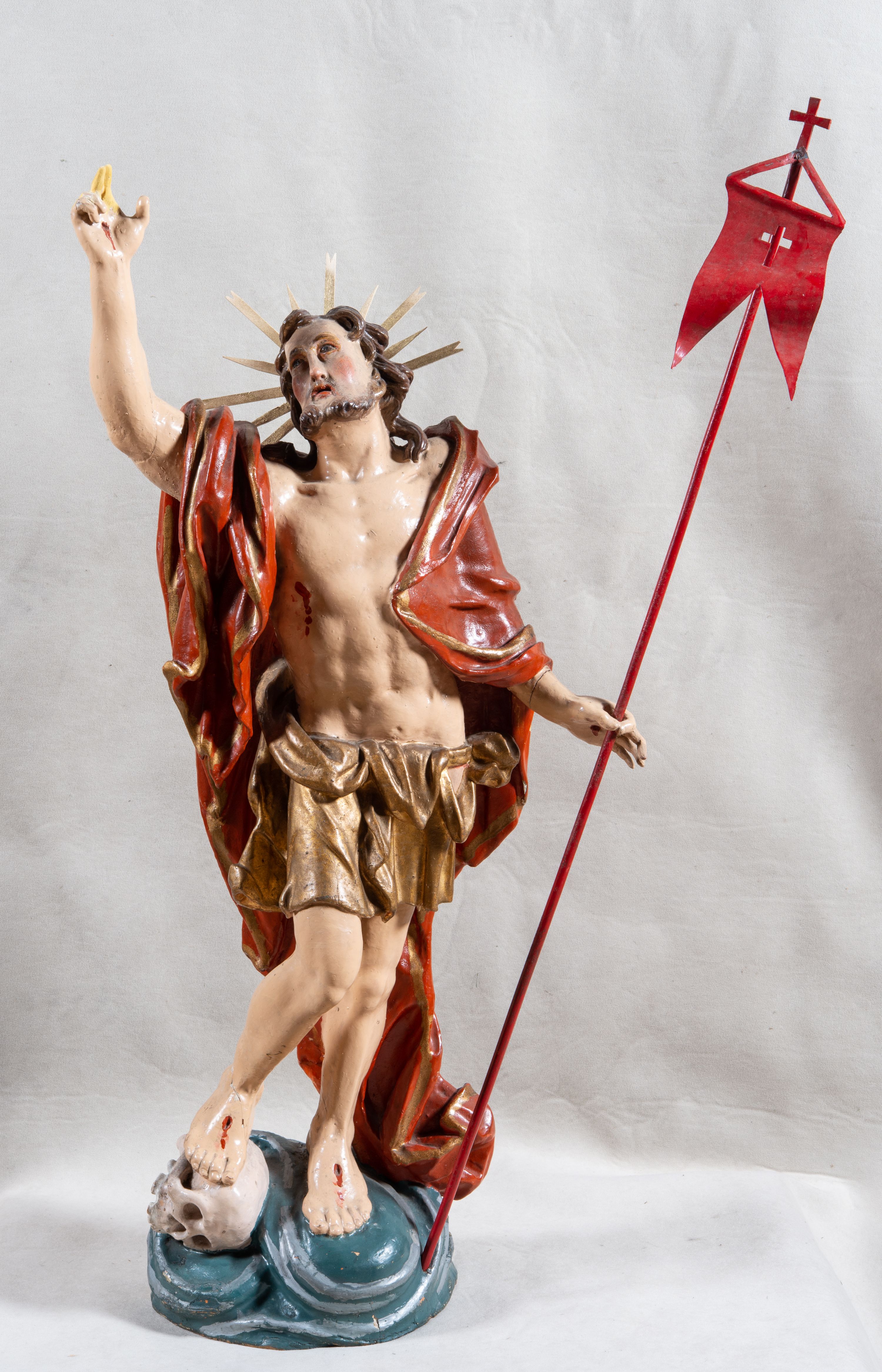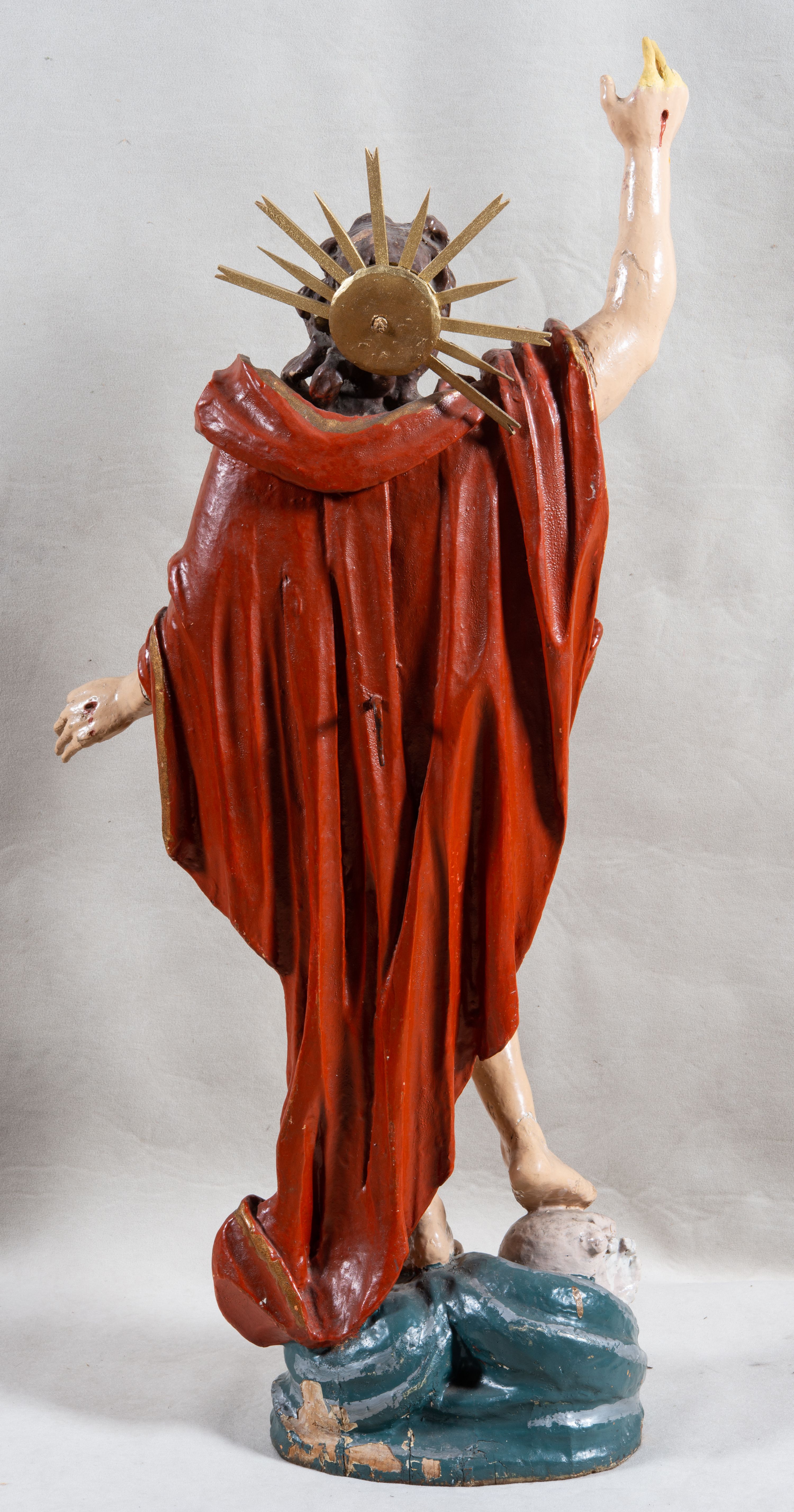 Rzeźba całopostaciowa, pełnoplastyczna, ustawiona na cokole w formie obłoku. Sylwetka Jezusa zwrócona na wprost, w wydatnym kontrapoście, z prawą nogą wspartą na leżącej na podstawie czaszce. Głowa Jezusa uniesiona, skierowana delikatnie w prawo. Twarz pociągła, o kwadratowym zarysie szczęki, o głęboko osadzonych oczach z drążonymi kącikami, zwróconych ku górze; prostym, długim nosie, rozchylonych ustach; okolona krótką kręconą brodą, układającą się w dwa pukle. Włosy długie, gęste, kręcone, układające się w wijące pasma, opadające na ramiona. Jezus w lewej ręce trzyma czerwony sztandar na drzewcu zakończonym krzyżem, prawą unosi wysoko w geście błogosławieństwa. Ciało o delikatnie zarysowanej muskulaturze z zaznaczonymi śladami męki. W partii bioder przepasany złoconym perizonium przewiązanym sznurem, sięgającym połowy uda i odsłaniającym lewe biodro; tkanina drapowana w grube fałdy, marszczona, z wywiniętym brzegiem. Na ramiona narzucony czerwony płaszcz opadający na plecy, drapowany w proste fałdy, z zawiniętym brzegiem. Głowę ujmuje gloria promienista.
