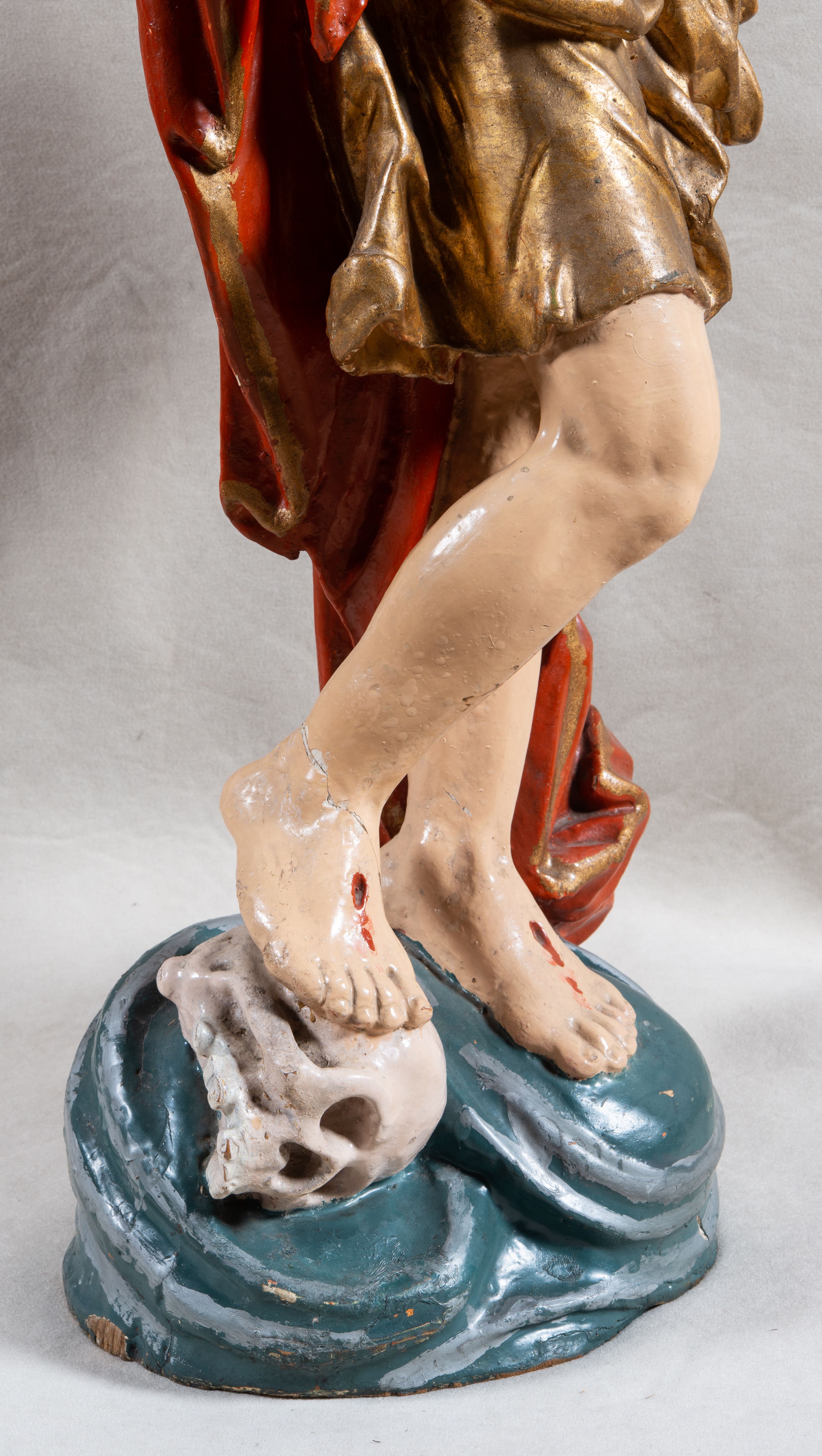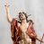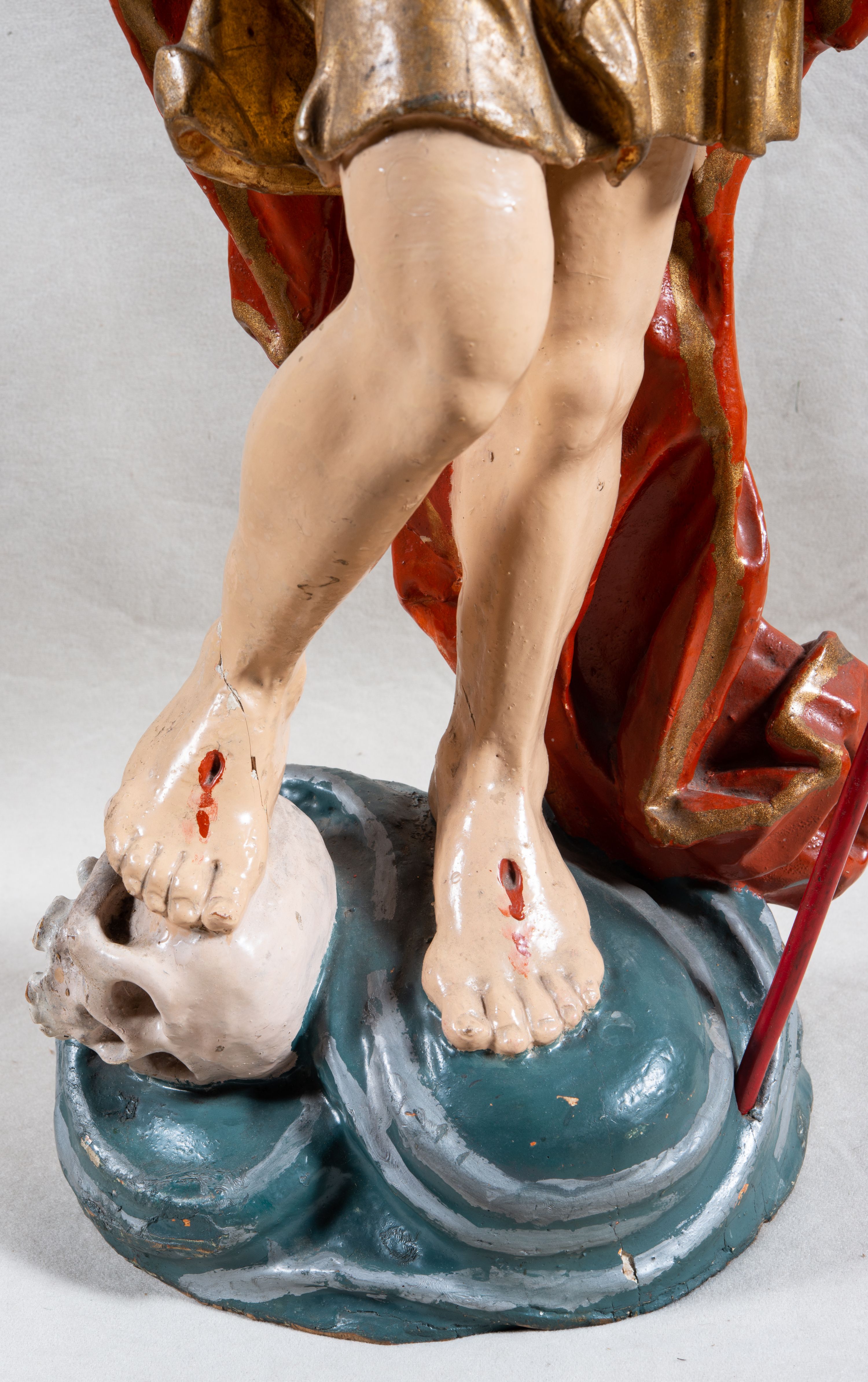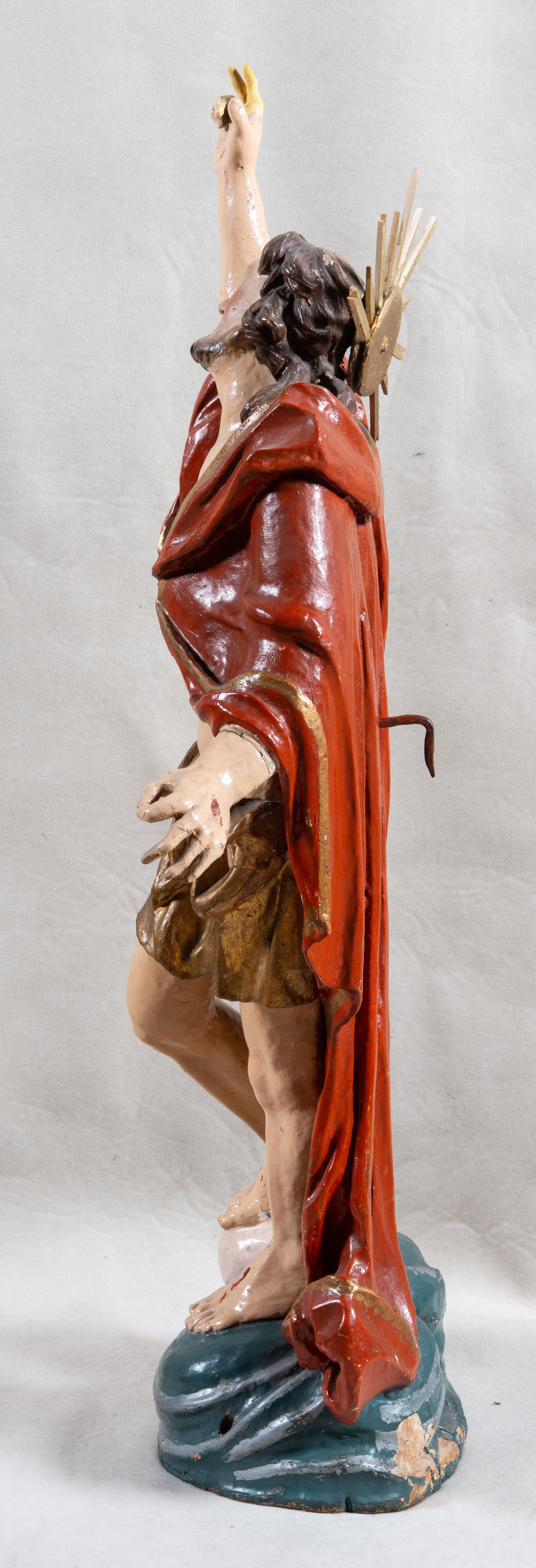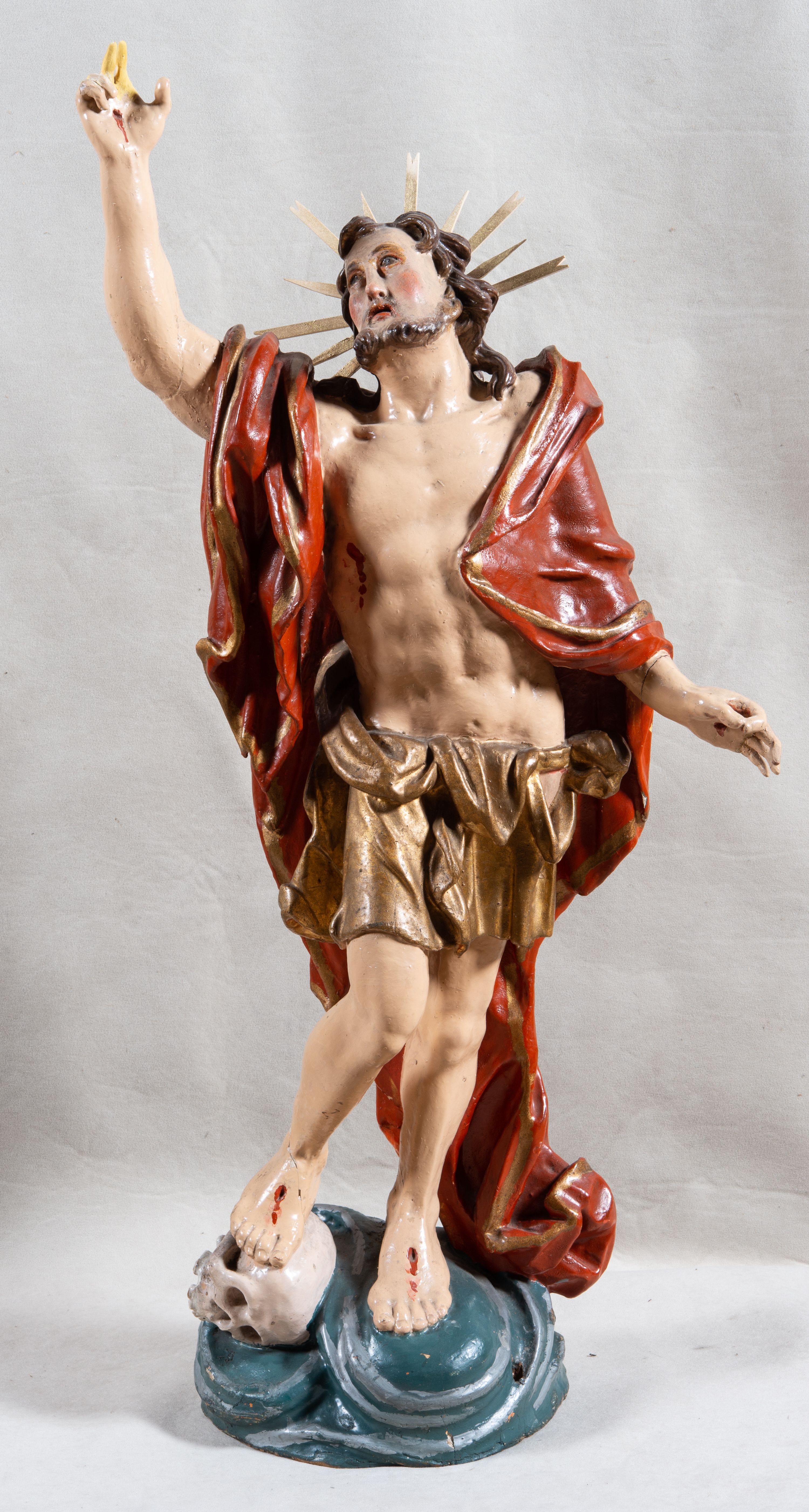 Rzeźba całopostaciowa, pełnoplastyczna, ustawiona na cokole w formie obłoku. Sylwetka Jezusa zwrócona na wprost, w wydatnym kontrapoście, z prawą nogą wspartą na leżącej na podstawie czaszce. Głowa Jezusa uniesiona, skierowana delikatnie w prawo. Twarz pociągła, o kwadratowym zarysie szczęki, o głęboko osadzonych oczach z drążonymi kącikami, zwróconych ku górze; prostym, długim nosie, rozchylonych ustach; okolona krótką kręconą brodą, układającą się w dwa pukle. Włosy długie, gęste, kręcone, układające się w wijące pasma, opadające na ramiona. Jezus w lewej ręce trzyma czerwony sztandar na drzewcu zakończonym krzyżem, prawą unosi wysoko w geście błogosławieństwa. Ciało o delikatnie zarysowanej muskulaturze z zaznaczonymi śladami męki. W partii bioder przepasany złoconym perizonium przewiązanym sznurem, sięgającym połowy uda i odsłaniającym lewe biodro; tkanina drapowana w grube fałdy, marszczona, z wywiniętym brzegiem. Na ramiona narzucony czerwony płaszcz opadający na plecy, drapowany w proste fałdy, z zawiniętym brzegiem. Głowę ujmuje gloria promienista.
