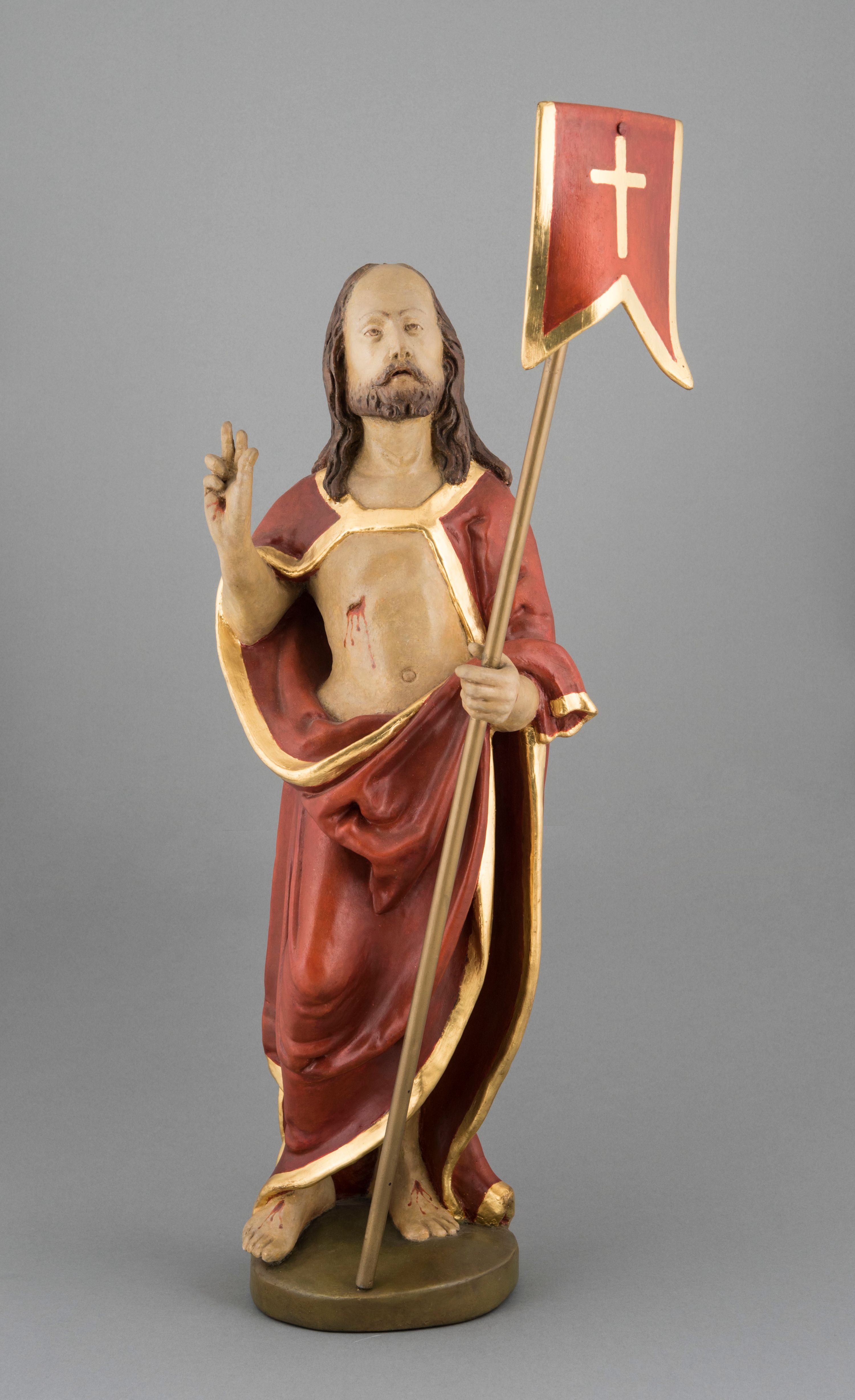 Rzeźba pełna, ustawiona na podstawie na planie nieregularnego koła przedstawia całopostaciowy wizerunek Chrystusa Zmartwychwstałego stojącego frontalnie, w kontrapoście, w lewej ręce trzymającego chorągiew paschalną, z prawą uniesioną w geście błogosławieństwa. Twarz jest szczupła, pociągła, o wysokim czole, delikatnie rzeźbionych rysach i wystających kościach policzkowych, niewielkich oczach zwróconych ku górze, prostym nosie i rozchylonych ustach, okolona krótką brodą skręconą w dwa pukle oraz falowanymi włosami opadającymi na ramiona. Jezus ubrany jest w czerwony płaszcz ze złotą lamówką, odsłaniający tors, zapięty na piersi, opadający na ramiona i plecy, zarzucony z przodu na lewe przedramię, przesłaniając partie nóg. Ciało jest szczupłe, o delikatnym modelunku z zaznaczonymi śladami męki. Polichromia naturalistyczna.