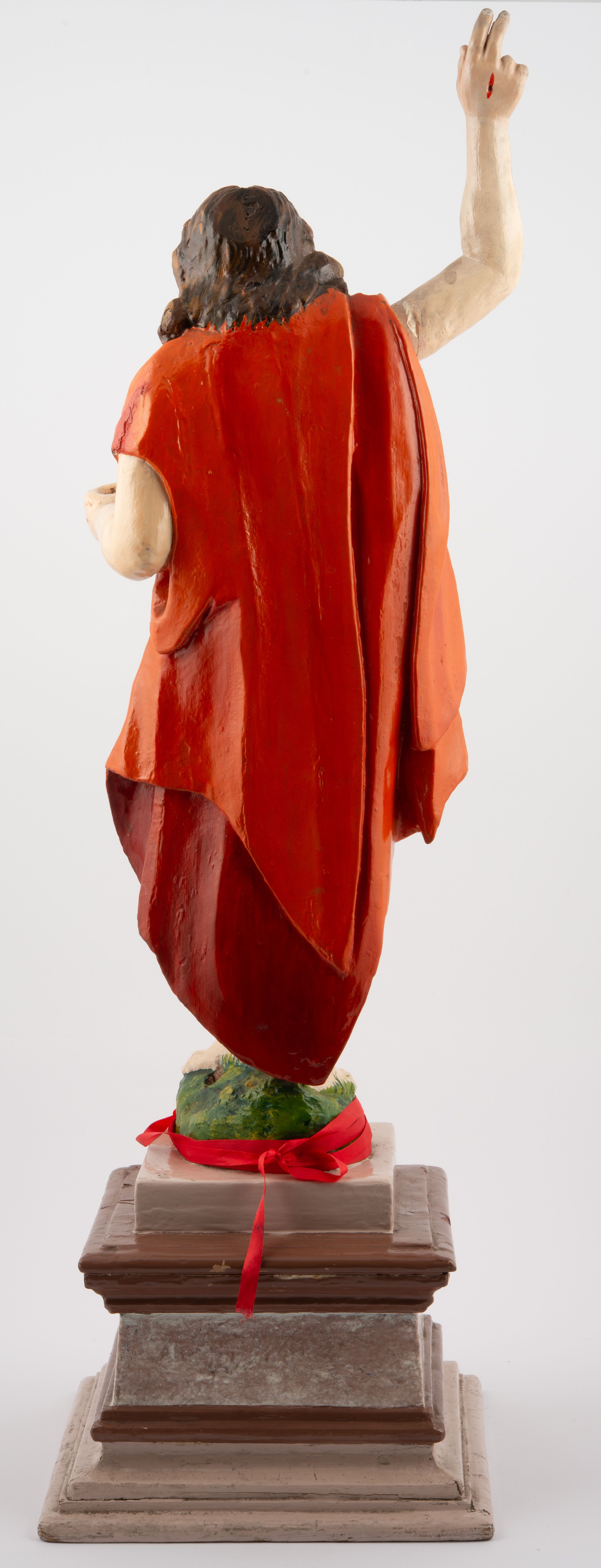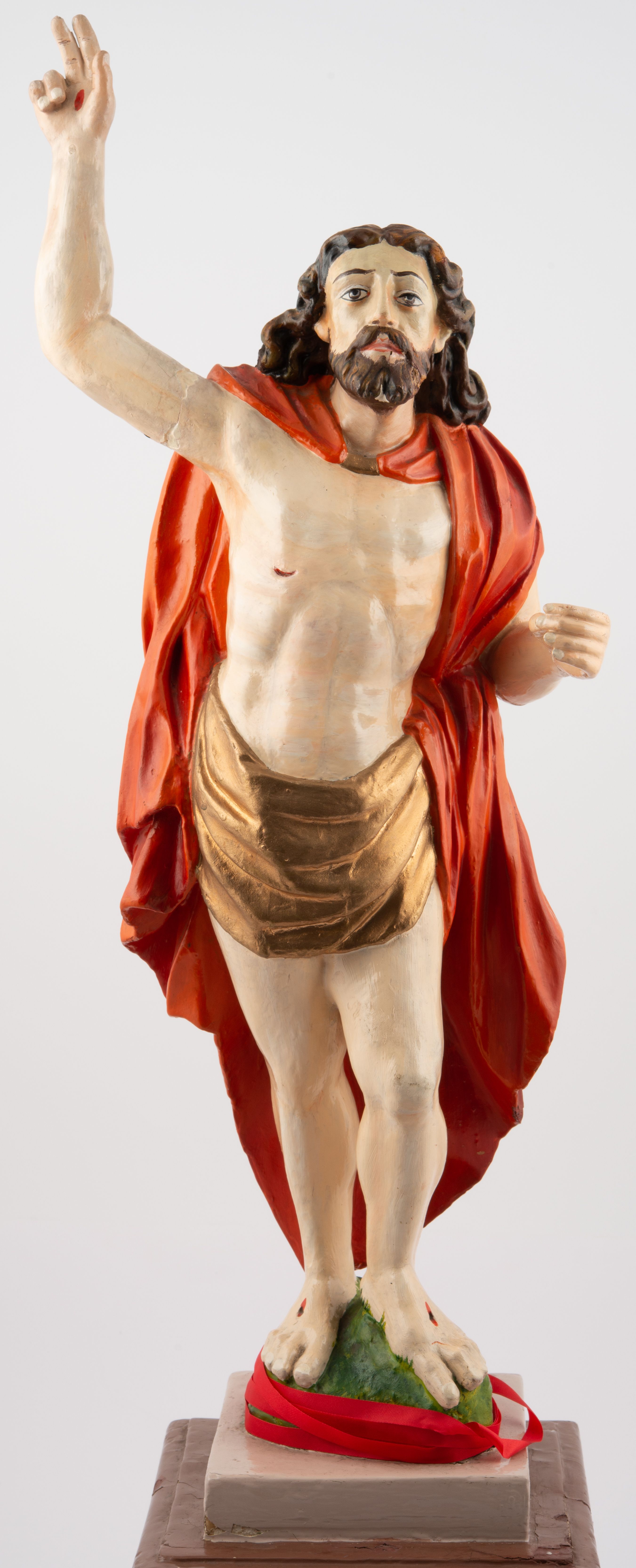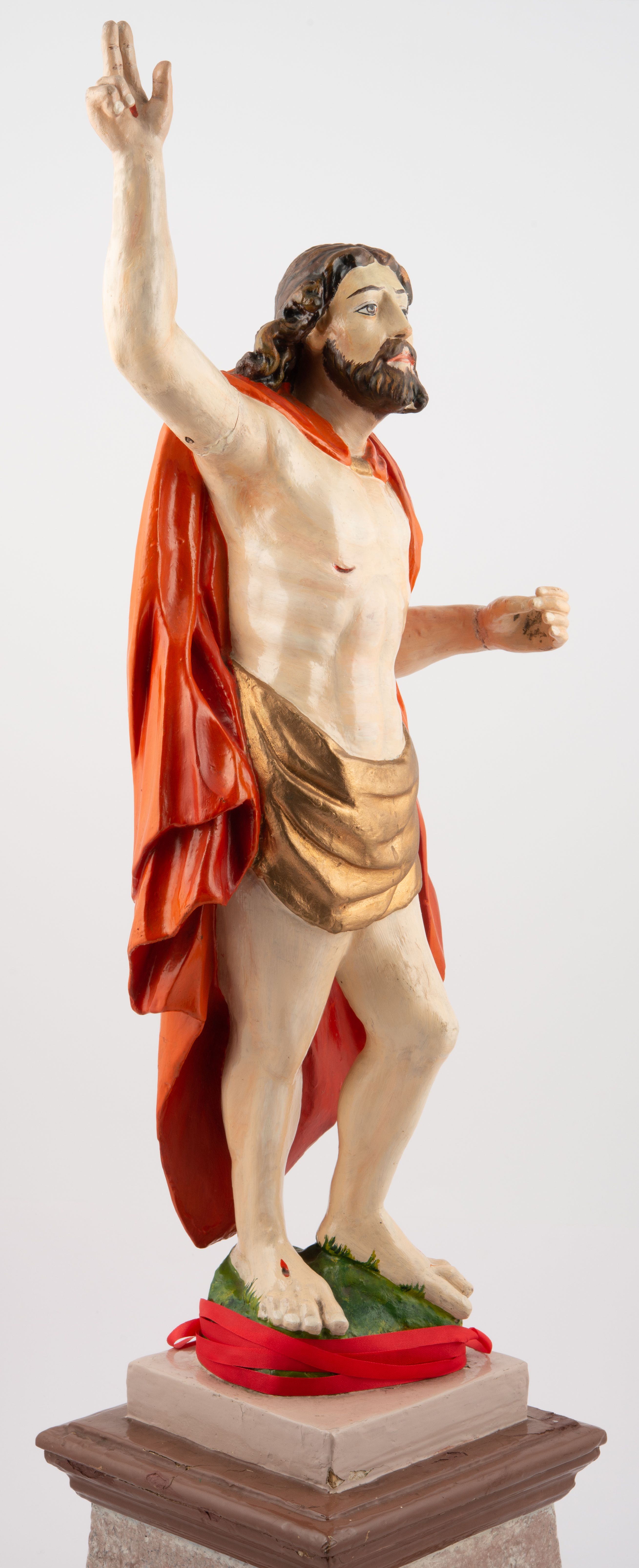 Rzeźba pełnoplastyczna, z tyłu opracowana, ustawiona na niewysokim cokole. Postać zwrócona frontalnie do widza, w kontrapoście, o esowato wygiętej sylwetce. W lewej ręce trzymał chorągiew, prawą unosi wysoko do góry w geście błogosławieństwa. Ciało o wyraźnie rzeźbionej muskulaturze z zaznaczonymi śladami męki. Twarz szczupła, o podkreślonej linii kości policzkowych i długim, prostym nosie, z dużymi oczami. Twarz okolona zarostem, włosy długie, gęste, z przedziałkiem na środku głowy, opadające na plecy. Przez biodra przepasane złote perizonium; pod szyją zapięty czerwony płaszcz opadający na plecy i lewe ramię. Karnacja ciała naturalistyczna, perizonium złocone.