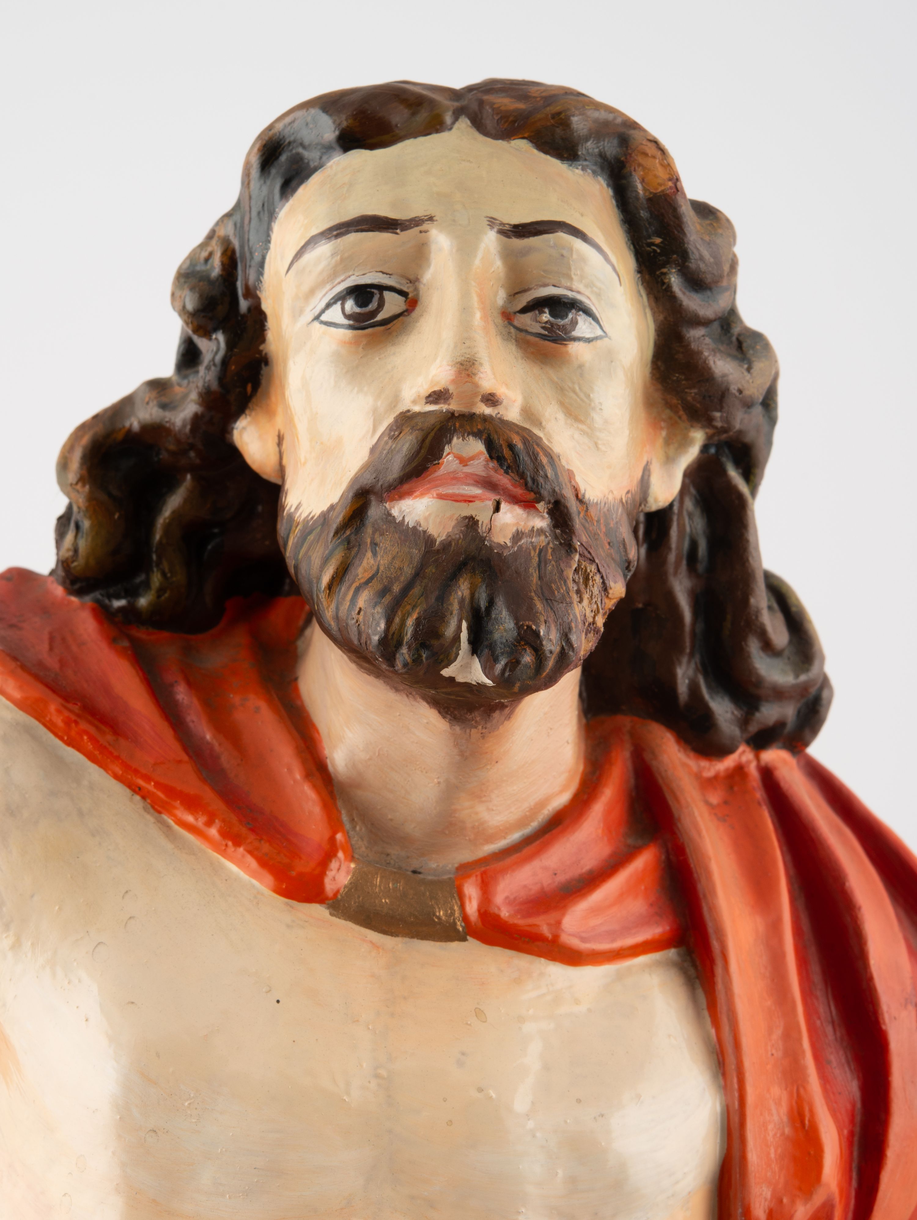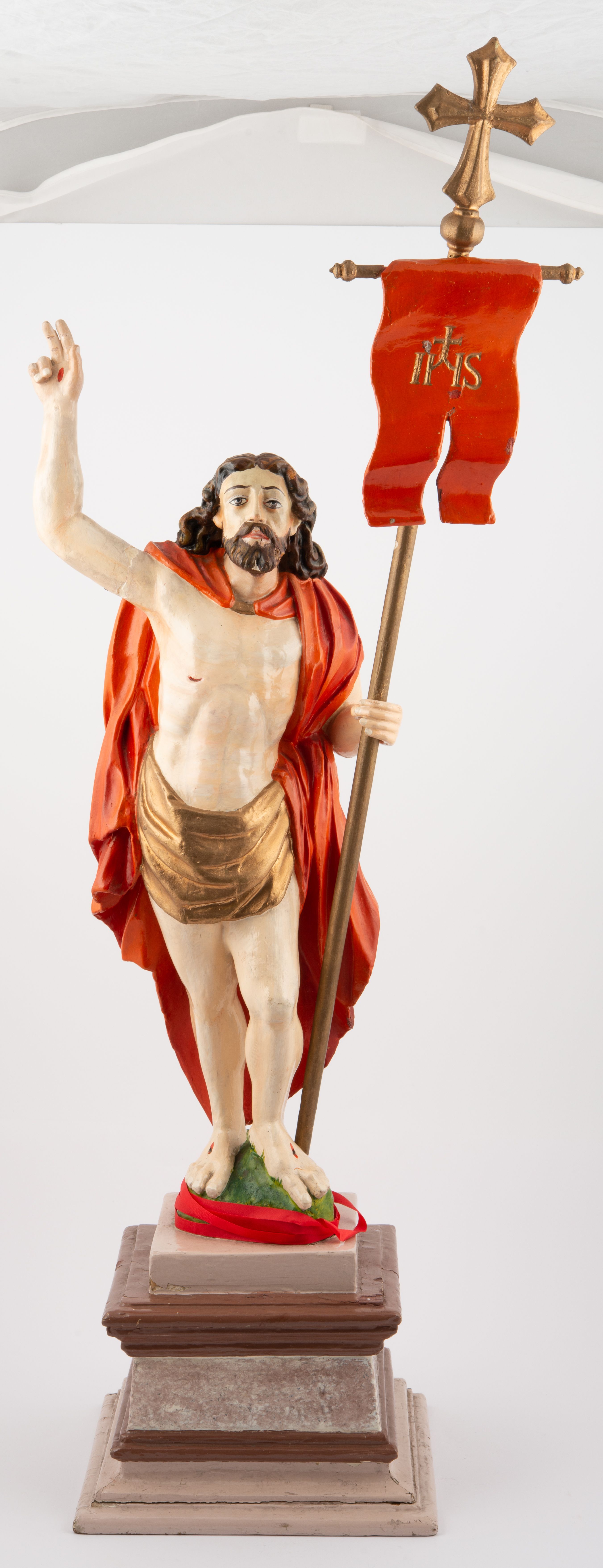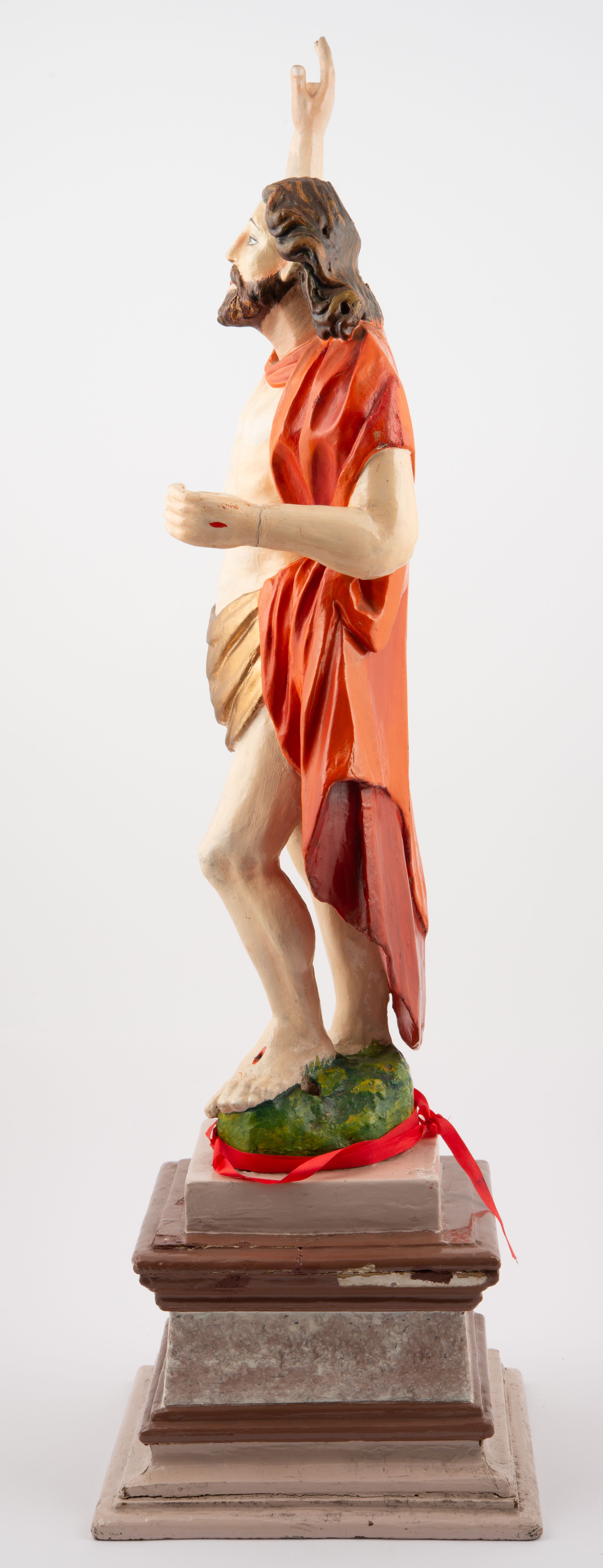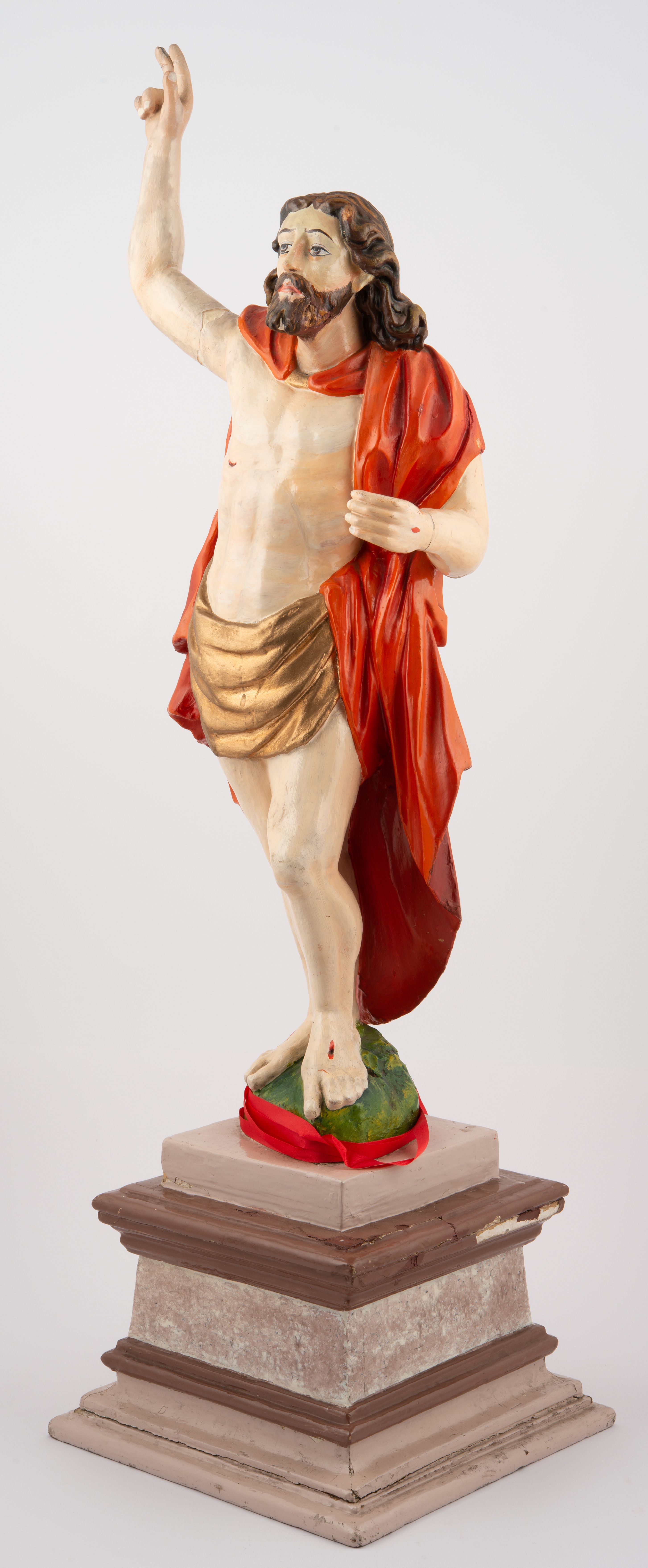 Rzeźba pełnoplastyczna, z tyłu opracowana, ustawiona na niewysokim cokole. Postać zwrócona frontalnie do widza, w kontrapoście, o esowato wygiętej sylwetce. W lewej ręce trzymał chorągiew, prawą unosi wysoko do góry w geście błogosławieństwa. Ciało o wyraźnie rzeźbionej muskulaturze z zaznaczonymi śladami męki. Twarz szczupła, o podkreślonej linii kości policzkowych i długim, prostym nosie, z dużymi oczami. Twarz okolona zarostem, włosy długie, gęste, z przedziałkiem na środku głowy, opadające na plecy. Przez biodra przepasane złote perizonium; pod szyją zapięty czerwony płaszcz opadający na plecy i lewe ramię. Karnacja ciała naturalistyczna, perizonium złocone.
