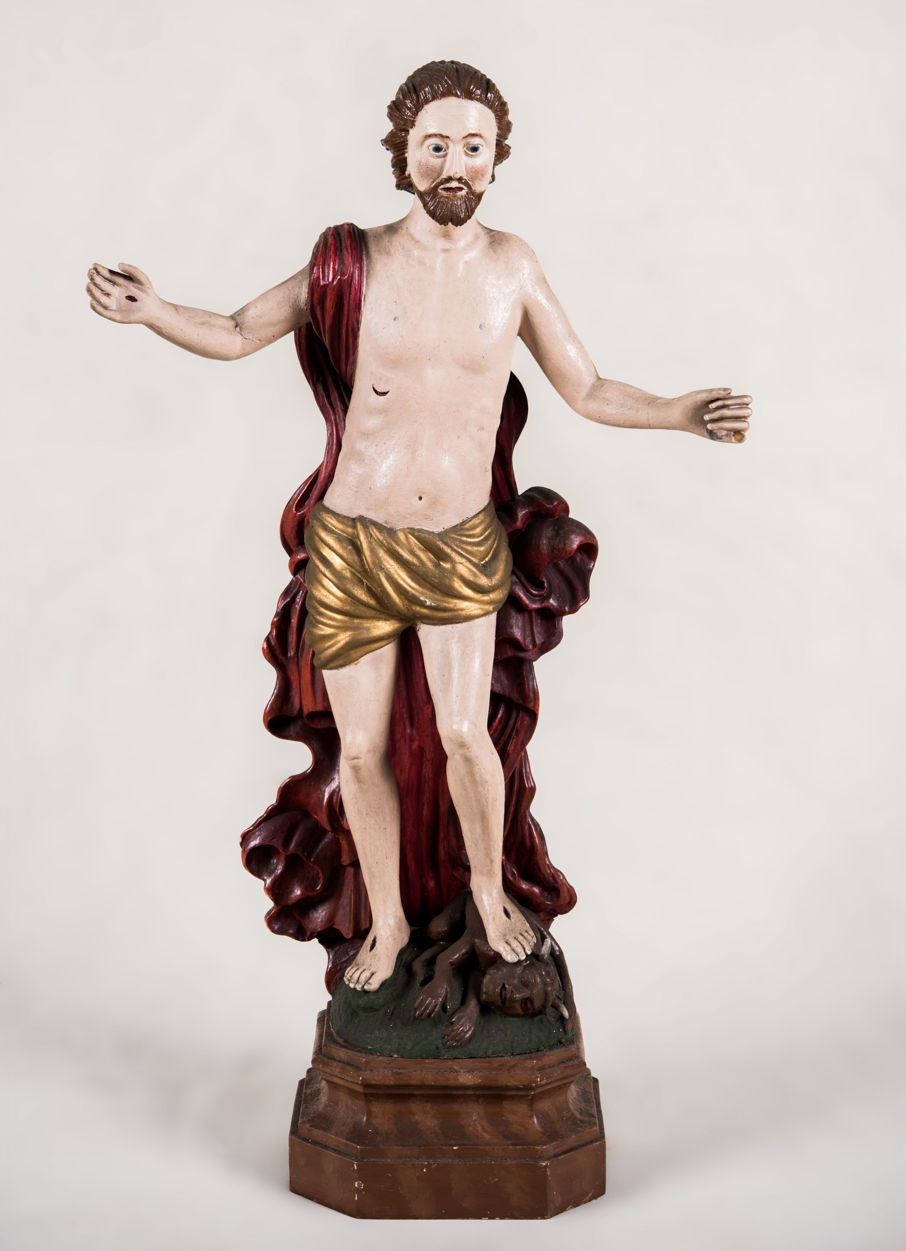 Na wpółludowa rzeźba Chrystusa Zmartwychwstałego z drugiej połowy XIX wieku przynależy do grupy wizerunków wielkanocnych, które były niezbędne na wyposażeniu każdego kościoła czy też kaplicy. Mimo znajdującego się na podstawie napisu informującego, iż figura miałaby powstać jako dzieło księdza Roberta Pioteckiego w 1615 roku, jest to informacja mylna, co potwierdzają cechy formalne przedstawienia.