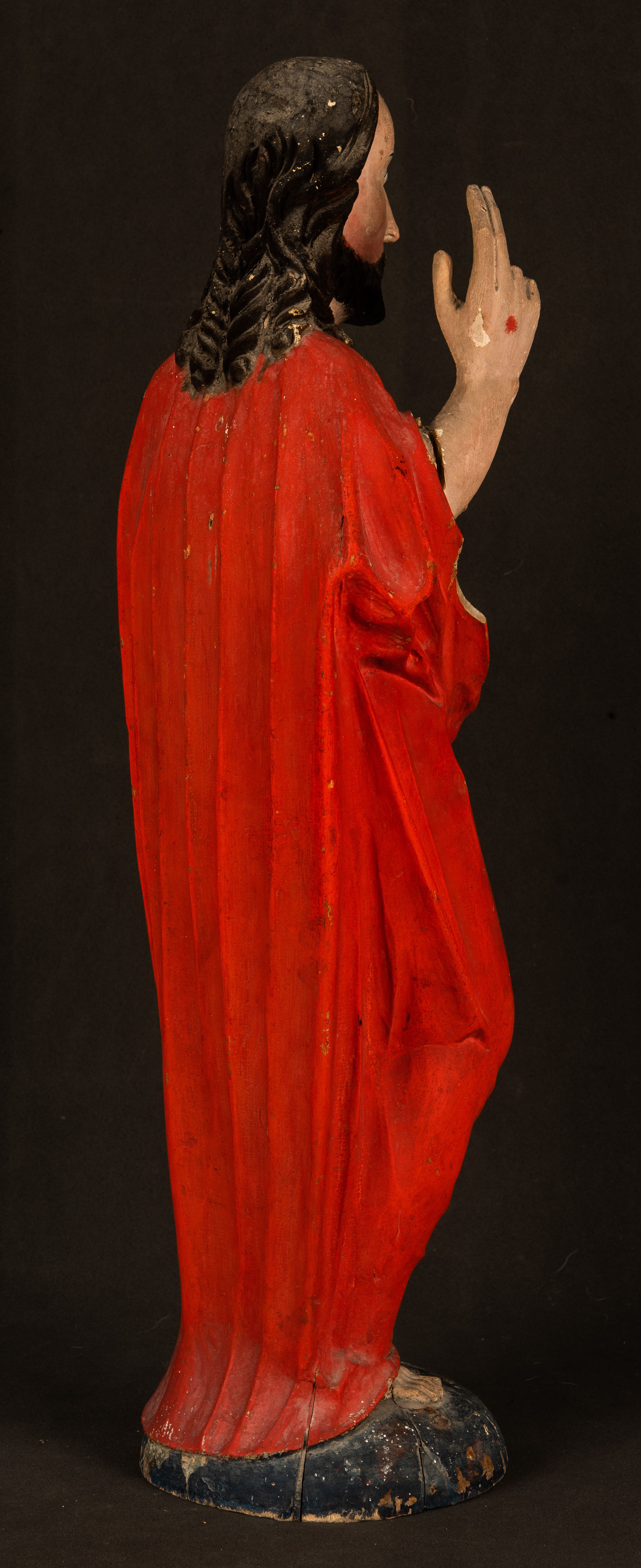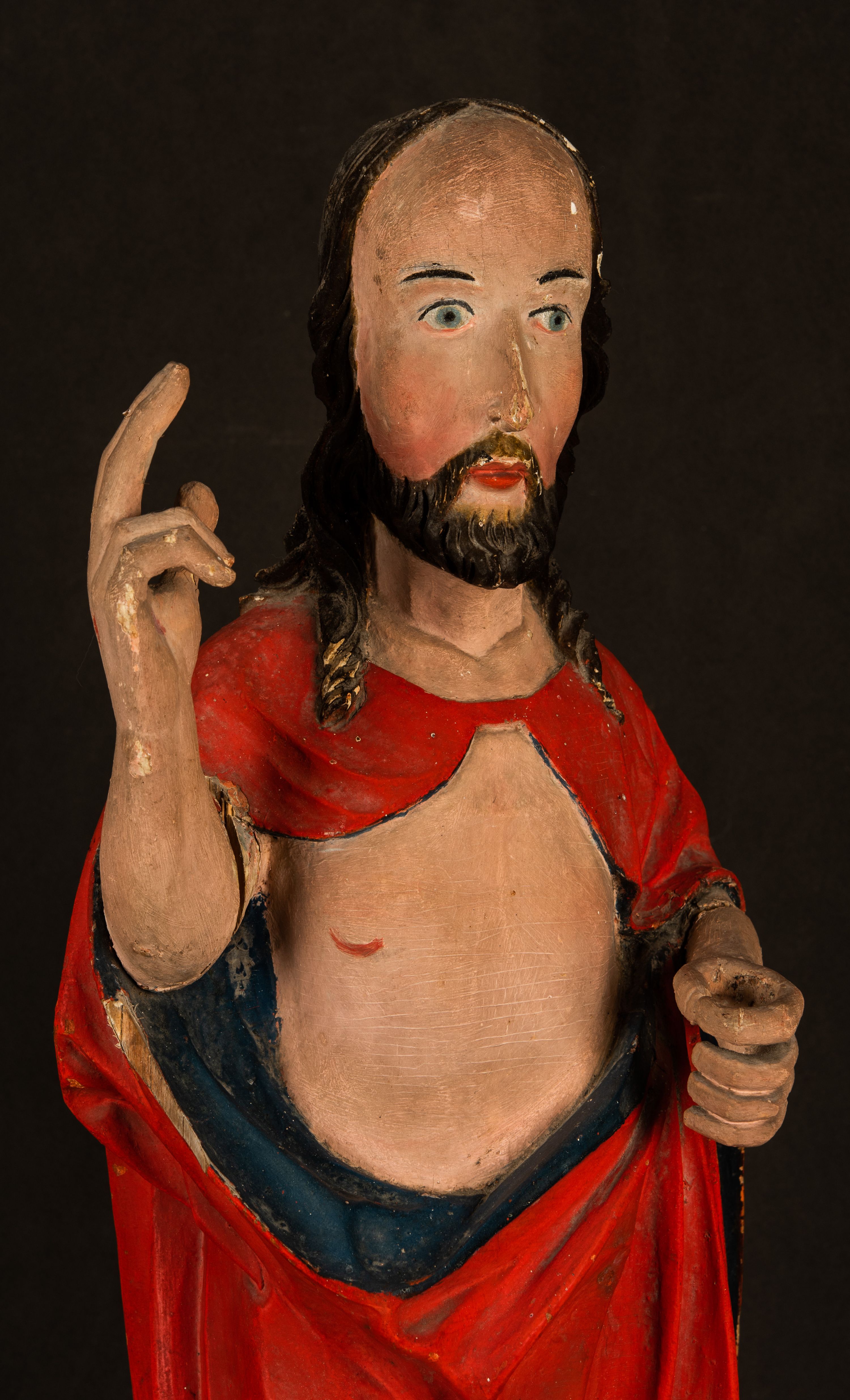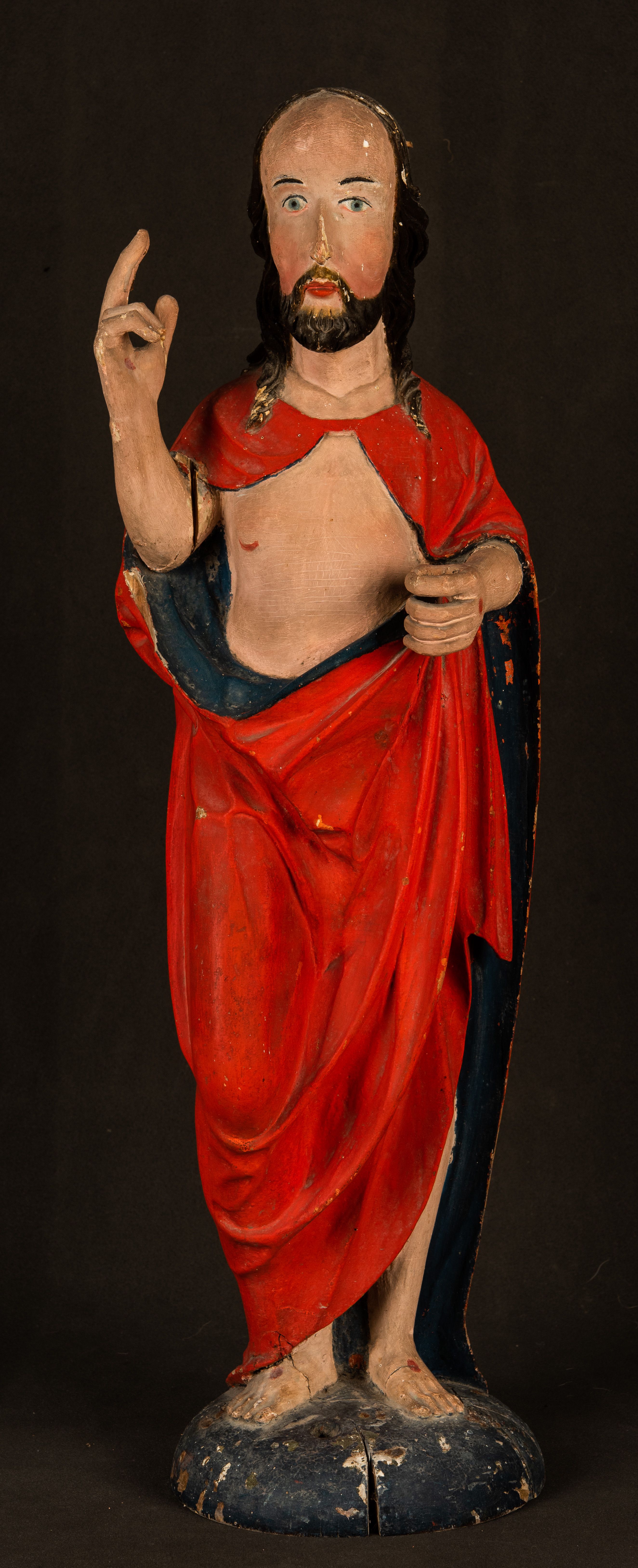 Rzeźba pełnoplastyczna, z tyłu opracowana. Chrystus, ukazany w całej postaci, frontalnie, stoi i na niewysokiej wypukłej podstawie, w kontrapoście, z prawą nogą ugiętą w kolanie. Ręce ugięte w łokciach, prawą błogosławi, lewą podtrzymuje połę płaszcza i zapewne niezachowane drzewce chorągwi. Głowa wydłużona, z wysokim czołem okolona krótkim zarostem i długimi ciemnymi włosami spływającymi w puklach na barki i plecy. Twarz pociągła, z wąskim nosem i małymi ustami. Ciało nagie, o jasnej karnacji, z ranami na dłoniach, stopach i w prawym boku, okryte perizonium oraz długim, sięgającym do ziemi, czerwonym płaszczem z niebieską podszewką, narzuconym na ramiona, spiętym pod szyją i z prawą połą przerzuconą przez przód postaci; pod prawą ręką okazały fałd muszlowy.