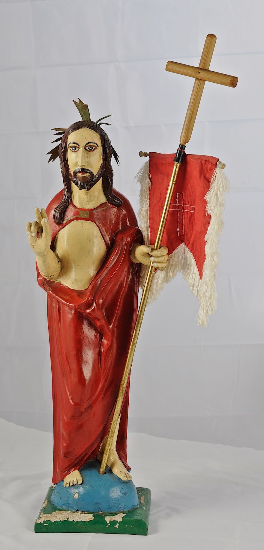 Figura pełnoplastyczna ustawiona na podstawie na planie kwadratu oraz na półkuli. Chrystus stoi frontalnie, w kontrapoście, w lewej ręce trzyma drzewce chorągwi zakończone krzyżem, prawą unosi w geście błogosławieństwa. Jego twarz jest pociągła, o długim, prostym nosie, migdałowatych oczach i niewielkich ustach, okolona krótką brodą i długimi włosami opadającymi na ramiona i plecy. Z tyłu jego głowy jest dosztukowany nimb promienisty. Chrystus ubrany jest w czerwony płaszcz odsłaniający tors, zapięty na piersi, mocno pofałdowany na wysokości bioder, otaczający postać i przerzucony przez lewe przedramię. Polichromia naturalistyczna, drzewce chorągwi pozłacane.