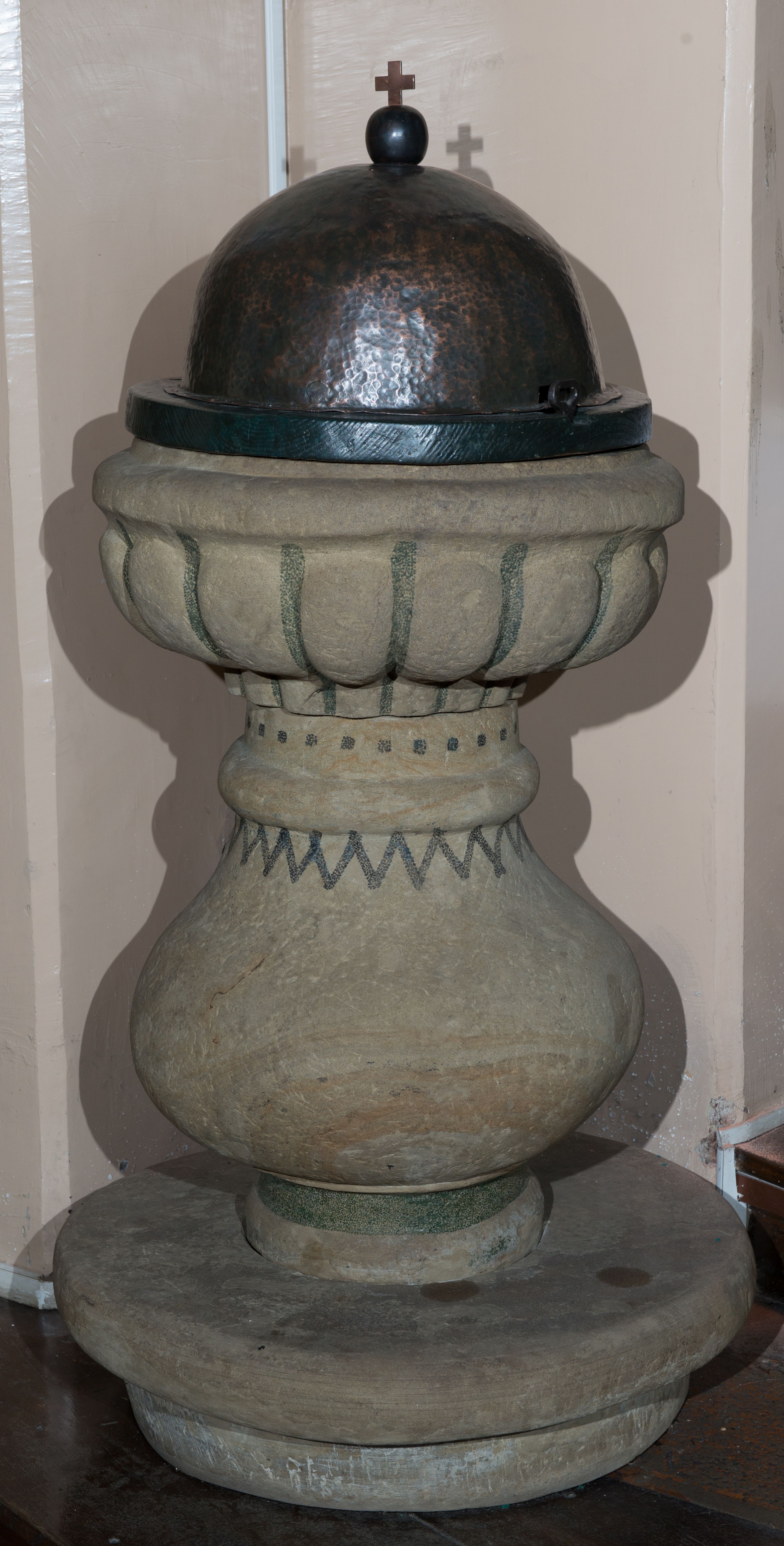 Kamienna chrzcielnica na kolistej stopie. Trzon w dolnej partii w formie półwałka przechodzący w gruszkowy nodus zwieńczony półwałkiem. Czara w kształcie spłaszczonej półkuli, z półkoliście formowanym wylewem, zdobiona motywem puklowania. Nodus w górnej partii zdobiony malowanym, czarnym zygzakiem, górna partia trzonu z motywem czarnych kropek. Pokrywa blaszana w kształcie półkulistym z okrągłym, drewnianym kołnierzem, zwieńczona kulą z krzyżem równoramiennym. Wewnątrz kociołek z miedzianej, kutej blachy, z blaszaną pokrywą.