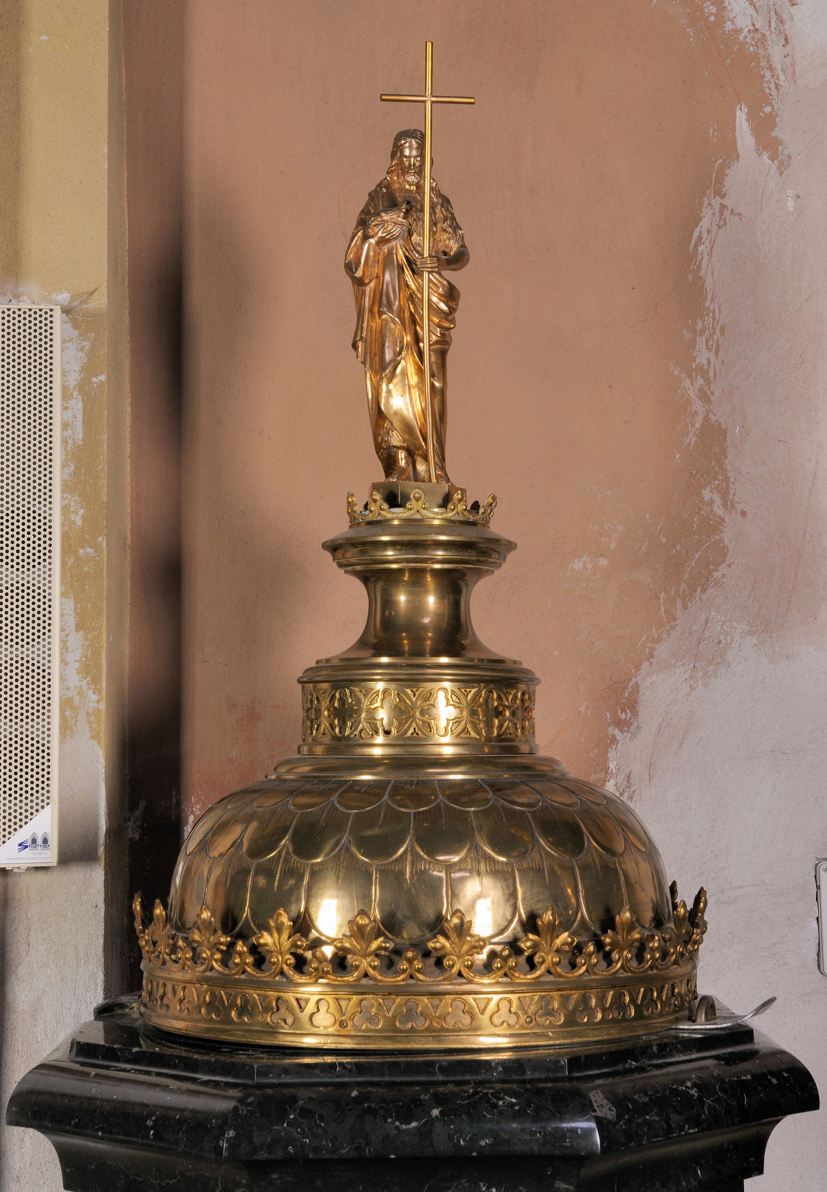 Podstawa na rzucie ośmioboku, dwuczęściowa, dolna część szeroka i niska o fazowanych krawędziach, górna wysoka i wąska. Trzon gładki, gruszkowaty, ujęty dwoma pierścieniami. Czara w dolnej części półkulista i gładka, w górnej ośmioboczna, zdobiona wgłębnymi ślepymi maswerkami, zakończona wydatnym, profilowanym gzymsem. Pokrywa metalowa, pozłacana. Brzeg w formie korony, zdobiony maswerkami oraz koronką w formie przestylizowanych lilii. Czasza półkulista zdobiona łuskami, zwieńczona cylindrycznym postumentem z dolną częścią zdobioną maswerkami, środkową w kształcie gładkiej wklęski i i górną, profilowaną z niewielką koronką. Na nim, na ośmiobocznym cokoliku, pełnoplastyczna postać św. Jana Chrzciciela z krzyżem w lewej ręce i barankiem leżącym na księdze w prawej. Jego twarz jest pociągła, święty spogląda w dół, ma długie włosy, opadające na plecy i ramiona. Jest ubrany w wielbłądzią skórę i płaszcz zarzucony na prawym ramieniu.