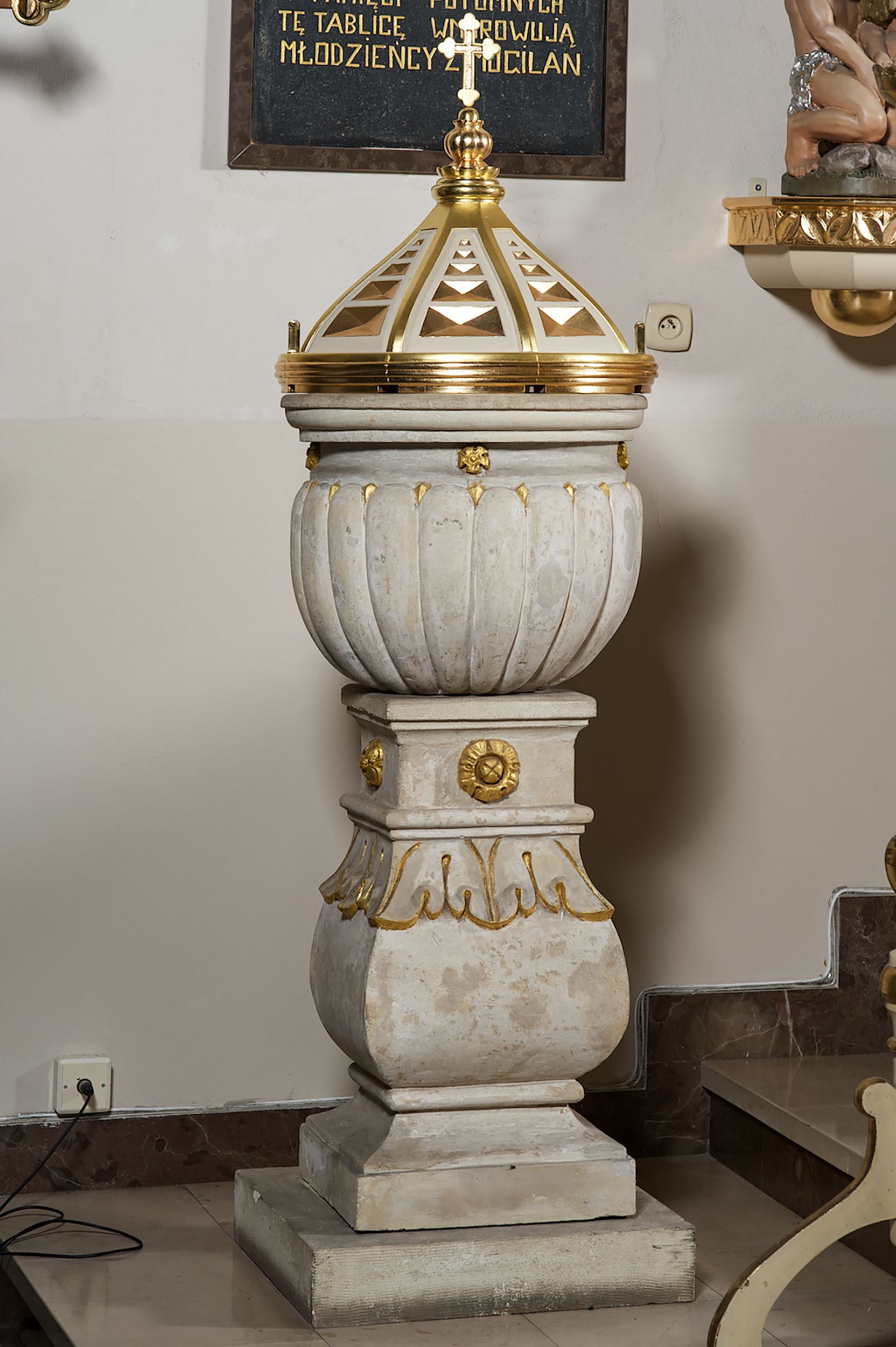 Pochodząca z początku XVII wieku kamienna chrzcielnica została wykonana najpewniej w pińczowskim warsztacie Santi Gucciego.