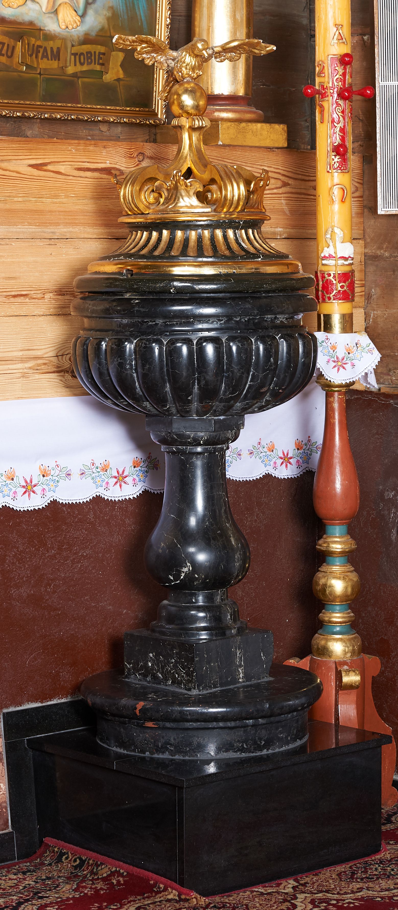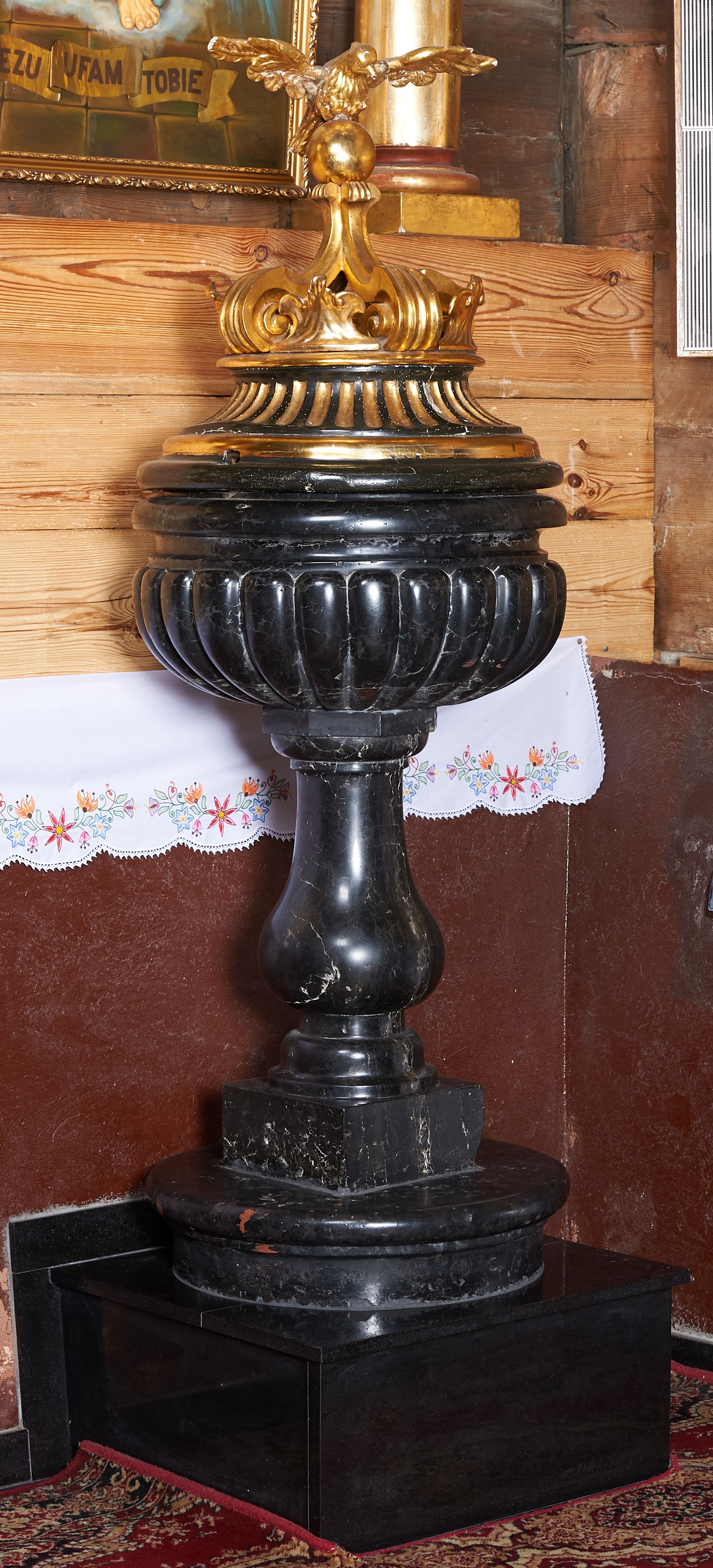 Chrzcielnica wykonana z czarnego marmuru w jednym z najważniejszych ośrodków kamieniarskich w Dębniku koło Krakowa zapewne w drugiej połowie XVII wieku.